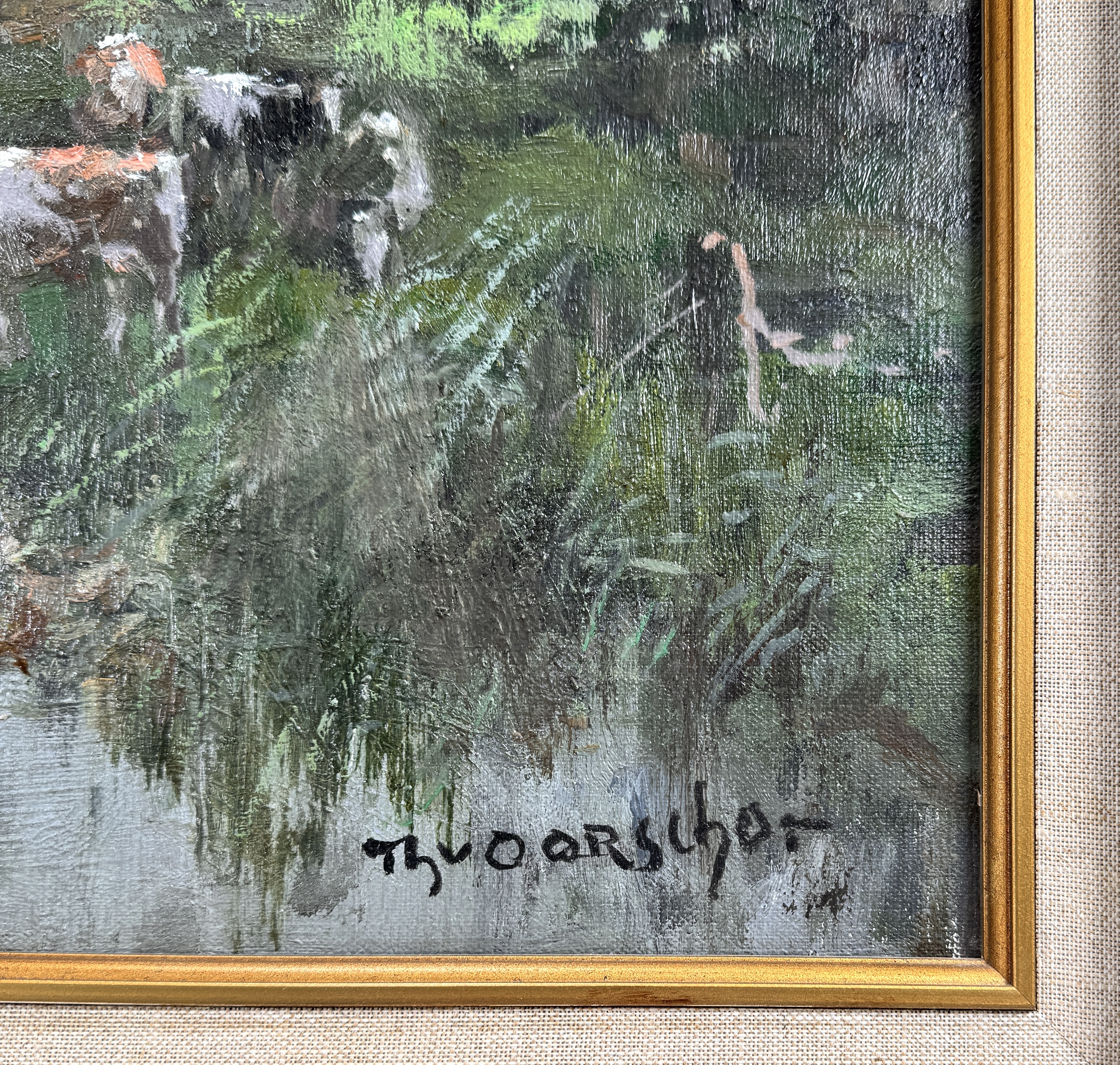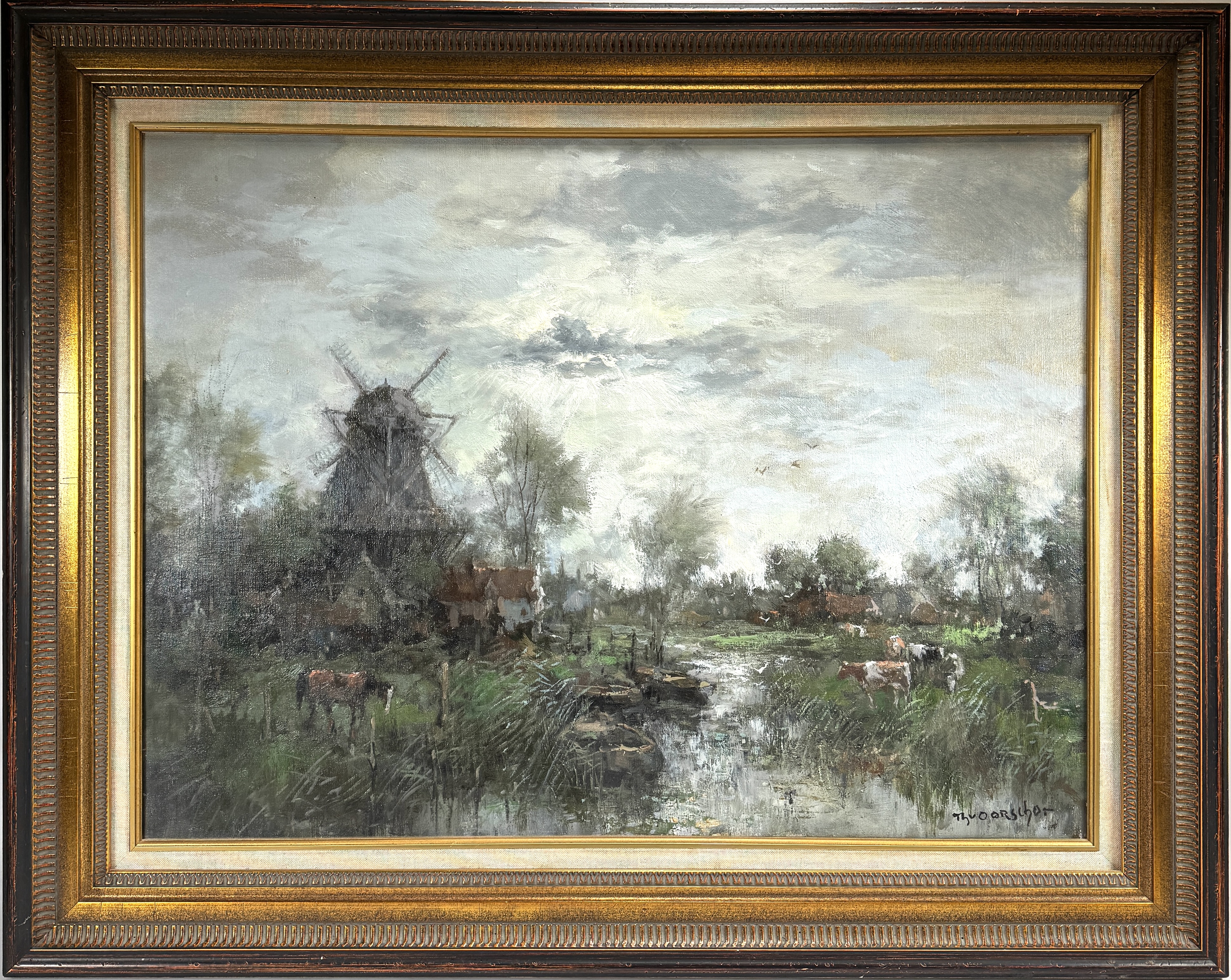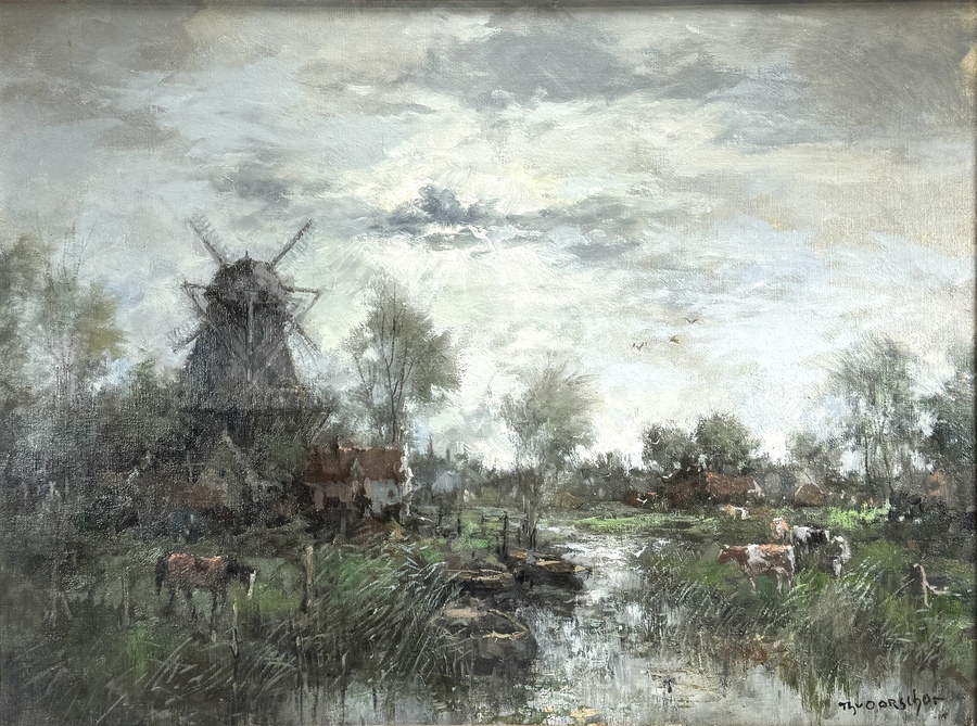Schilderij door Theodorus van Oorschot (1910–1989) toont een polderlandschap met molen en grazende koeien in impressionistische stijl, uitgevoerd in olieverf op doek. De compositie kenmerkt zich door een wolkenpartij en pasteuze penseelvoering. Rechtsonder gesigneerd, het werk dateert uit de twintigste eeuw en heeft een Nederlandse herkomst. Klaar om te bieden? Registreer je nu en doe mee aan de veiling! |