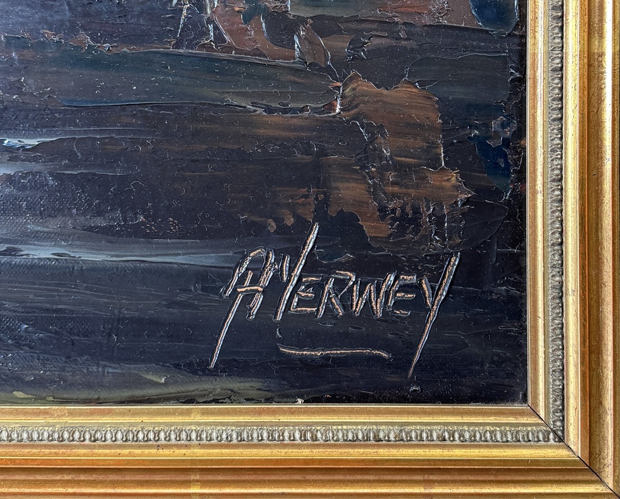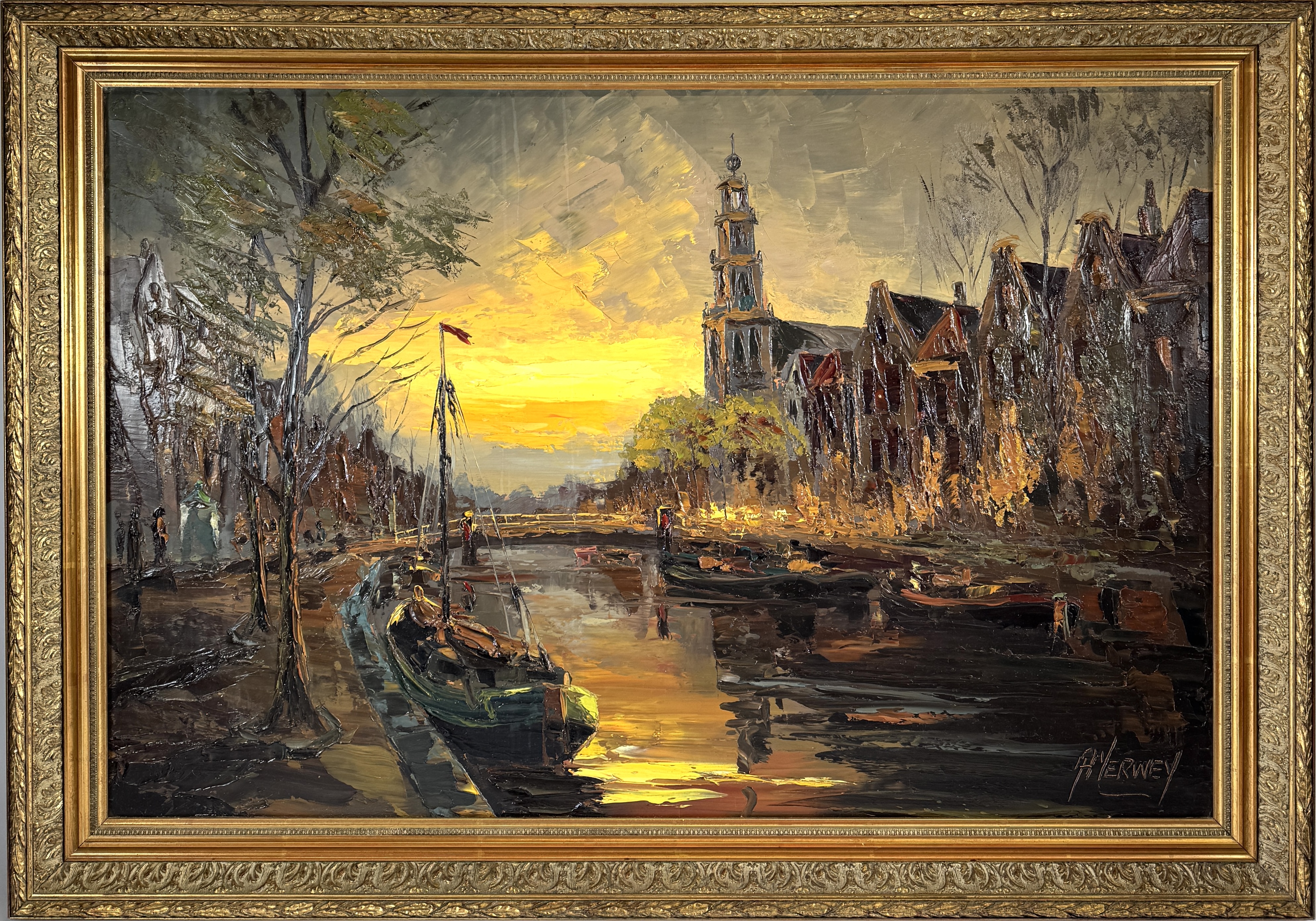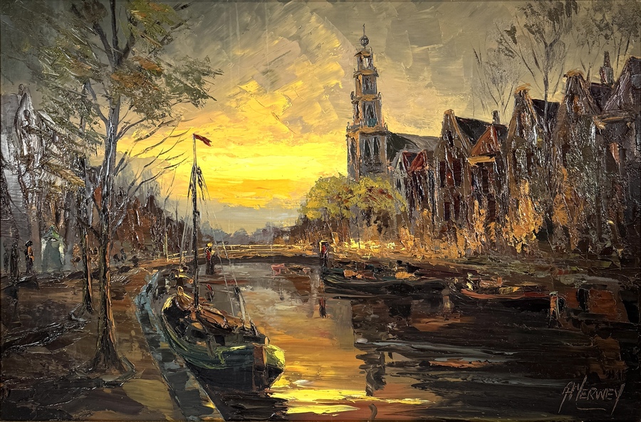 Schilderij door A. Verwey toont een Amsterdams stadsgezicht met de Westerkerk in impressionistische stijl, uitgevoerd in olieverf op doek. De compositie toont de Prinsengracht bij zonsondergang met een tjalk op de voorgrond. Rechtsonder gesigneerd, het werk dateert uit circa 1950 en heeft een Nederlandse herkomst. Voorzien van goudkleurige lijst. Dit schilderij zelf beoordelen? Je bent welkom op onze kijkdagen op 10, 11 en 12 april! |