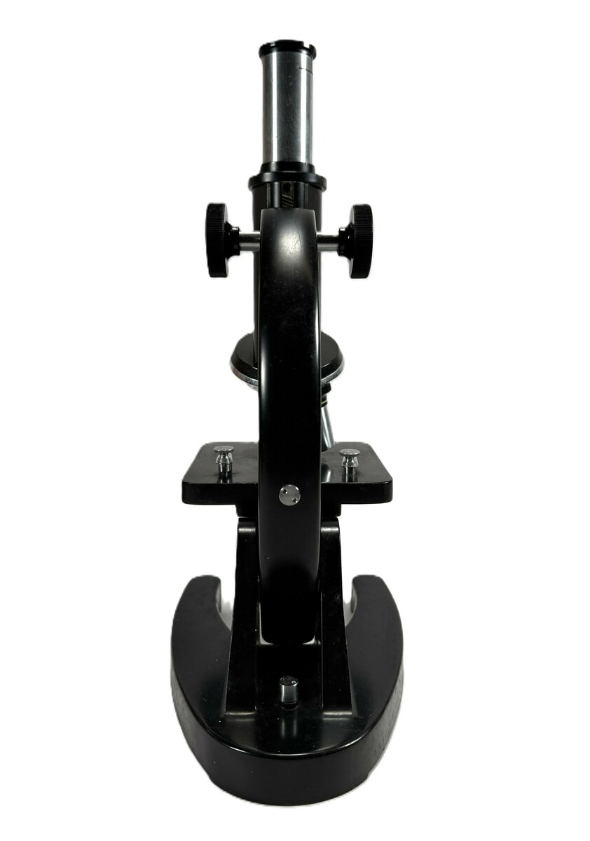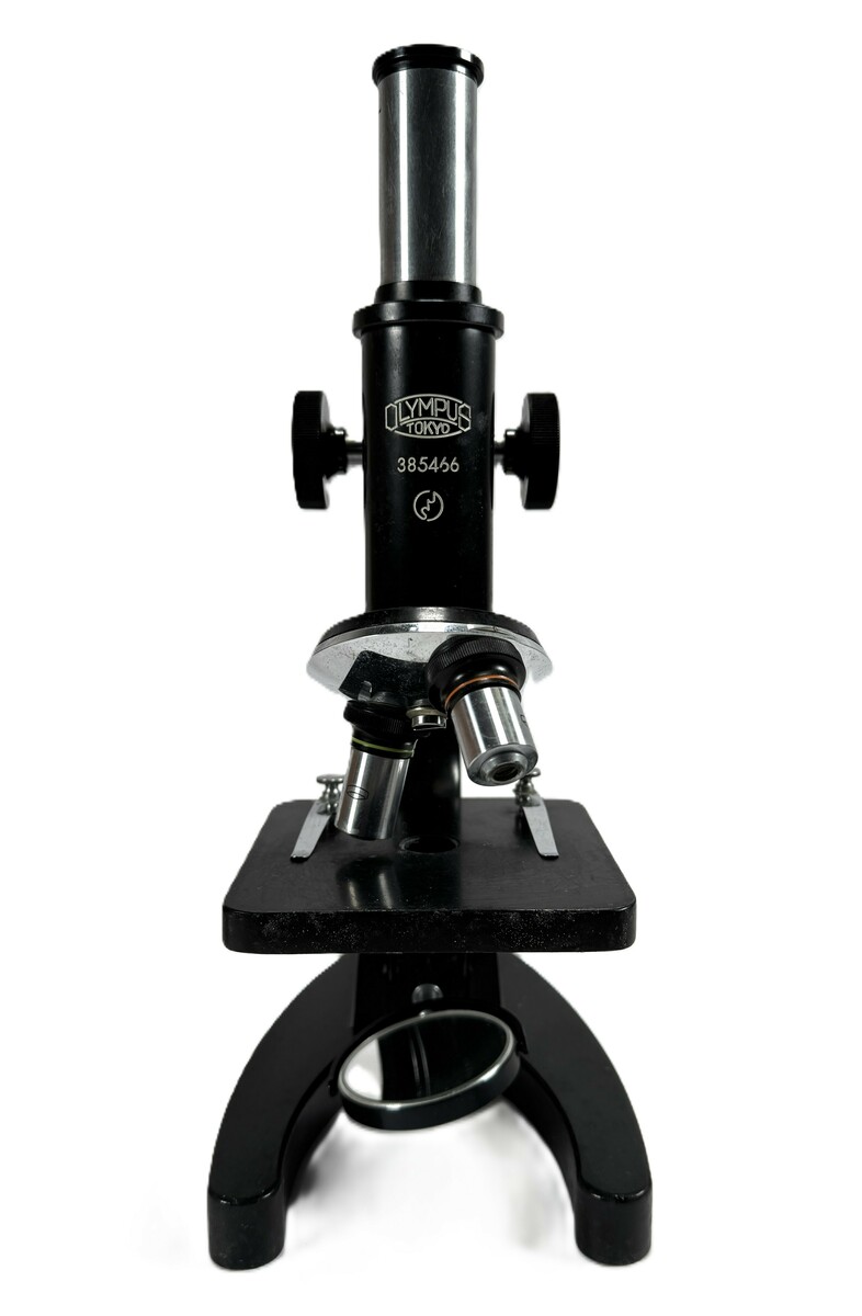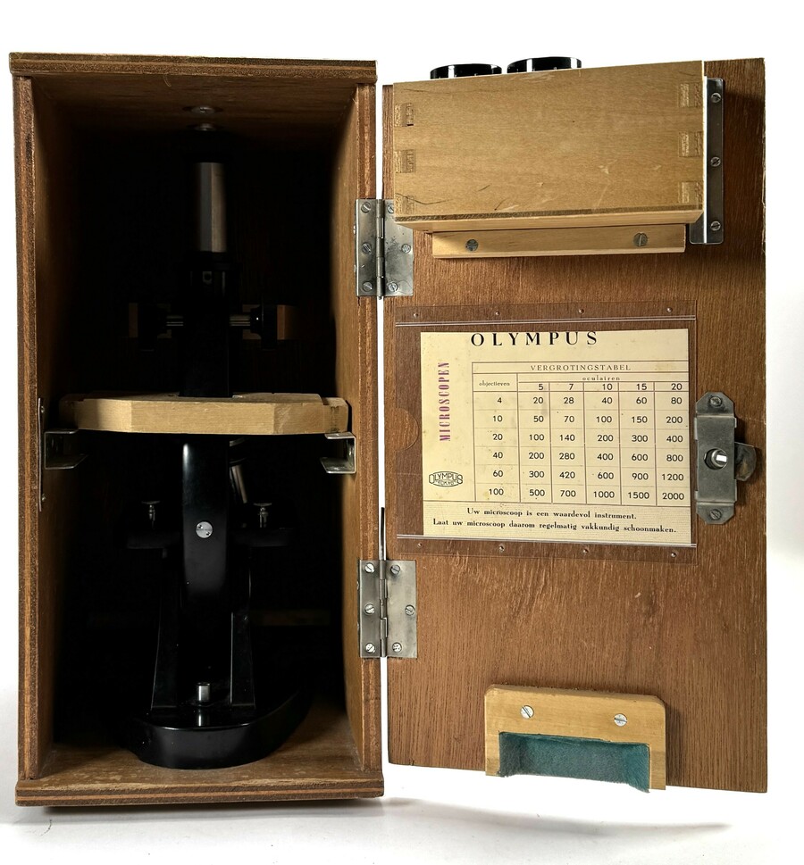 Microscoop van Olympus, vervaardigd uit gietijzer, messing en glas. Het instrument beschikt over een binoculaire inkijk, drievoudige revolver en mechanische objecttafel. Gemerkt aan de voorzijde met fabrieksnaam en serienummer 385466. De microscoop dateert uit circa 1965 en heeft een Japanse herkomst. Geleverd in een originele eikenhouten kist voorzien van vergrotingstabel en accessoires. Deze microscoop zelf beoordelen? Je bent welkom op onze kijkdagen op 10, 11 en 12 april! |