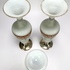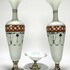 Vazen uit de Art Deco periode, vervaardigd uit wit opaalglas met handgeschilderd geometrisch decor. De balustervormige vazen tonen een brede donkeroranje band met witte cirkels, aangevuld met zwarte guirlandes en gestileerde florale motieven. De vazen rusten op geprofileerde metalen voeten en dateren uit circa 1930. Hierbij een schaaltje vervaardigd uit wit opaalglas met een geprofileerde metalen voet. Kom langs tijdens de kijkdagen en ontdek de vazen en schaaltje zelf! |