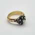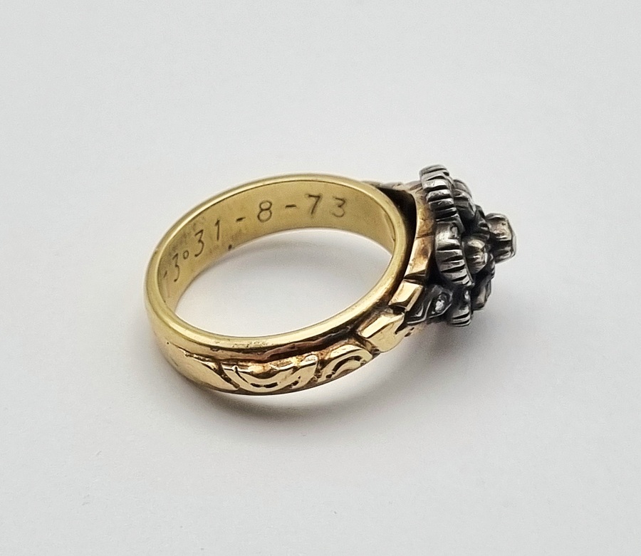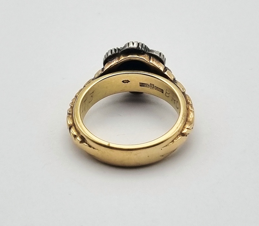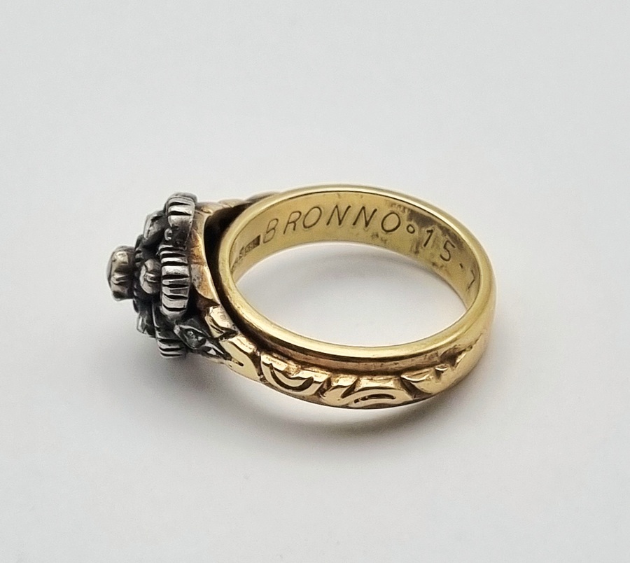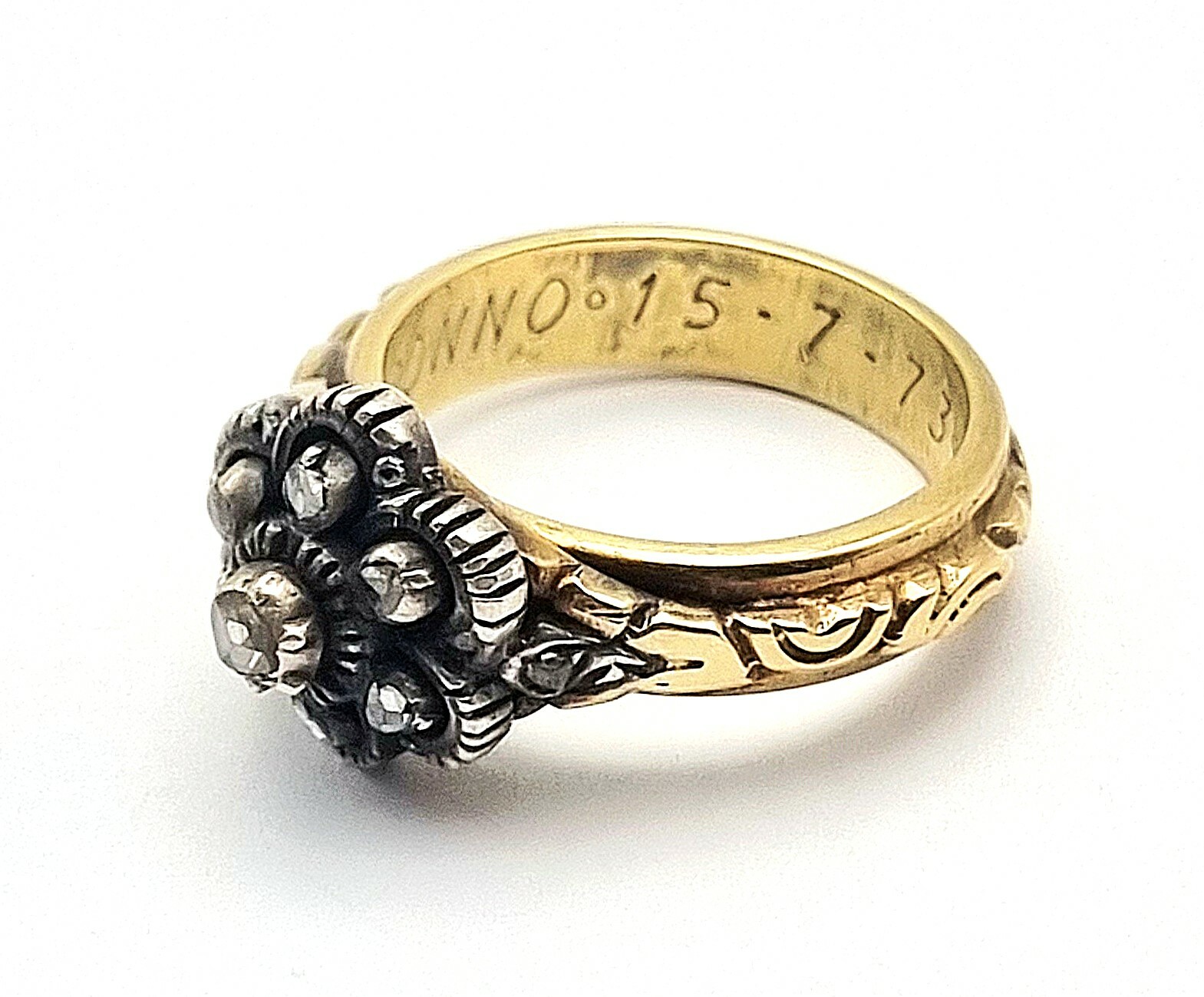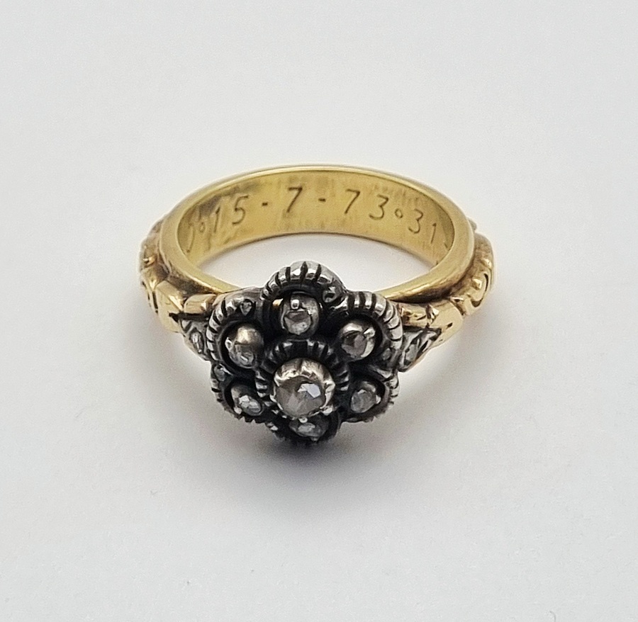 14 karaat gouden ring bezet met zeven diamantjes in roosslijpsel, gevat in een zilveren florale clusterzetting. De geelgouden band vertoont verfijnd graveerwerk met florale motieven en draagt een persoonlijke inscriptie. De ring combineert een klassieke bloemvorm met een robuuste band, gekenmerkt door het Nederlandse eikenbladwaarborgteken. Datering vierde kwart 20e eeuw. Zeker zijn van deelname? Plaats vanaf 3 april een schriftelijk bod online! |