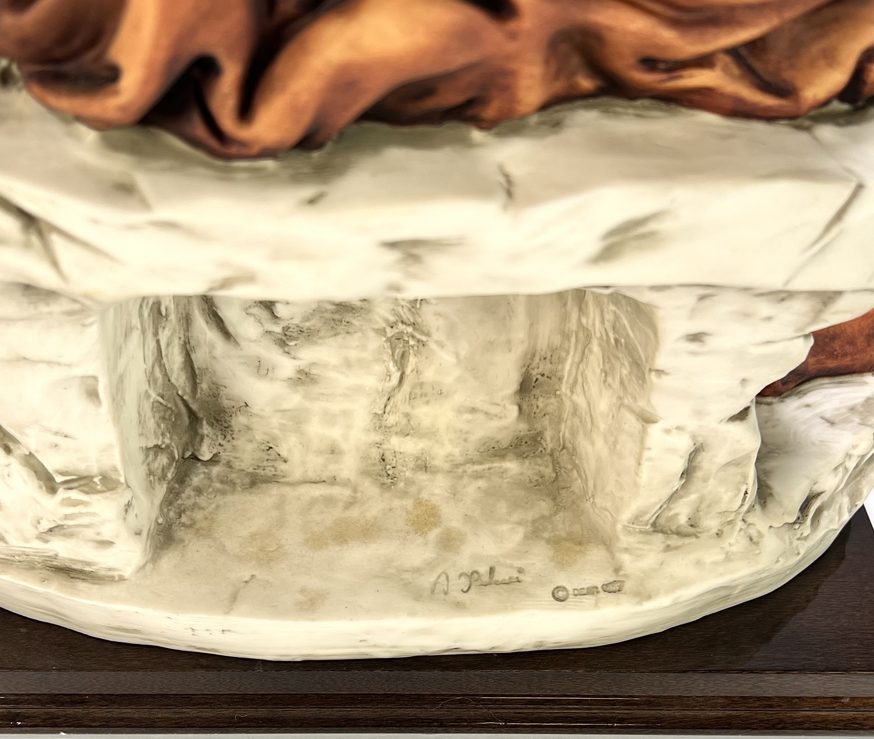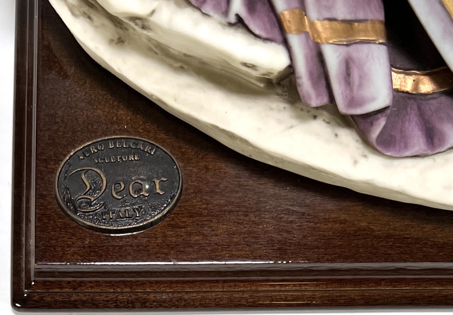 Keramisch beeld, ontwerp Auro Belcari en uitgevoerd door Dear Italy in renaissance stijl, vervaardigd uit polychroom beschilderd keramiek op een houten basement. De piëta toont de Maagd Maria in paars gewaad met goudkleurige accenten die het lichaam van Christus ondersteunt. De rotsachtige voet bevat een halfronde nis en is voorzien van een metalen makers plaatje. De piëta dateert uit de late 20e eeuw en heeft een Italiaanse herkomst. Geïnteresseerd? Bezoek onze kijkdagen op 10, 11 en 12 april van 11:00 tot 17:00 uur! |