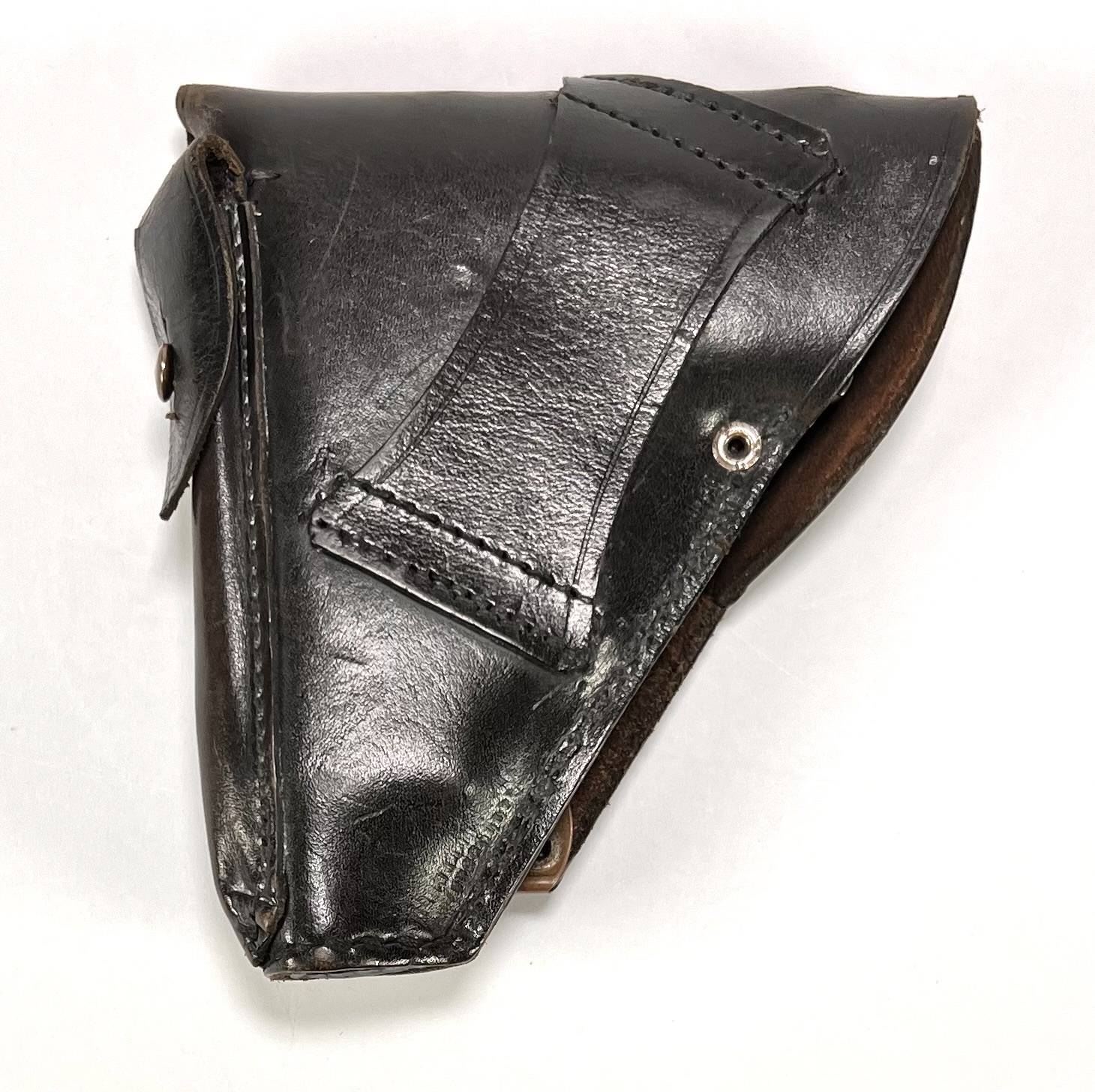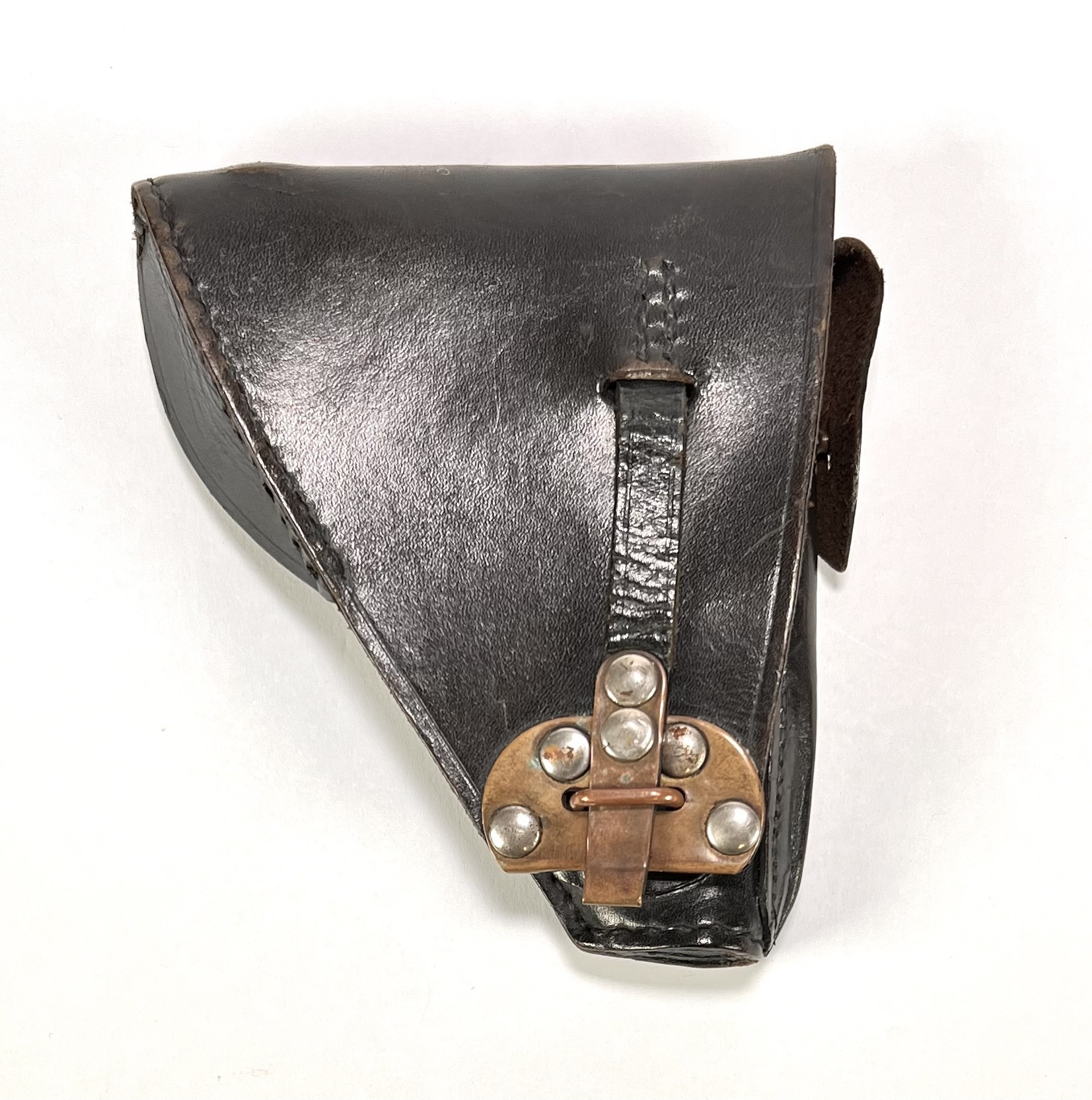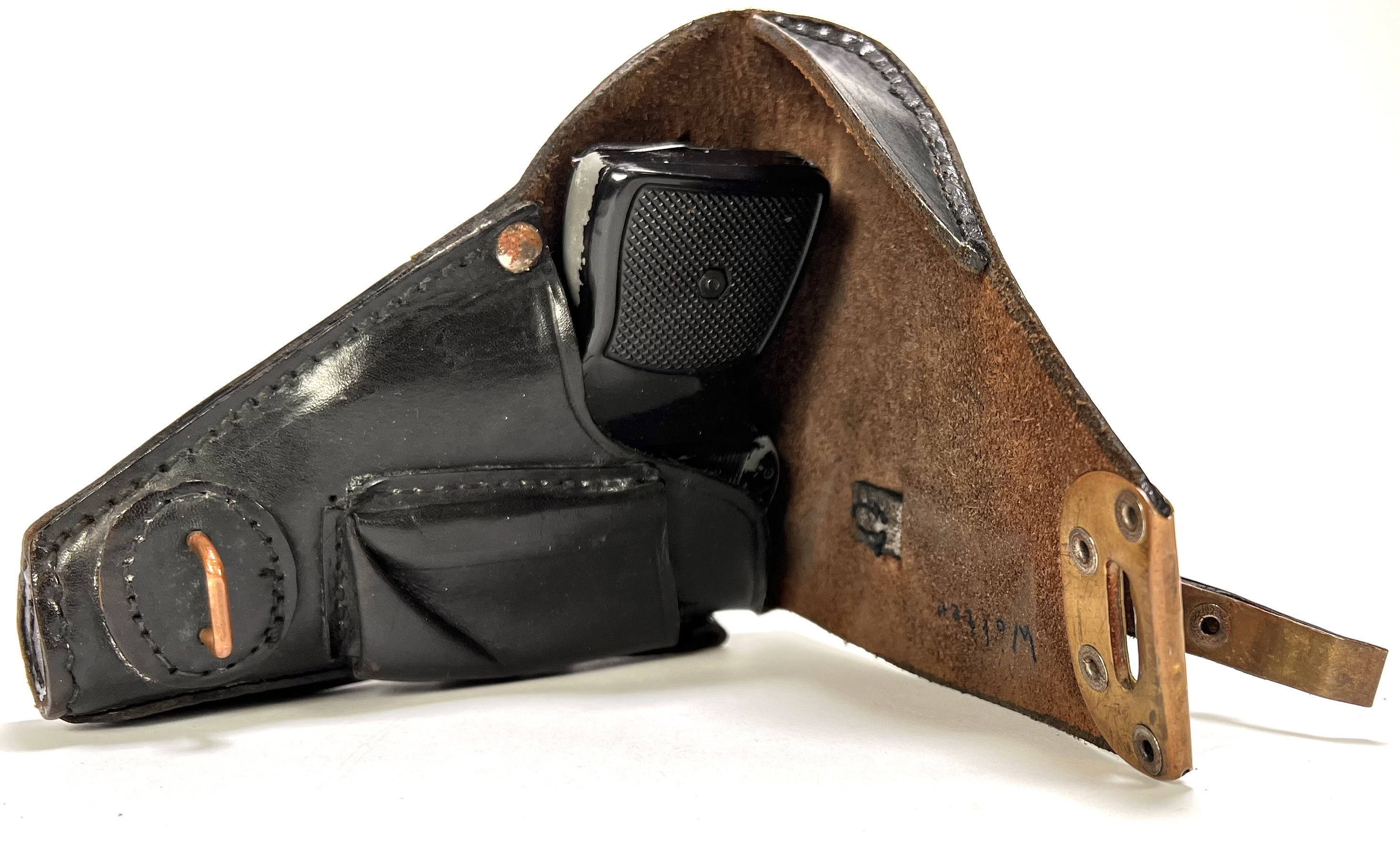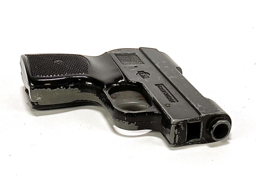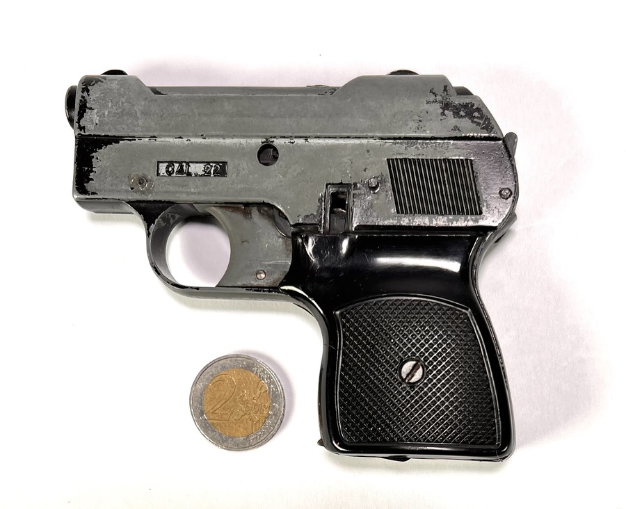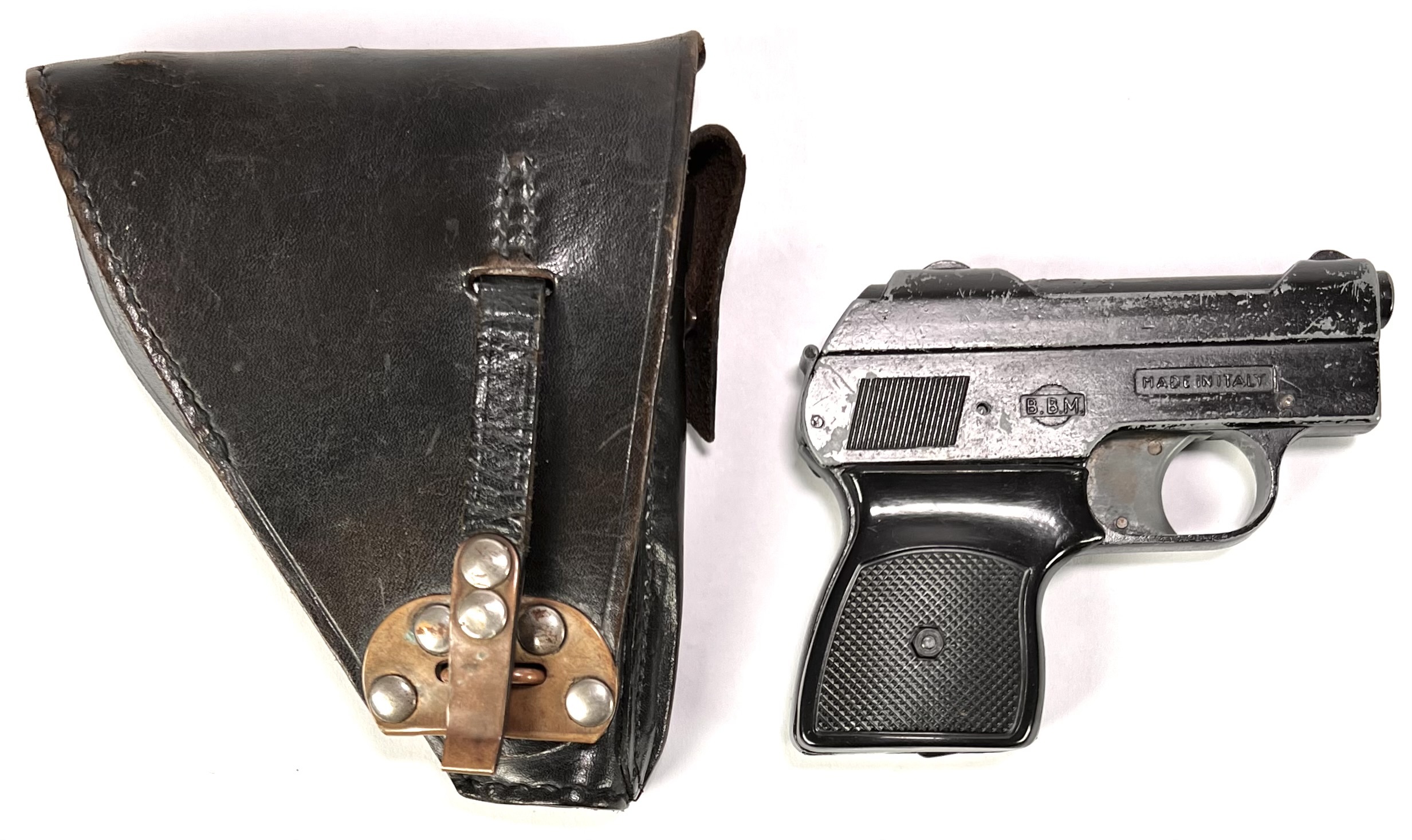 Startpistool van B.B.M., vervaardigd uit gietmetaal met zwart kunststof greepplaten en bijpassende lederen holster met messing en stalen beslag. Gemerkt op de slede met “B.B.M.” en “MADE IN ITALY”. Het compacte zakmodel met korte loop en vlakke slede dateert uit de jaren '70 en heeft een Italiaanse herkomst. Het startpistool is onklaar gemaakt. Wil je dit startpistool in het echt bekijken? Kom naar de kijkdagen! |