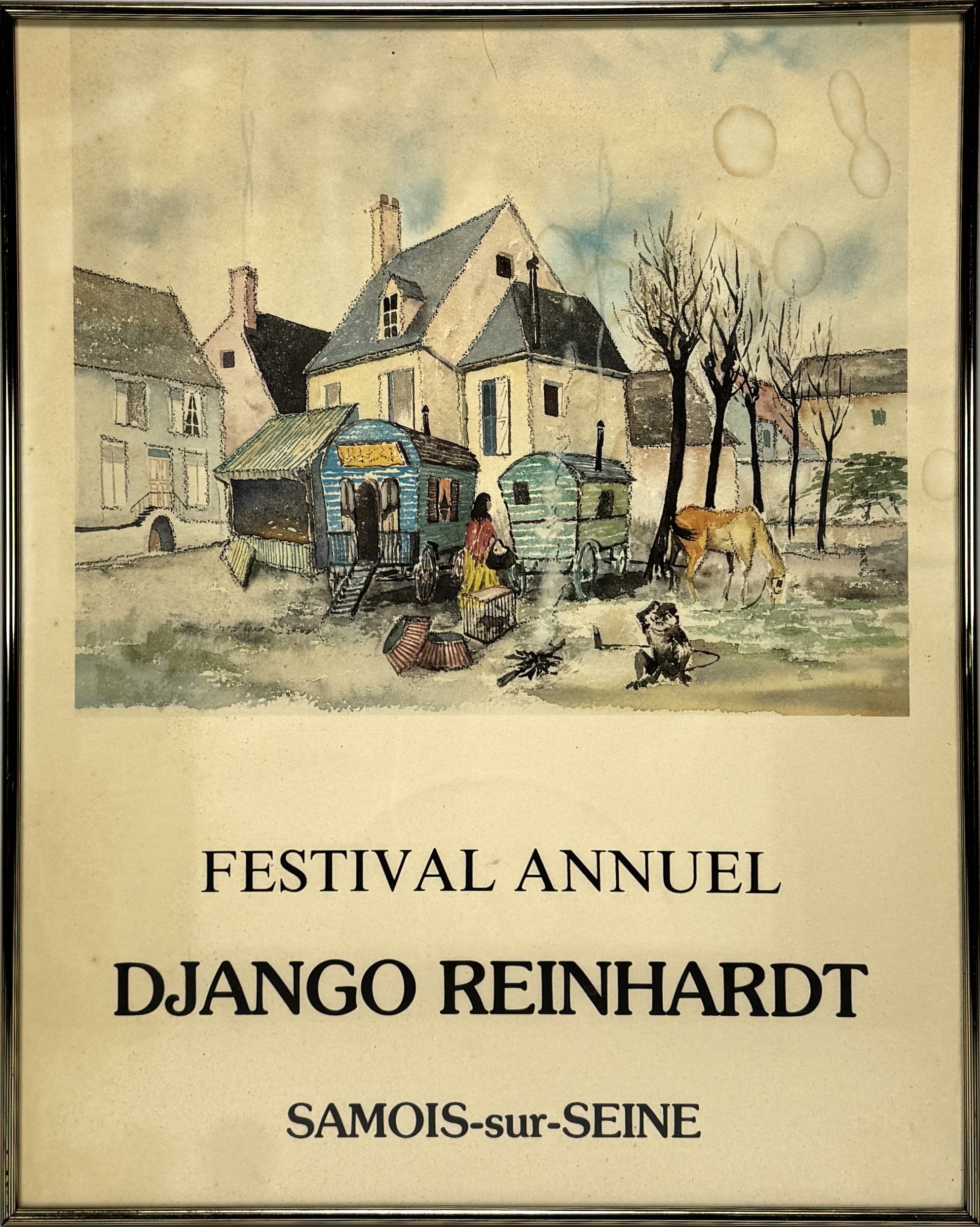 Poster voor het jaarlijkse festival “Django Reinhardt”, in kleurendruk op papier, toont een dorpsgezicht in Samois-sur-Seine met woonwagens, figuren en een rij bomen langs de rechterzijde. Franse herkomst, tweede helft 20e eeuw. Geïnteresseerd? Bezoek onze kijkdagen op 10, 11 en 12 april van 11:00 tot 17:00 uur! |