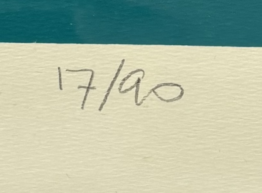 Zeefdruk door Ted Felen (1931–2016), getiteld "Farewell", toont een abstracte compositie in modernistische stijl, uitgevoerd in zeefdruk op papier. De voorstelling kenmerkt zich door een centraal okergeel cirkel tegen diepblauwe kleurvlakken. Rechtsonder getiteld, midden onder genummerd 17/90 en linksonder gesigneerd en gedateerd. De zeefdruk dateert uit 1992 en is voorzien van een zwarte lijst. Registreer nu en bied eenvoudig online mee op deze zeefdruk! |