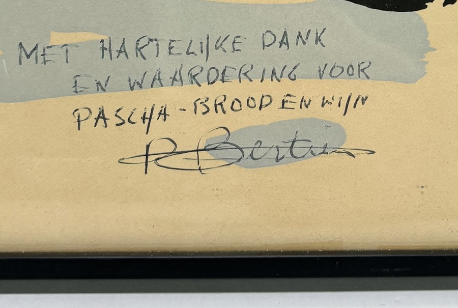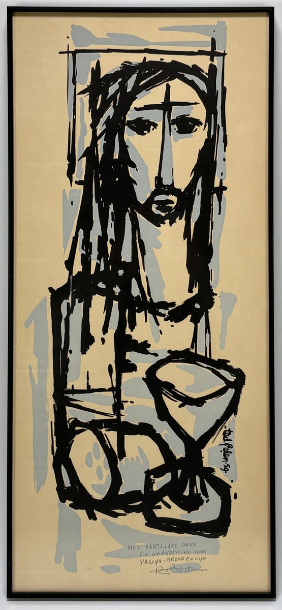 Litho door Ted Felen (1931–2016) toont een religieuze voorstelling van Christus met kelk in expressionistische stijl, uitgevoerd op papier. De compositie kenmerkt zich door zwarte en grijze contourlijnen tegen een beige kleurveld. De prent is rechtsonder gesigneerd en gedateerd 1959. Het werk heeft een Nederlandse herkomst, met handgeschreven annotatie. Geïnteresseerd? Bezoek onze kijkdagen op 10, 11 en 12 april van 11:00 tot 17:00 uur! |