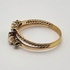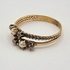 Gouden ring van 14 karaat, gedateerd begin 20e eeuw, uitgevoerd in de Edwardiaanse Belle Époque-stijl. De ring is vervaardigd door smeden en omvat een gesmede dubbele band, waarvan één deel gevlochten is. De kop is een asymmetrische clusterzetting bezet met twee parels, geflankeerd door vier kleine diamanten, gezet in chatons. Geïnteresseerd? Bezoek onze kijkdagen op 10, 11 en 12 april van 11:00 tot 17:00 uur! |
