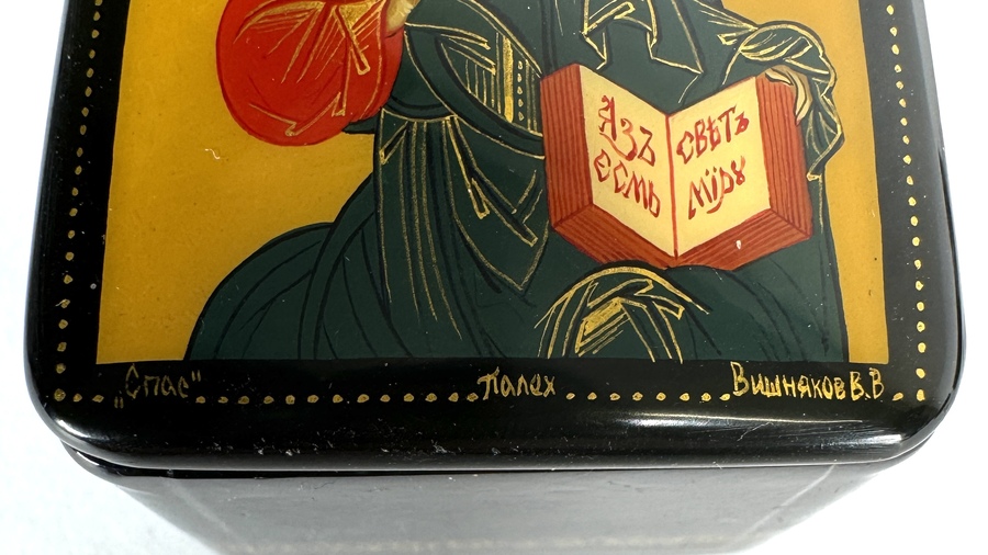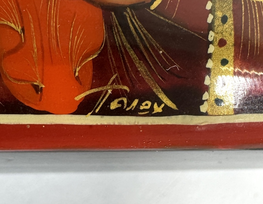 Vier handbeschilderde Russische lakwerkdoosjes, overwegend in Palekh stijl, laat 20e eeuw, uitgevoerd in tempera op papier-maché. Het kavel omvat devotionele lakwerkdoosjes met Christus Pantokrator en Maria-voorstellingen met kind, geschilderd op warme oker- en oranjerode gronden met goudaccenten. Twee doosjes zijn gesigneerd, waaronder Спас / Палех / Вишняков В.В. / Spas / Palekh / Vishnyakov V.V., alle exemplaren hebben zwart gelakte wanden en rode binnenzijden. Geïnteresseerd? Bezoek onze kijkdagen op 10, 11 en 12 april van 11:00 tot 17:00 uur! |