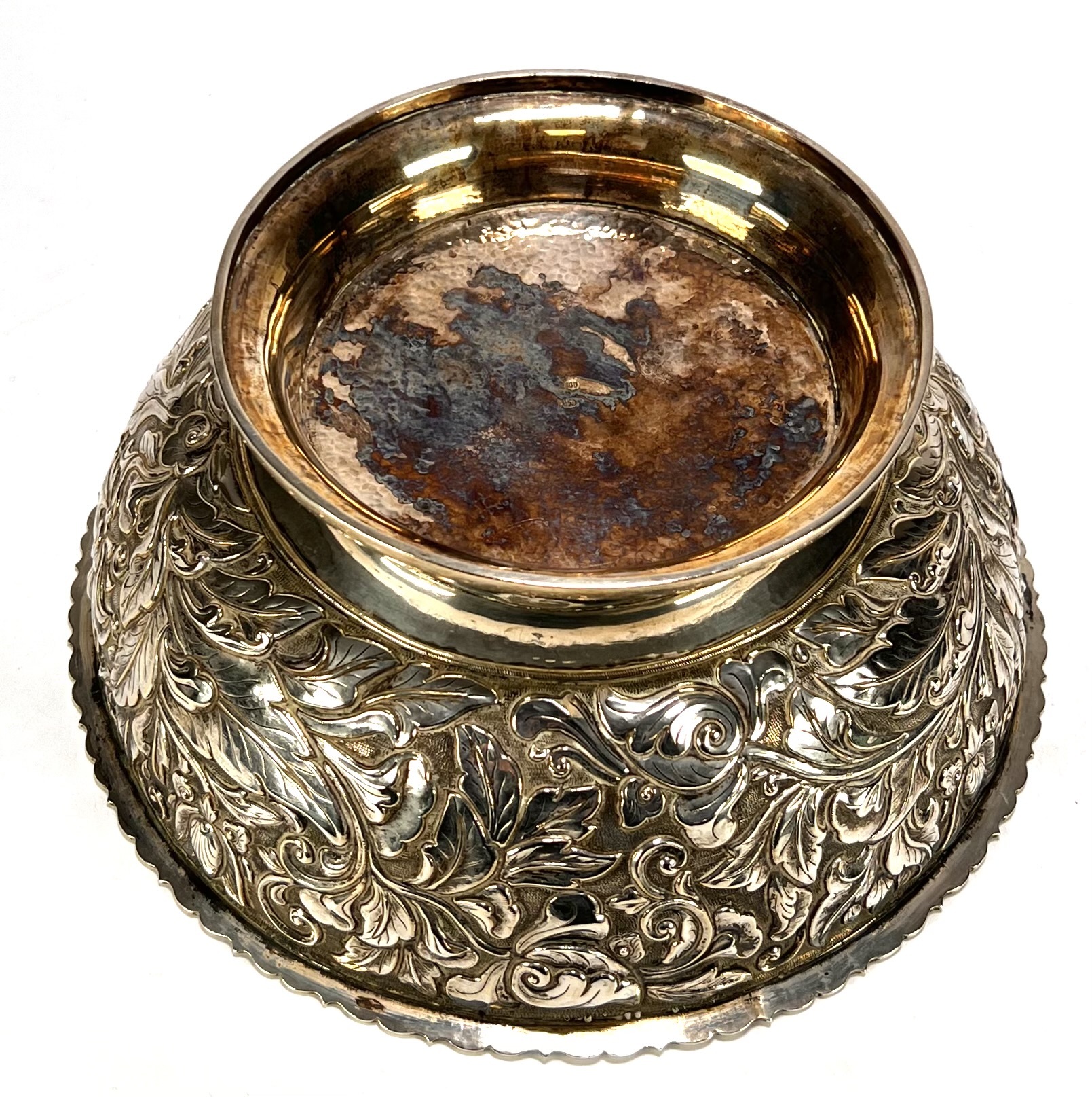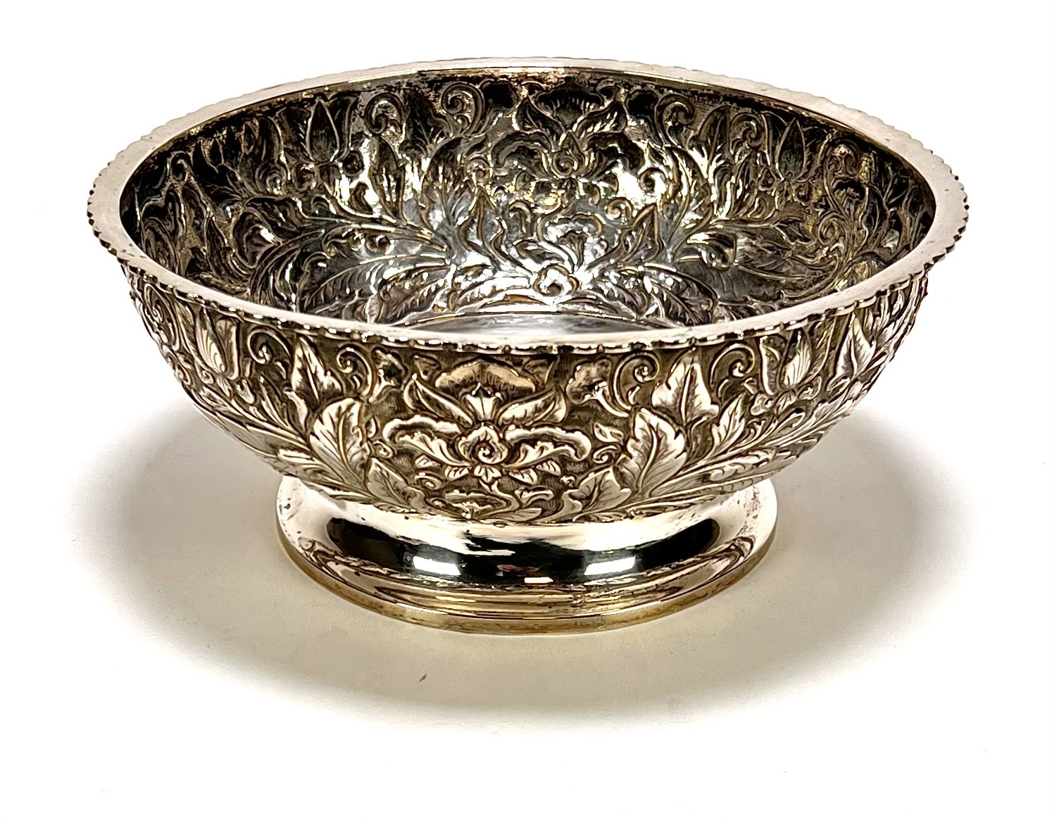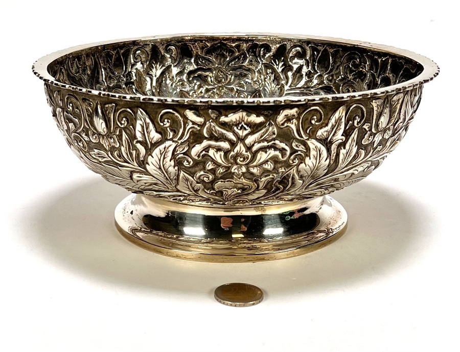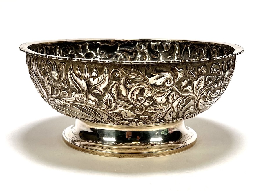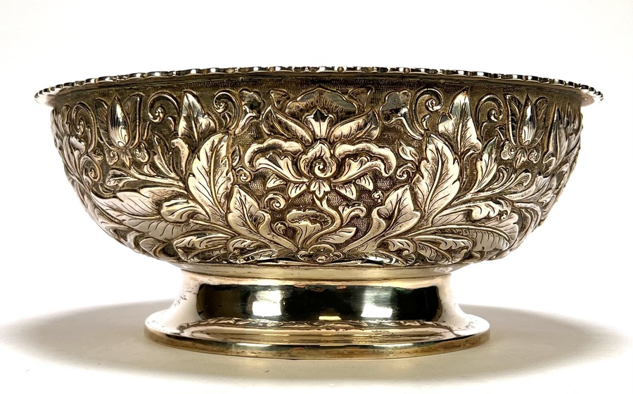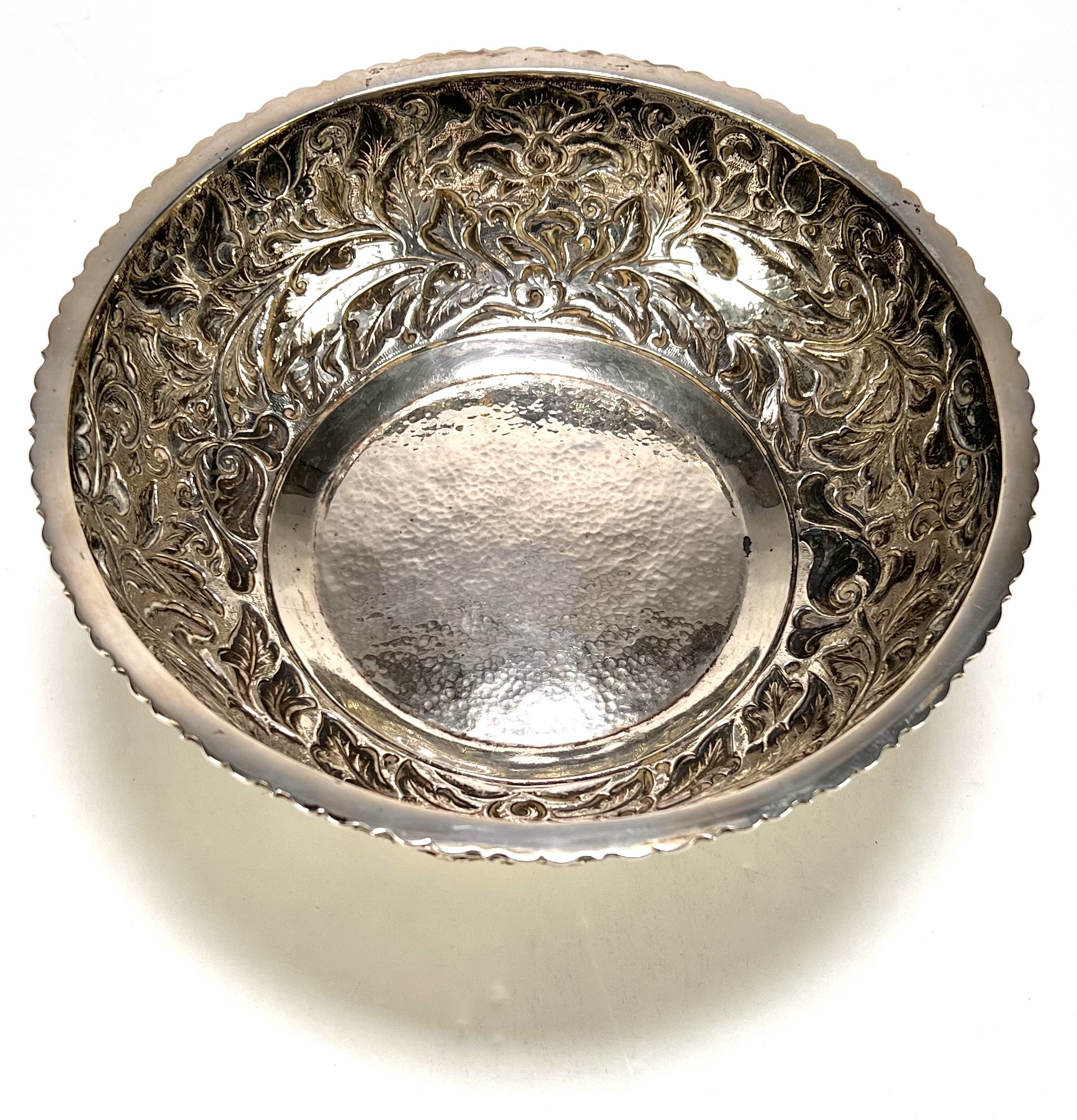 Schaal uit de Art Nouveau periode, circa 1930, vervaardigd uit 800/1000 zilver. De ronde schaal op voet toont een rijk gedreven decoratie met lotusbloem-motieven en tropische florale ornamentiek. De onderzijde is voorzien van de letters MD en het gehaltestempel 800. De schaal vertoont kenmerkend Javaans handwerk uit de koloniale periode en heeft een herkomst in Nederlands-Indië. Klaar om te bieden? Registreer je nu en doe mee aan de veiling! |