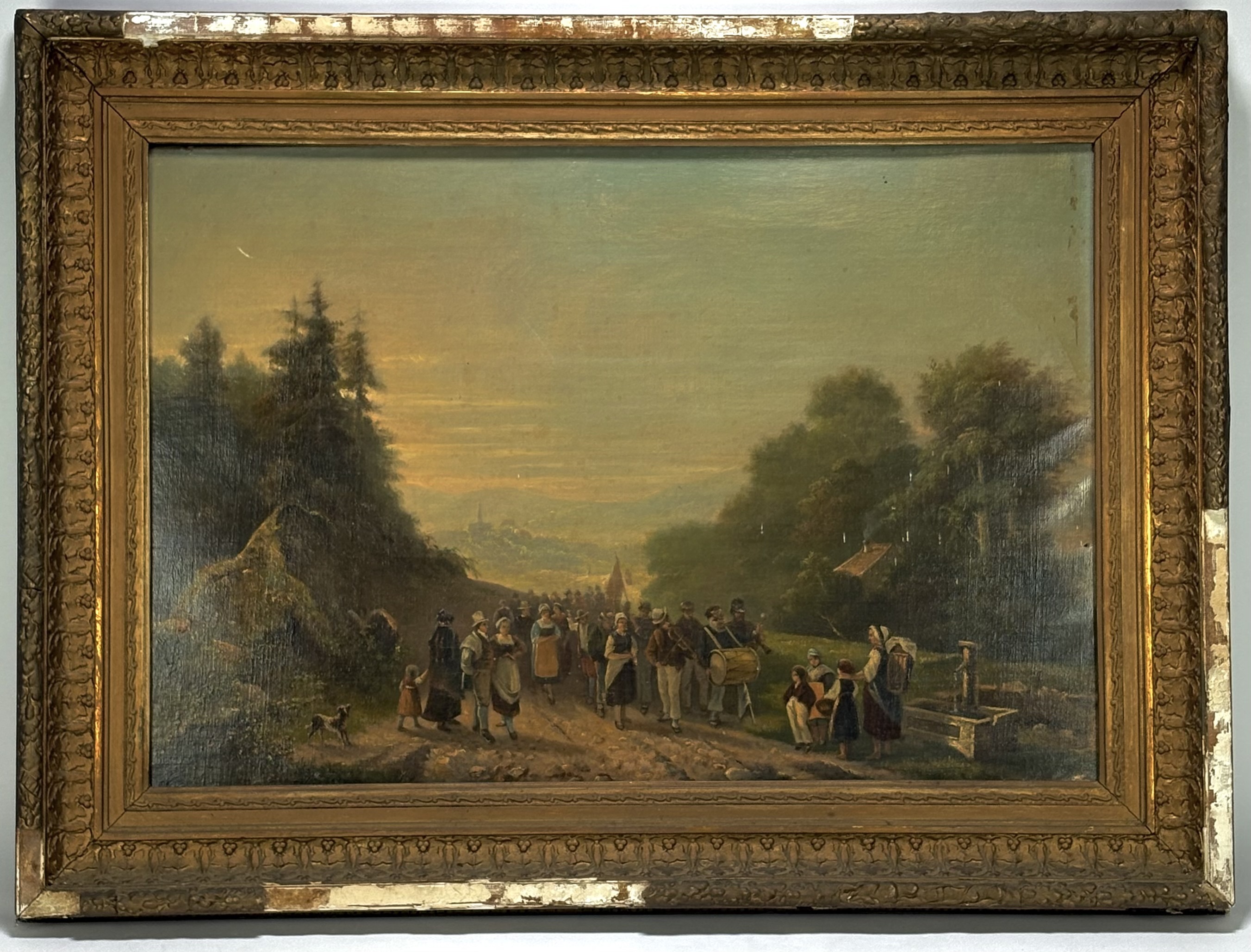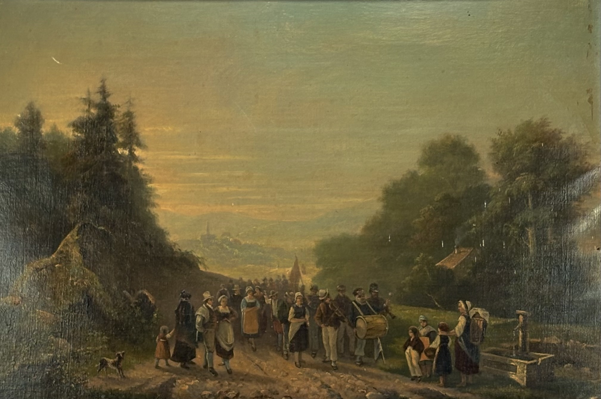 Schilderij toont een feestelijke dorpsprocessie uit de romantiek, uitgevoerd in olieverf op doek. De compositie centreert zich rond muzikanten met trommel en viool die een groep dorpsbewoners in klederdracht aanvoeren. Een gedetailleerd landschap met dichte boompartijen, een rokend huisje en een waterpomp in de voorgrond. Het schilderij dateert uit ca. 1850 en heeft een Noord-Europese herkomst. Geïnteresseerd? Bezoek onze kijkdagen op 10, 11 en 12 april van 11:00 tot 17:00 uur! |