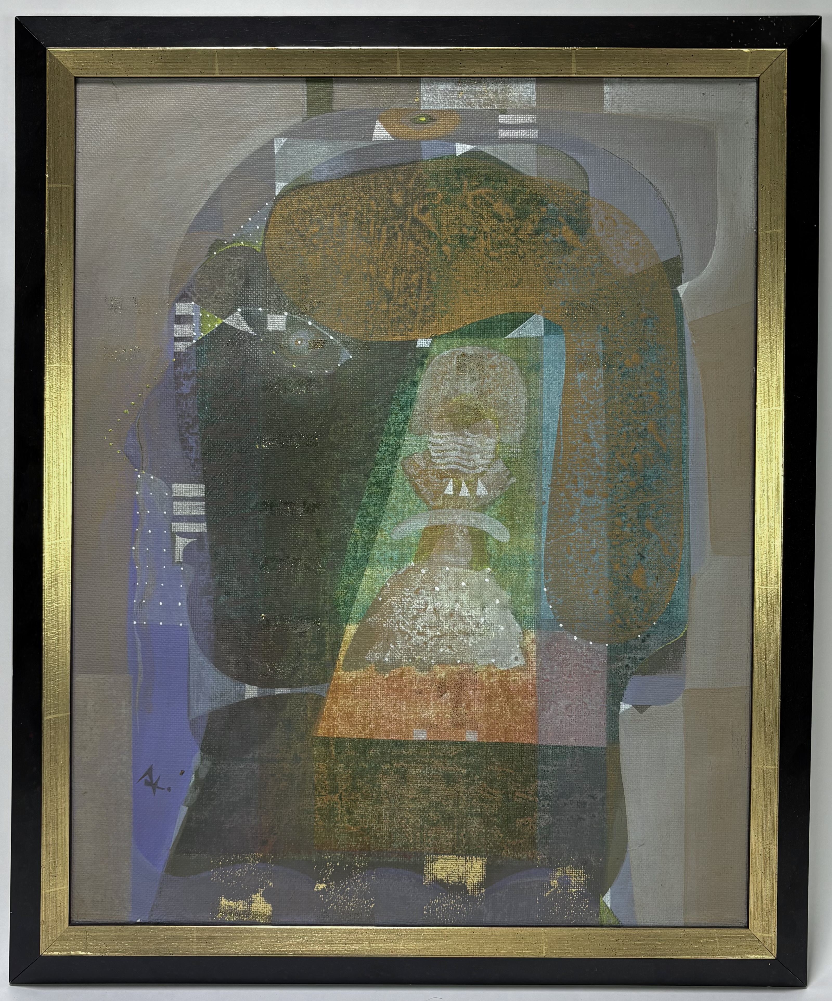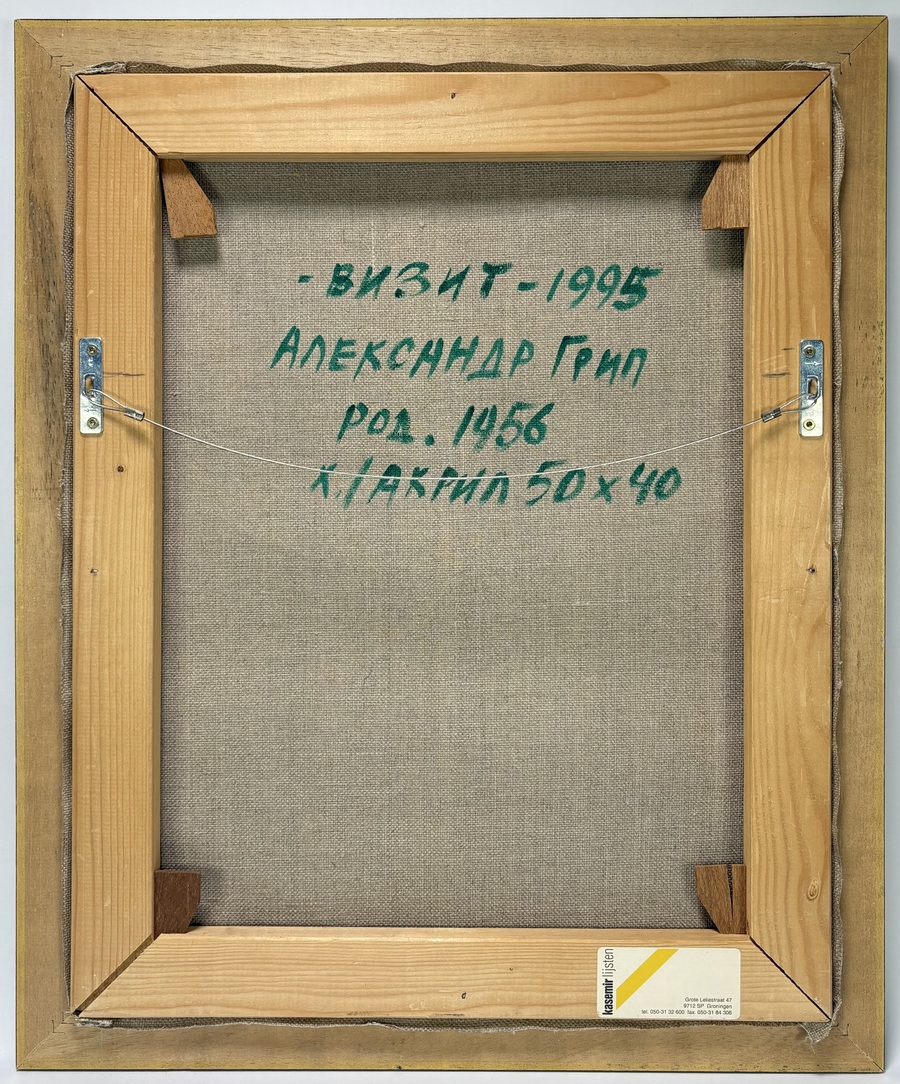Schilderij door Alexander Grip (1956), uitgevoerd in acryl op doek, toont een gestileerd figuur opgebouwd uit transparante geometrische vlakken in paars, groen, oker en grijs. Linksonder gemonogrammeerd, verso geannoteerd “Визит-1995”; het schilderij sluit aan bij post-Sovjet modernistische schilderkunst. In zwarte lijst met goudkleurige binnenrand. Geïnteresseerd? Bezoek onze kijkdagen op 10, 11 en 12 april van 11:00 tot 17:00 uur! |