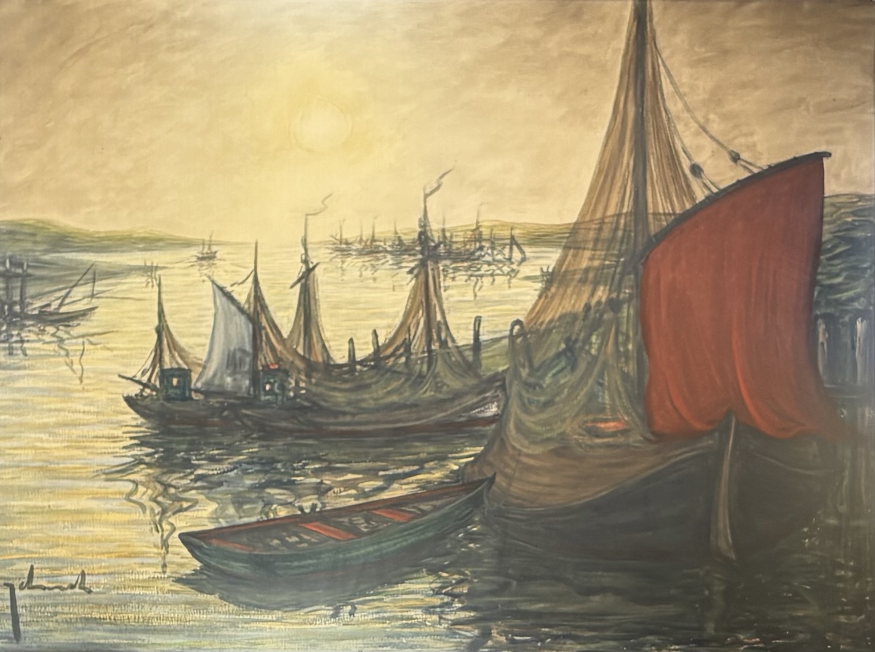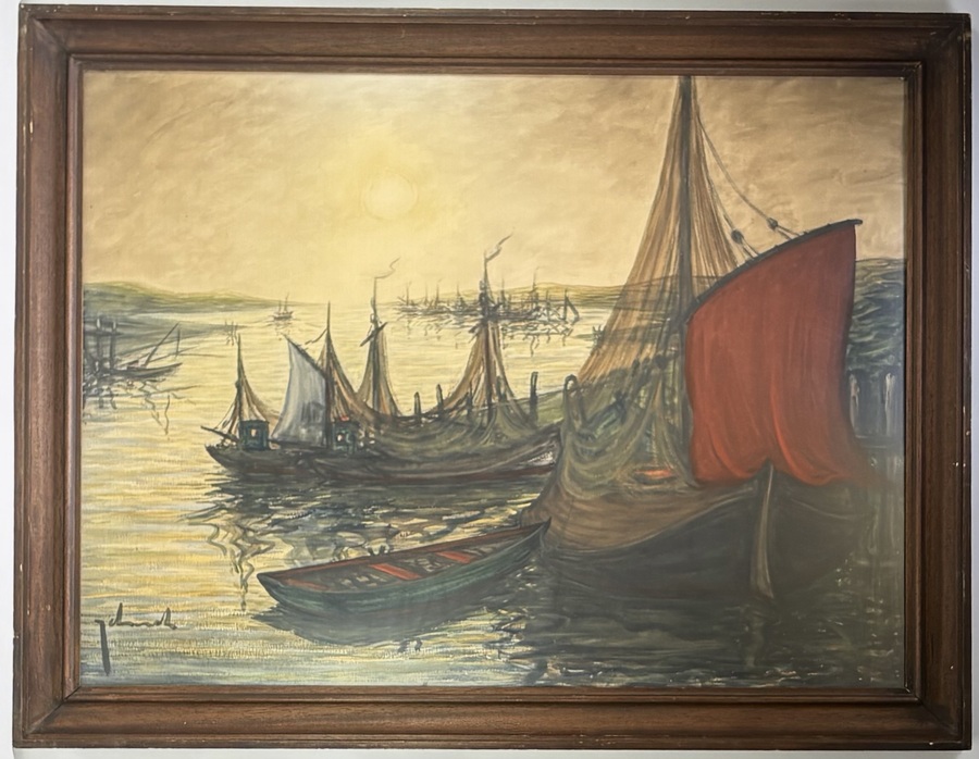 Schilderij, uitgevoerd in olieverf op doek, toont vissersschepen in een haven bij zonsondergang in impressionistische stijl. De roodbruine zeilen en de reflectie van het warme zonlicht in het kabbelende water bepalen de compositie. Het schilderij is linksonder onduidelijk gesigneerd en dateert uit begin twintigste eeuw. Voeg dit schilderij toe aan je verzameling en doe een bod! |