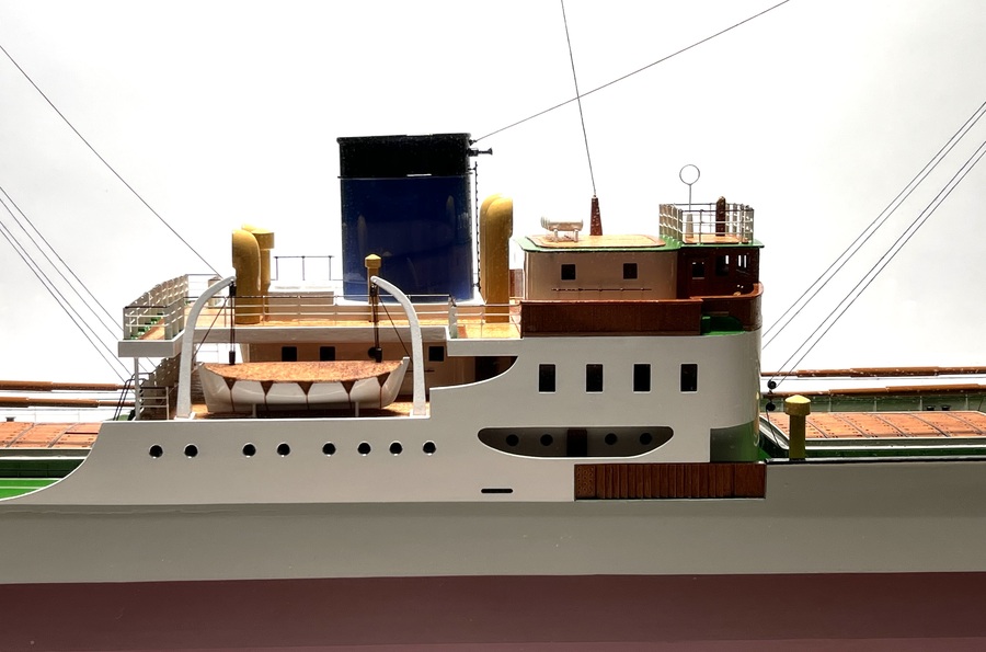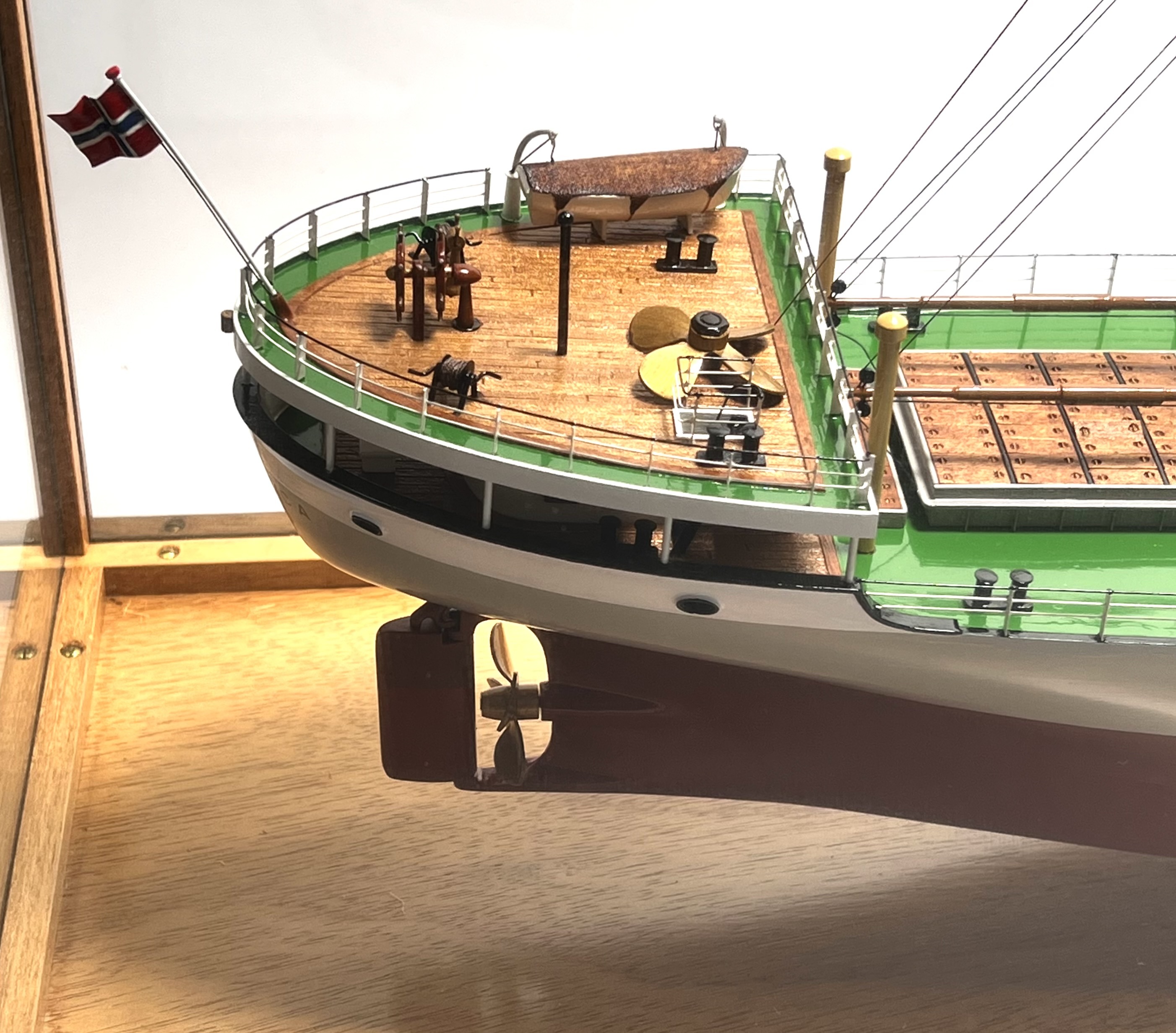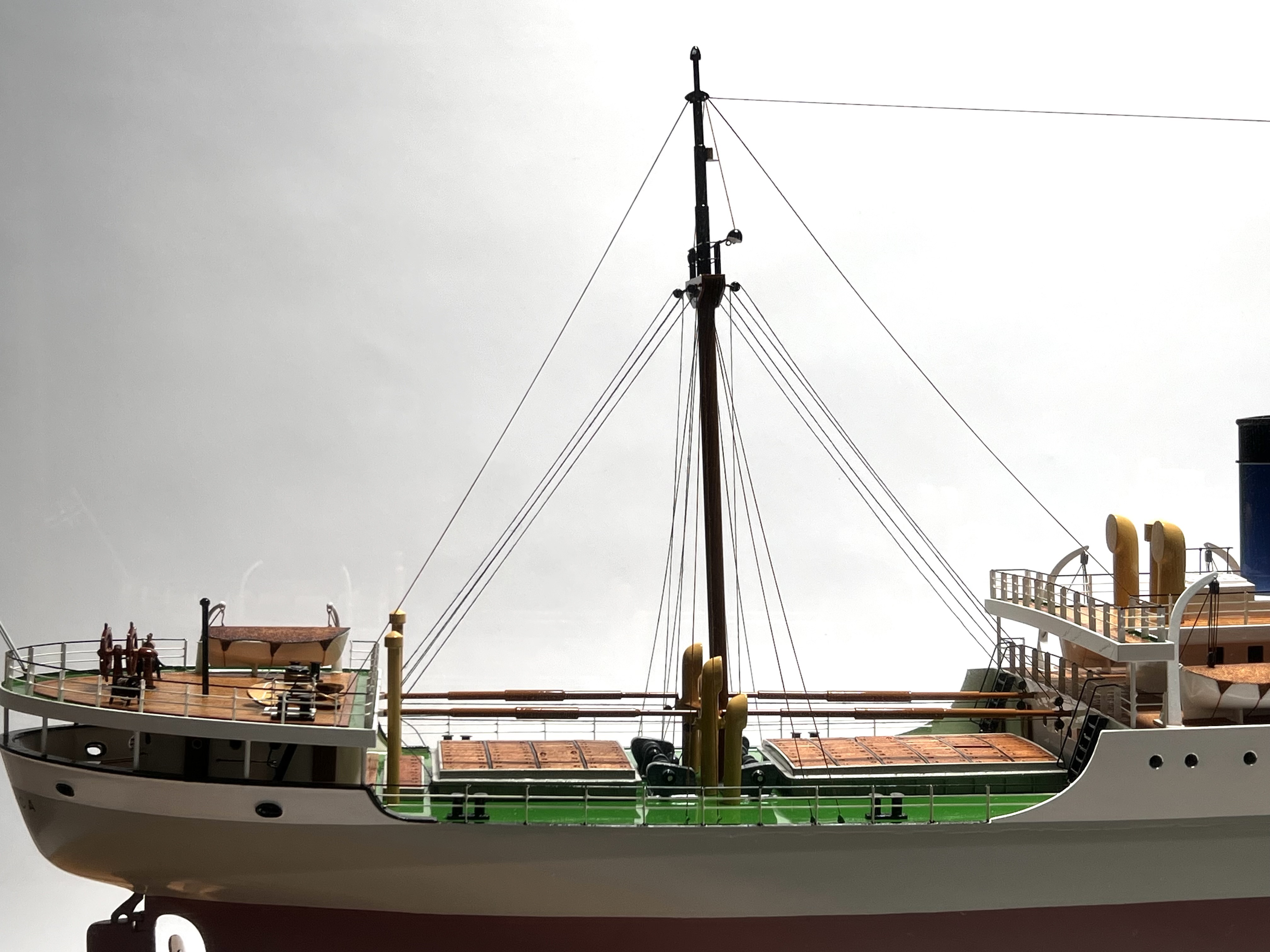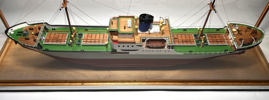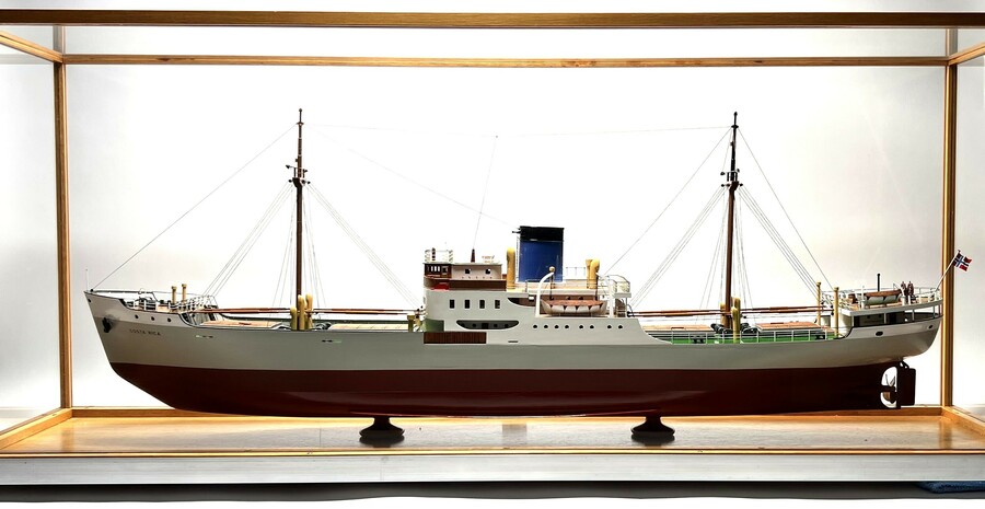 Scheepsmodel van de Noorse vrachtvaarder Costa Rica, uitgevoerd als gedetailleerd schaalmodel in een houten vitrinekast. Het scheepsmodel is geschilderd met een groen dek, voorzien van fijnmazig getuigde masten en messing beslag, met reddingsboten in davits en de Noorse vlag aan de achtersteven. Het scheepsmodel dateert uit de tweede helft 20e eeuw en heeft een Europese herkomst. Geïnteresseerd? Bezoek onze kijkdagen op 10, 11 en 12 april van 11:00 tot 17:00 uur! |