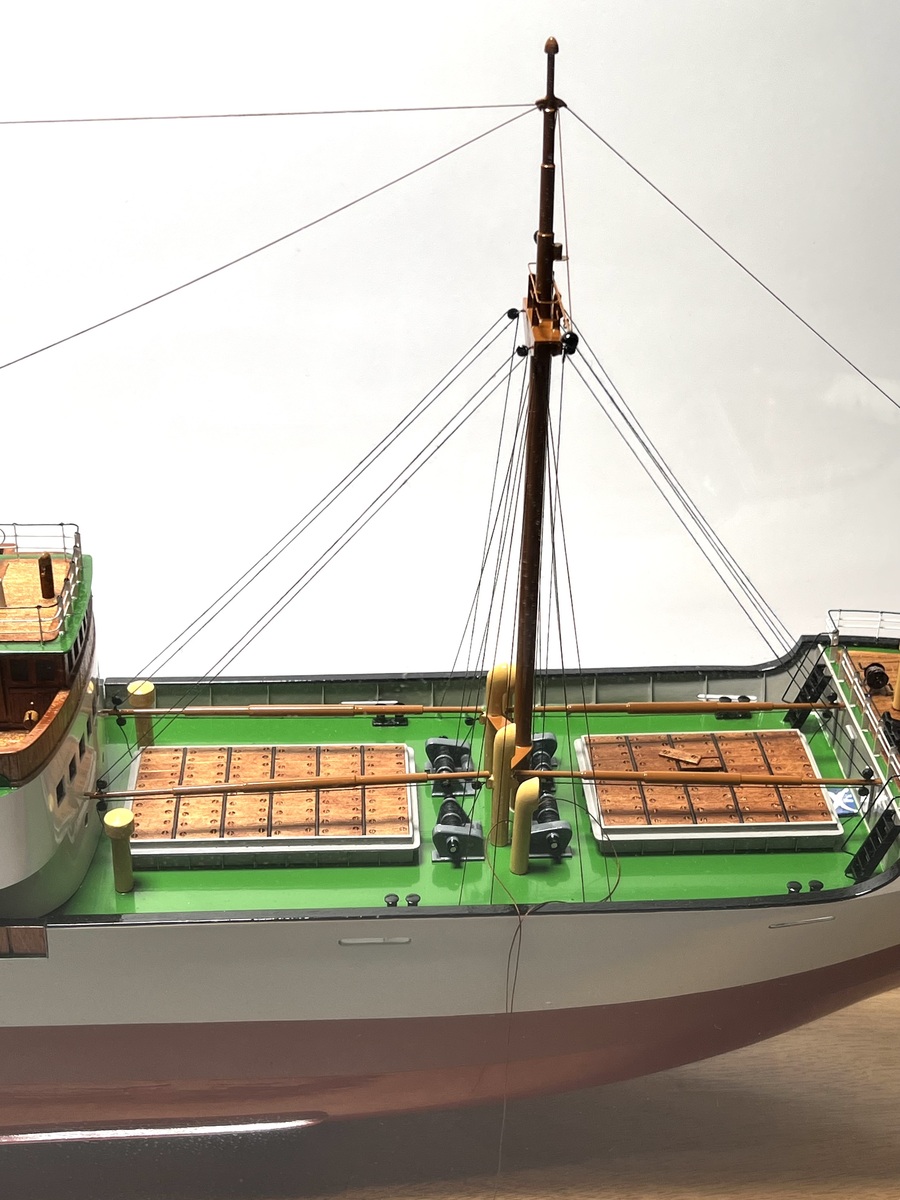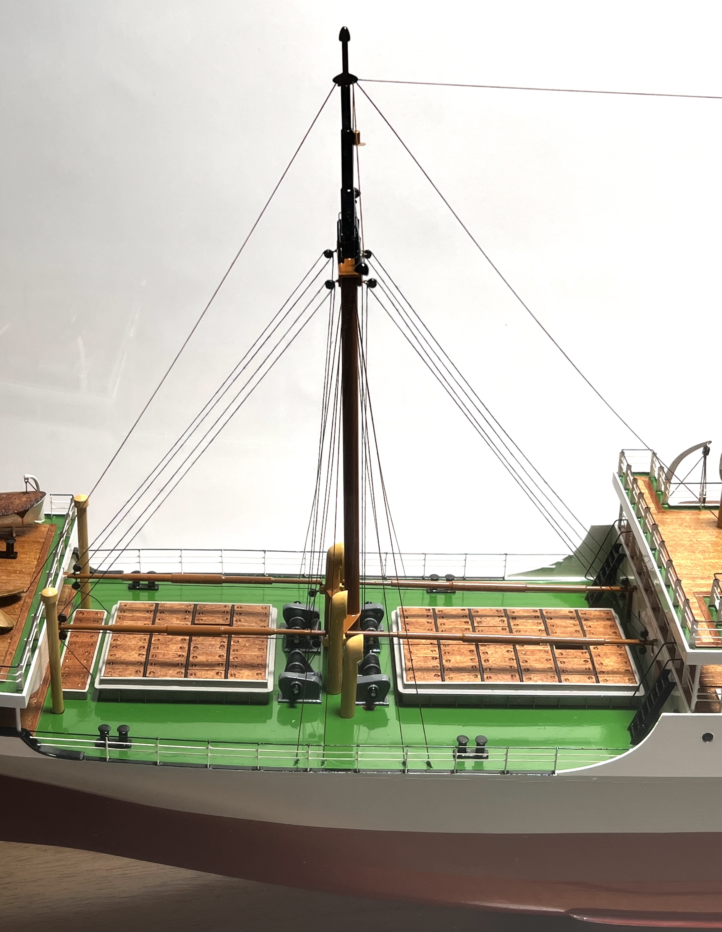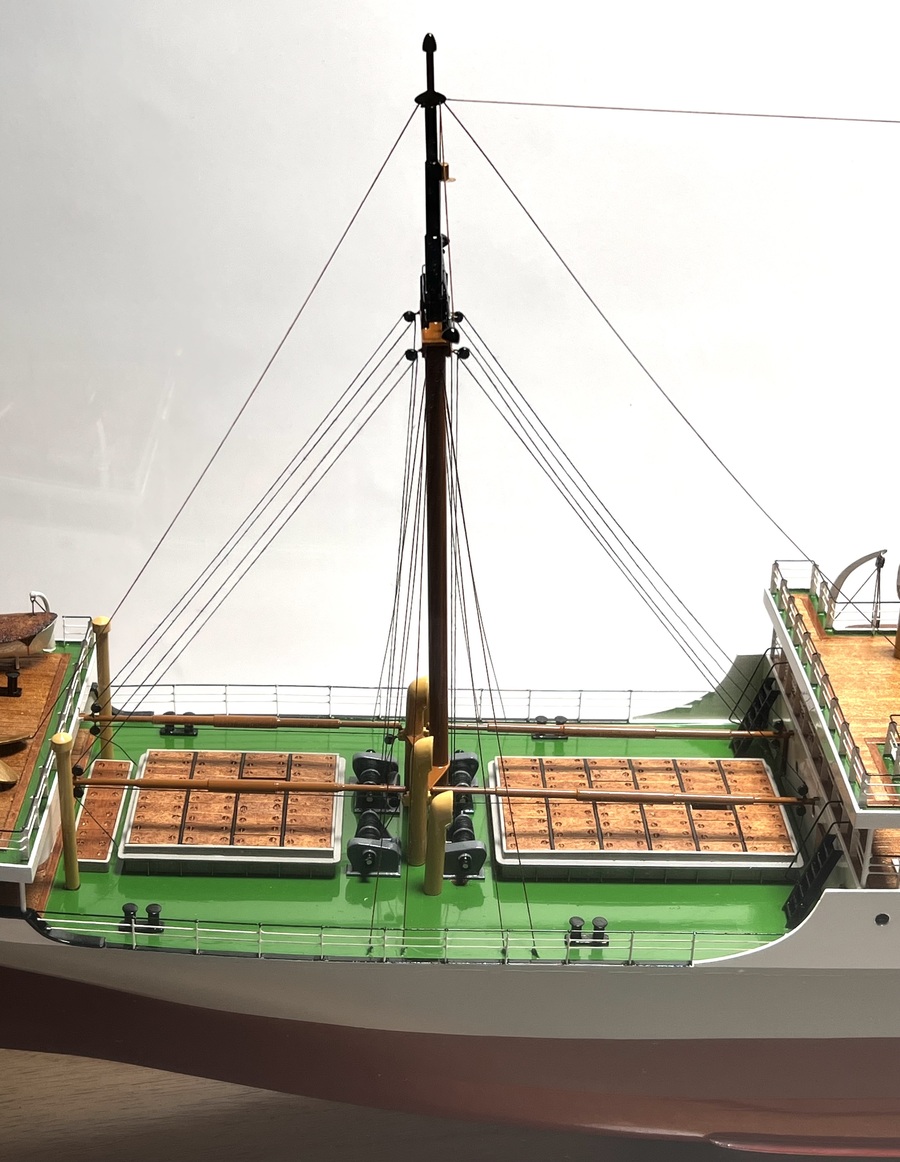 Scheepsmodel van de Noorse vrachtvaarder Costa Rica, uitgevoerd als gedetailleerd schaalmodel in een houten vitrinekast. Het scheepsmodel is geschilderd met een groen dek, voorzien van fijnmazig getuigde masten en messing beslag, met reddingsboten in davits en de Noorse vlag aan de achtersteven. Het scheepsmodel dateert uit de tweede helft 20e eeuw en heeft een Europese herkomst. Geïnteresseerd? Bezoek onze kijkdagen op 10, 11 en 12 april van 11:00 tot 17:00 uur! |