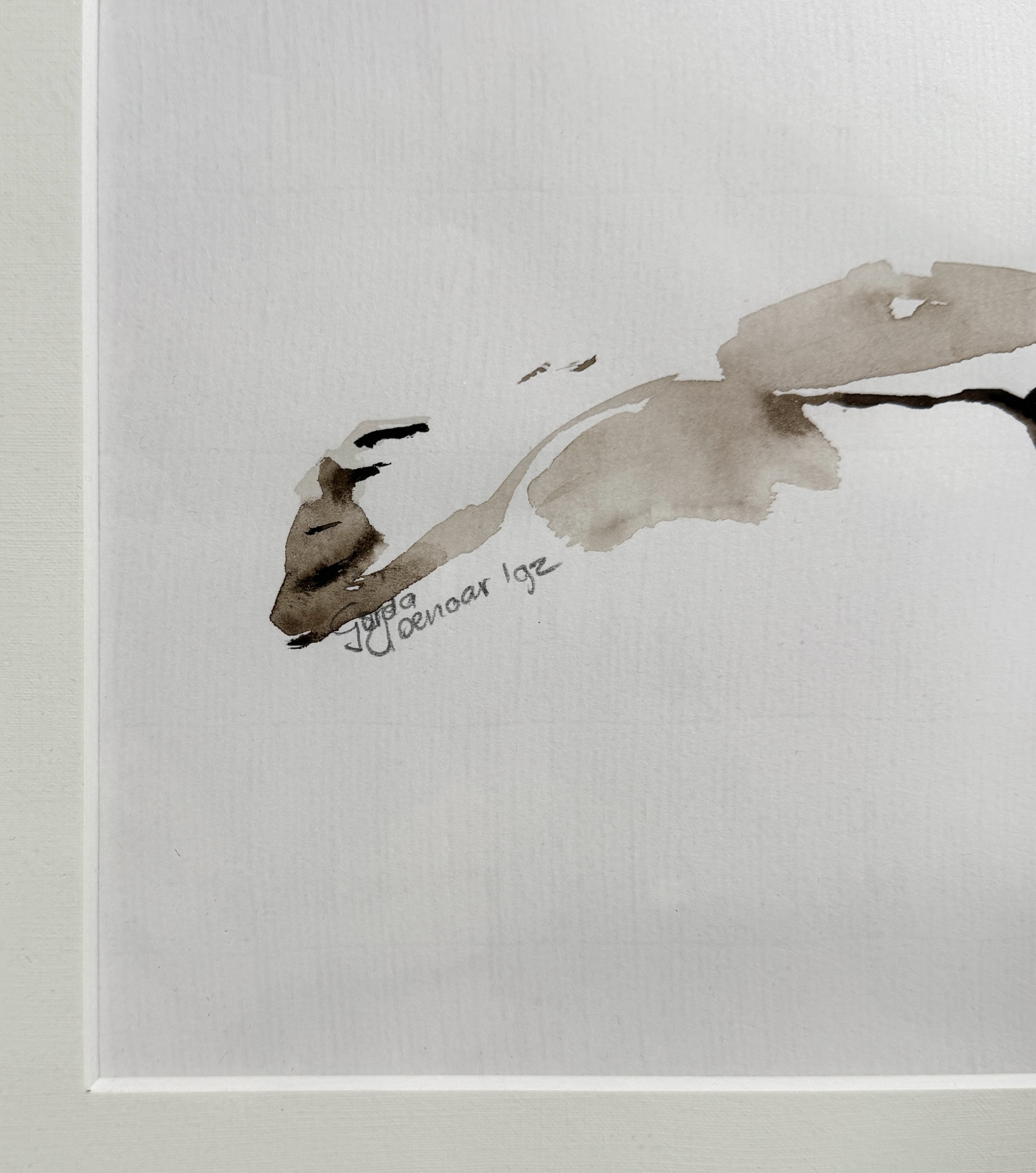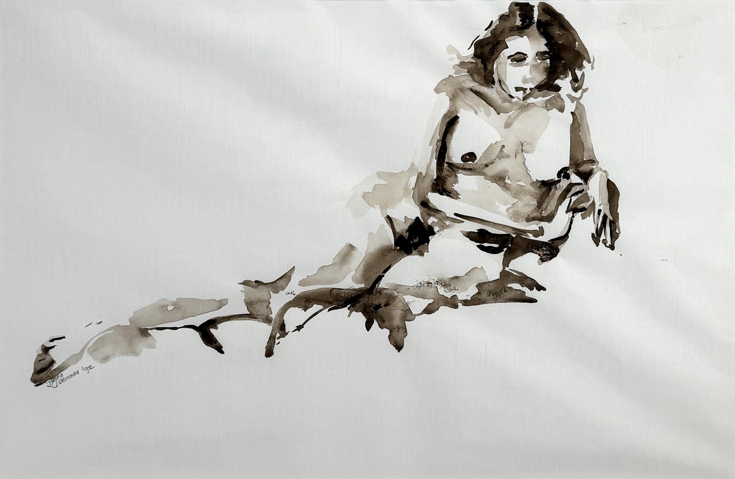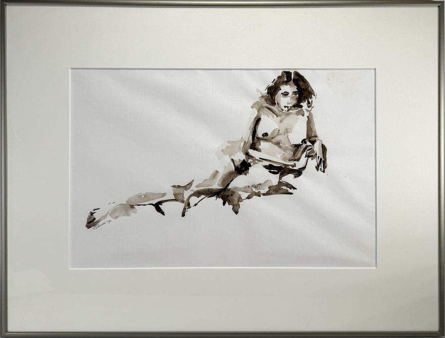Sepia aquarel door Gerda Elsenaar toont een liggend naakt getiteld "In de kussens" in expressionistische stijl, op papier. De monochrome compositie in sepia kenmerkt zich door een vloeiende penseelvoering, linksonder gesigneerd en gedateerd '92. De aquarel heeft een Nederlandse herkomst en zit in een zilverkleurige lijst met een neutraal passe-partout. Kom langs tijdens de kijkdagen (10 t/m 12 april) en ontdek deze aquarel zelf! |