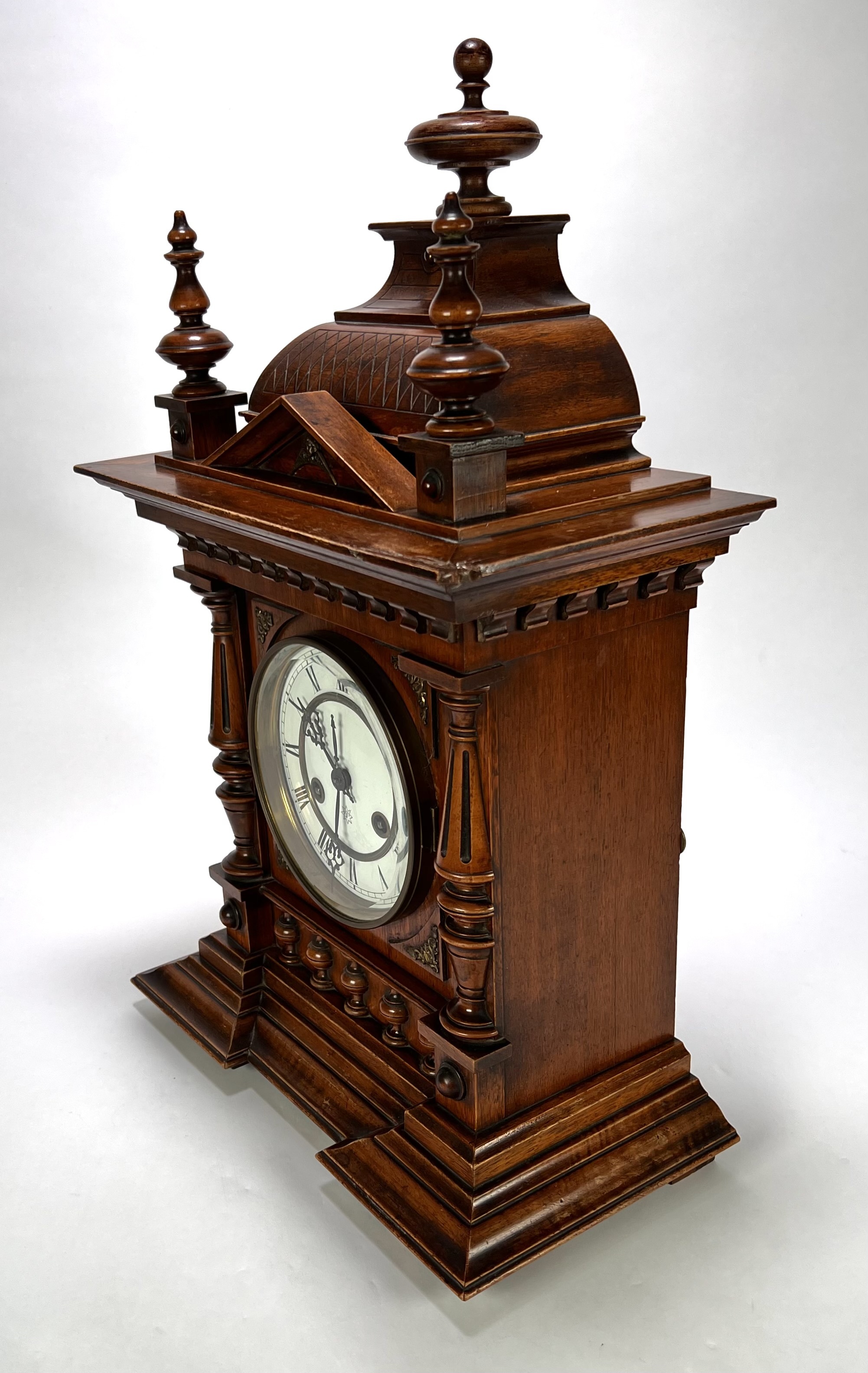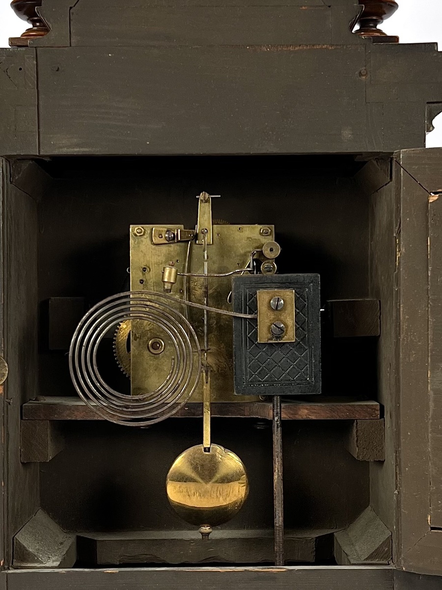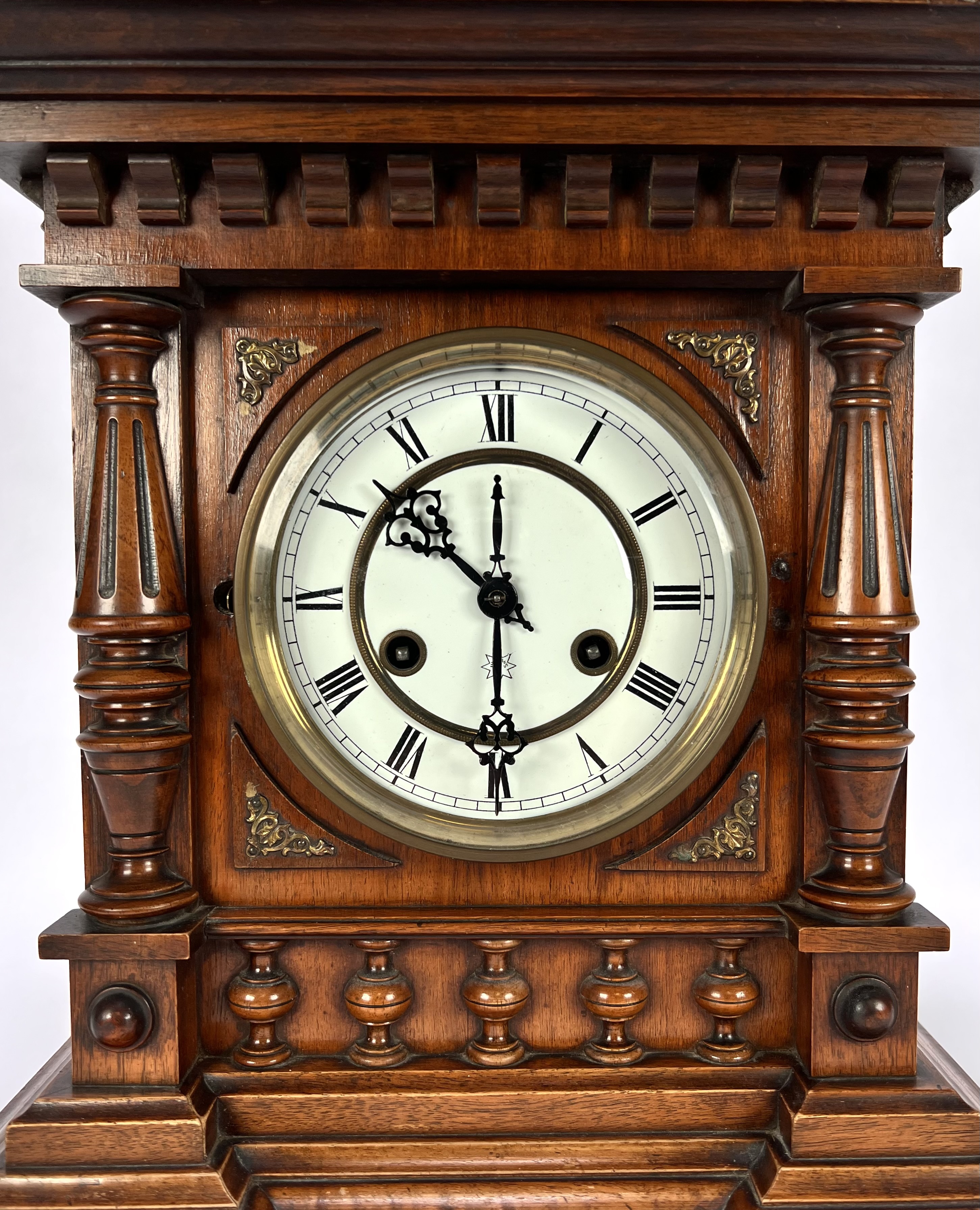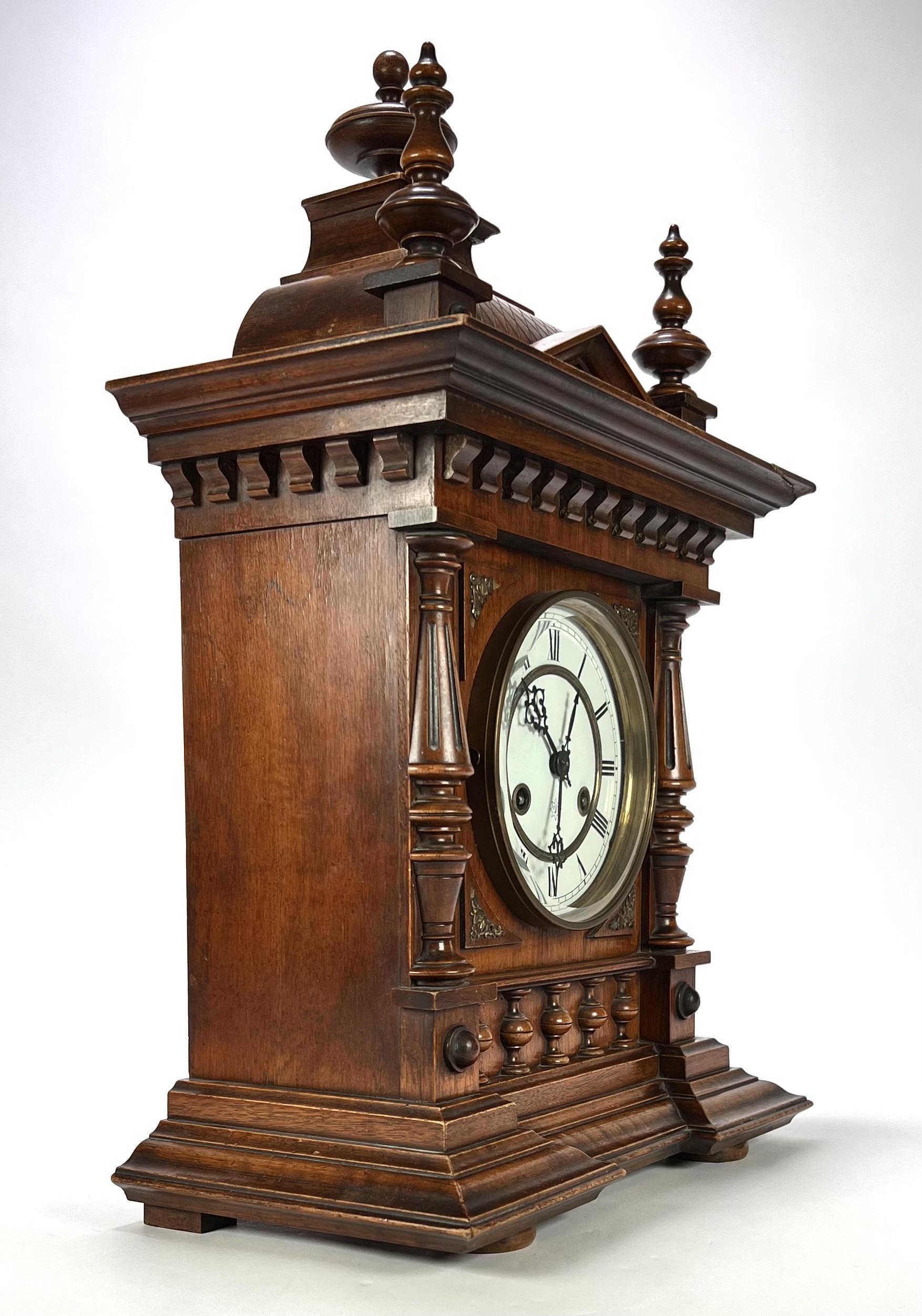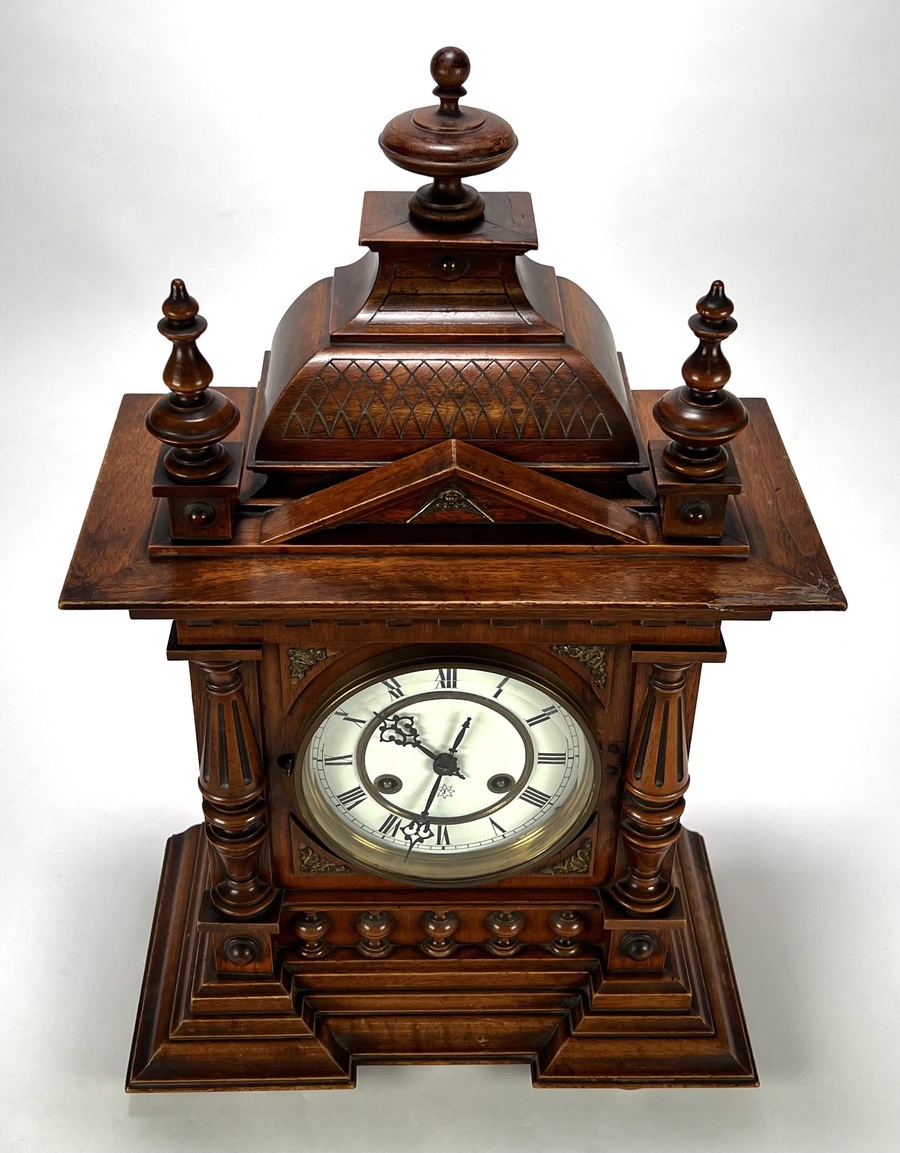 Tafelklok van Junghans, Duitse herkomst, ca. 1890–1910. Rijkgestoken eikenhouten kast in historisme-stijl met pilasters, balusters en geprofileerde kap. Het achtdaags uurwerk met ankergang slaat op een spiraalgong. De wit geëmailleerde wijzerplaat toont Romeinse cijfers en geblauwde wijzers binnen een messing lunette. Voorzien van originele opwindsleutels en architecturale bekroning met siervaasjes. |