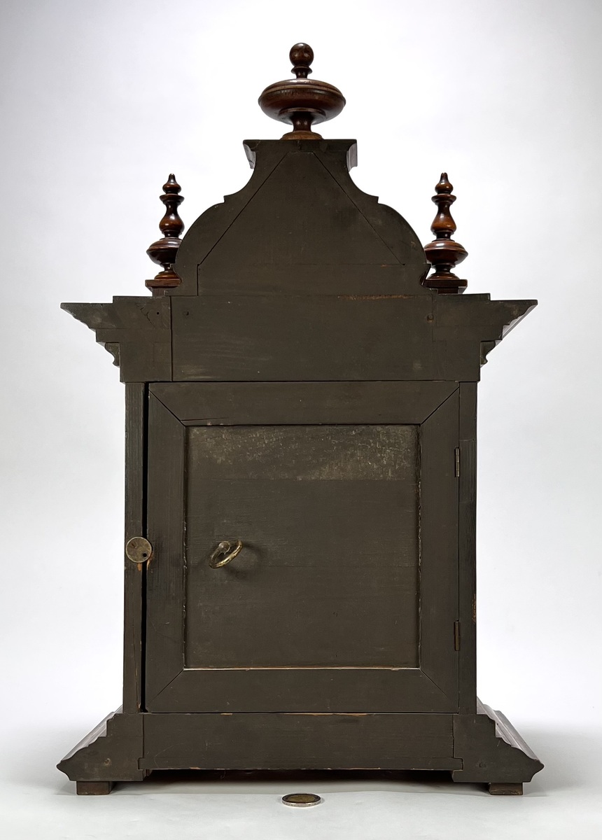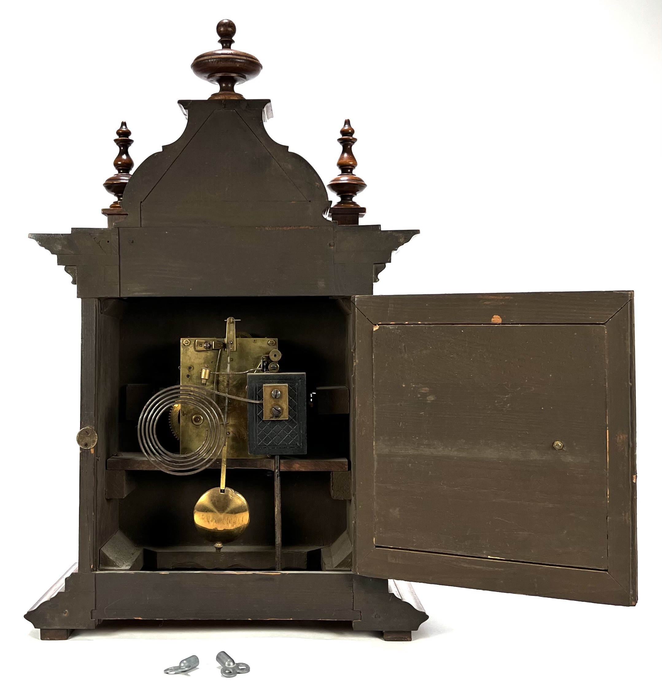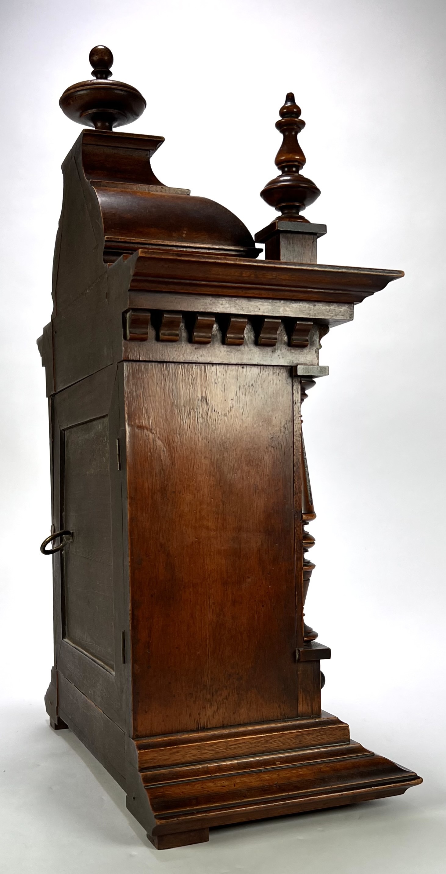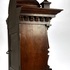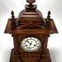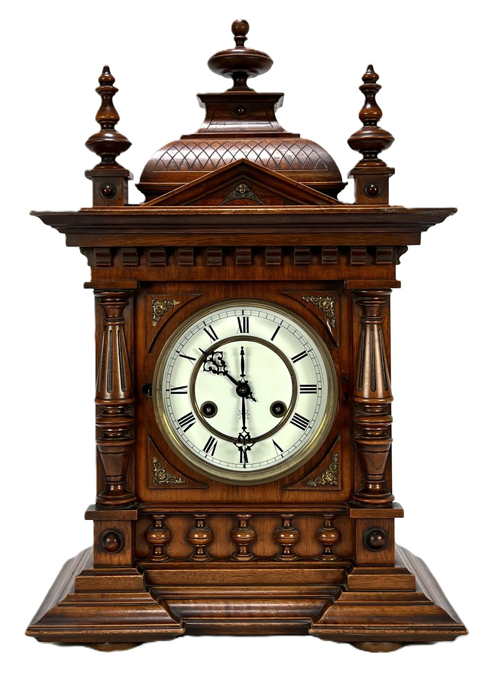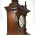 Tafelklok van Junghans, Duitse herkomst, ca. 1890–1910. Rijkgestoken eikenhouten kast in historisme-stijl met pilasters, balusters en geprofileerde kap. Het achtdaags uurwerk met ankergang slaat op een spiraalgong. De wit geëmailleerde wijzerplaat toont Romeinse cijfers en geblauwde wijzers binnen een messing lunette. Voorzien van originele opwindsleutels en architecturale bekroning met siervaasjes. |