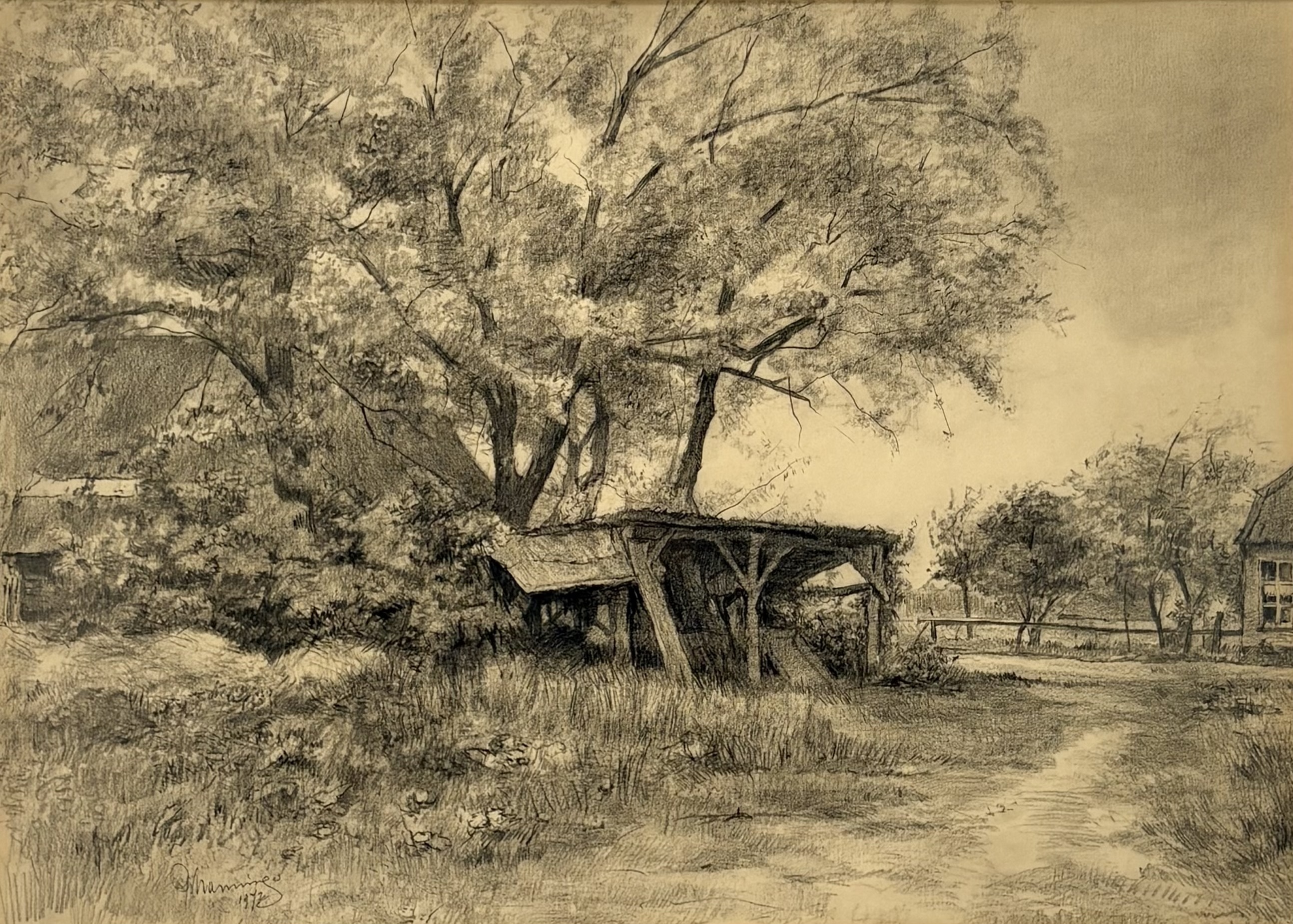 Tekening, Harm Nanninga - landelijk landschap met schuur, 1972