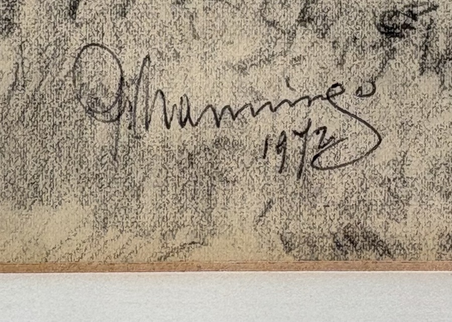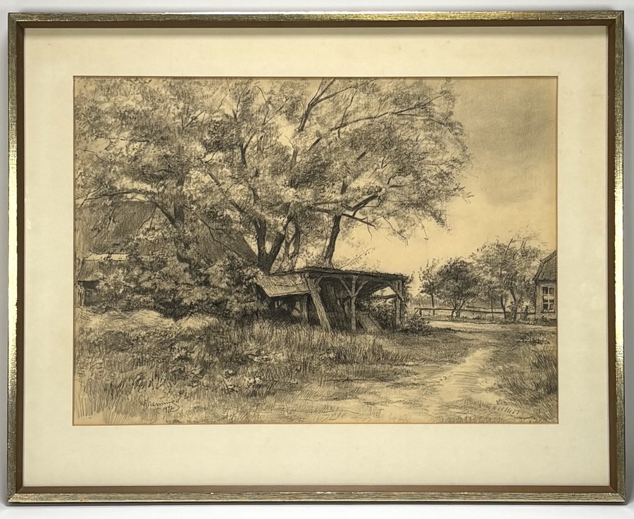 Tekening door Harm Nanninga (1906–1994) van een landelijk landschap met schuur in academisch realisme, uitgevoerd in houtskool op papier. De voorstelling vertoont een gedetailleerde compositie van bomen met een zandpad. Onduidelijk gesigneerd linksonder en gedateerd 1972. Deze tekening heeft een Nederlandse herkomst, in een goudkleurige lijst met een crème witte passe-partout. Klaar om te bieden? Registreer je nu en doe mee aan de veiling! |