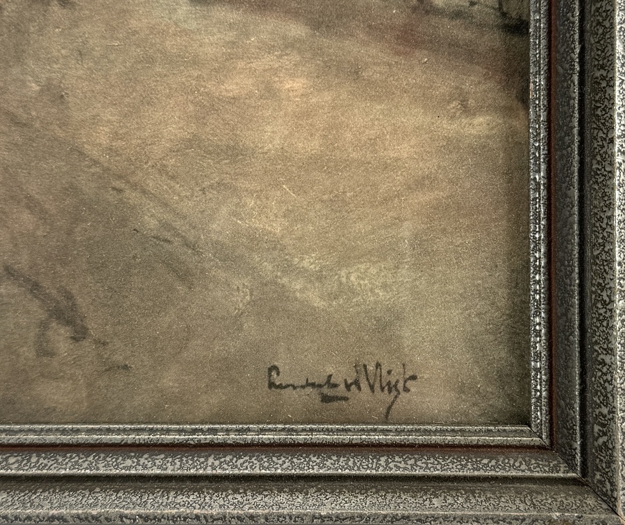Gouache op papier door Leendert van der Vlist (1894–1962), toont een Amsterdams stadsgezicht met kade in impressionistische stijl. De gouache wordt bepaald door de oeverlijn met aangemeerde schuiten en een rij monumentale trapgevels. Rechtsonder gesigneerd, datering circa 1930 en een Nederlandse herkomst. Eerst deze gouache zien voordat je biedt? Bezoek onze kijkdagen op 10, 11 en 12 april! |