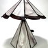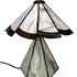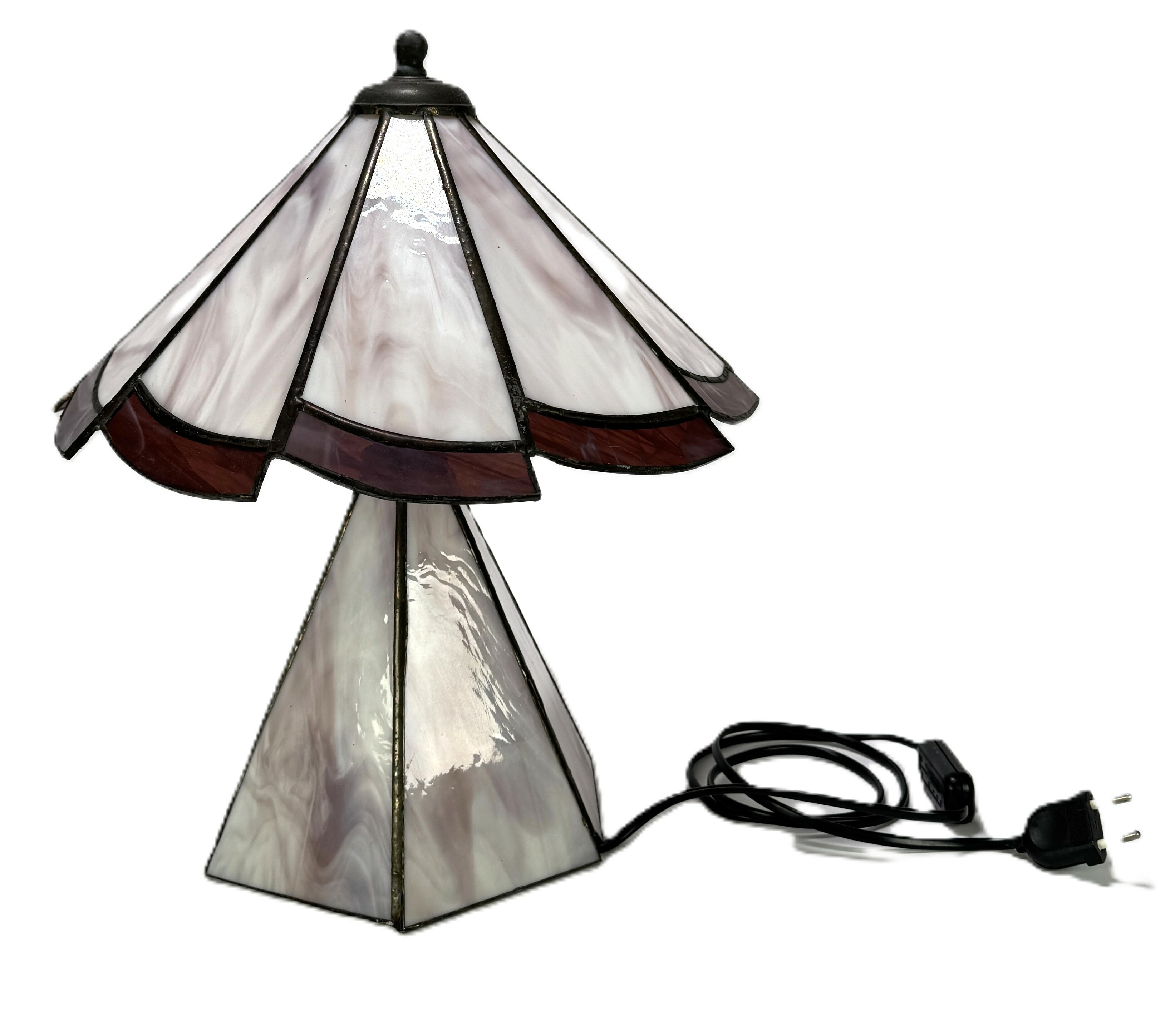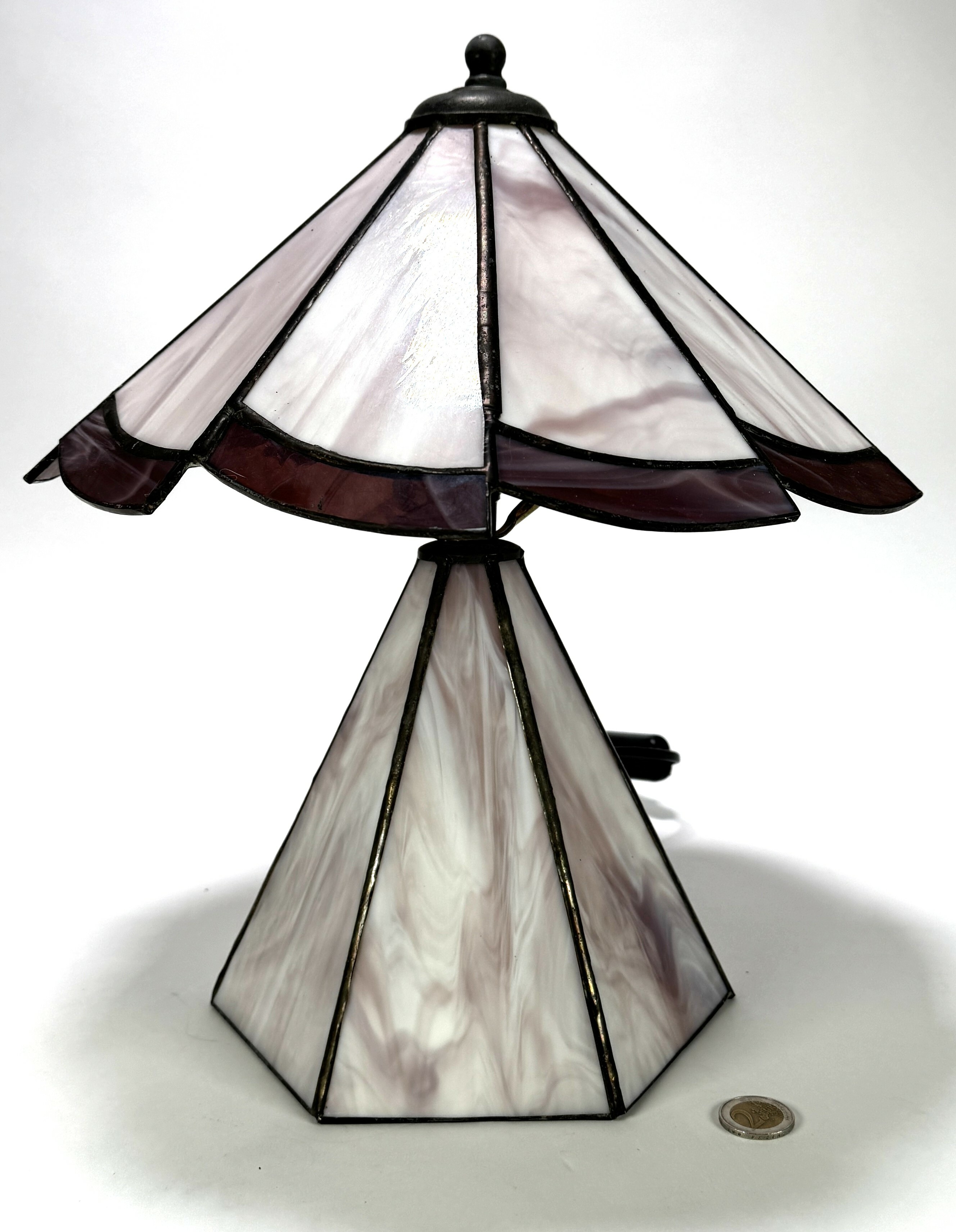 Lamp in Tiffany-stijl, vervaardigd uit glas-in-lood met een geometrisch decor van paarse en melkwitte glaspanelen. De kap toont een repetitief patroon van ruitvormige segmenten boven een voet in piramidevorm. De lamp dateert uit het laatste kwart van de 20e eeuw en heeft een Europese herkomst. Klaar om te bieden? Registreer je nu en doe mee aan de veiling! |