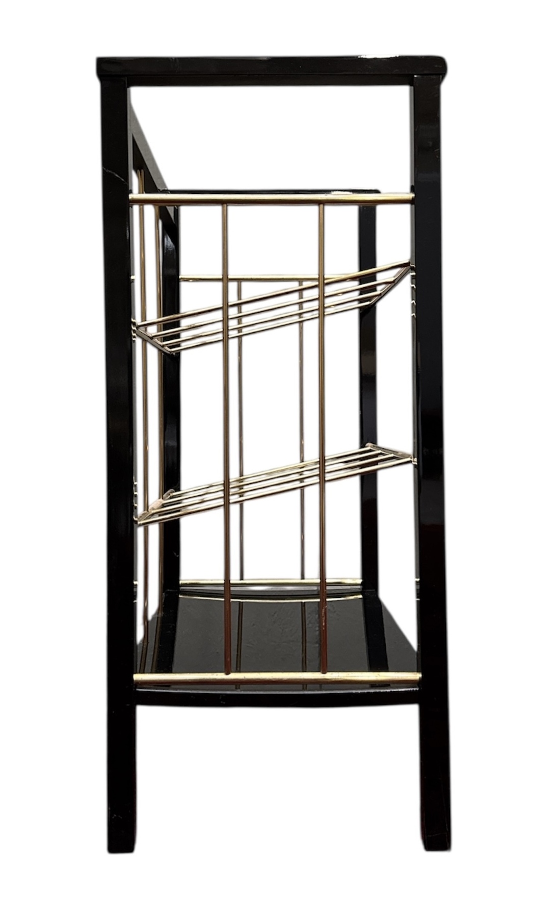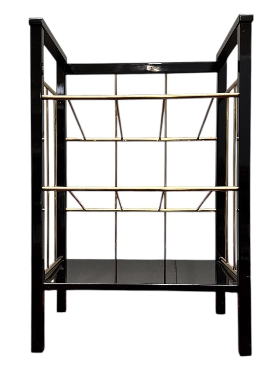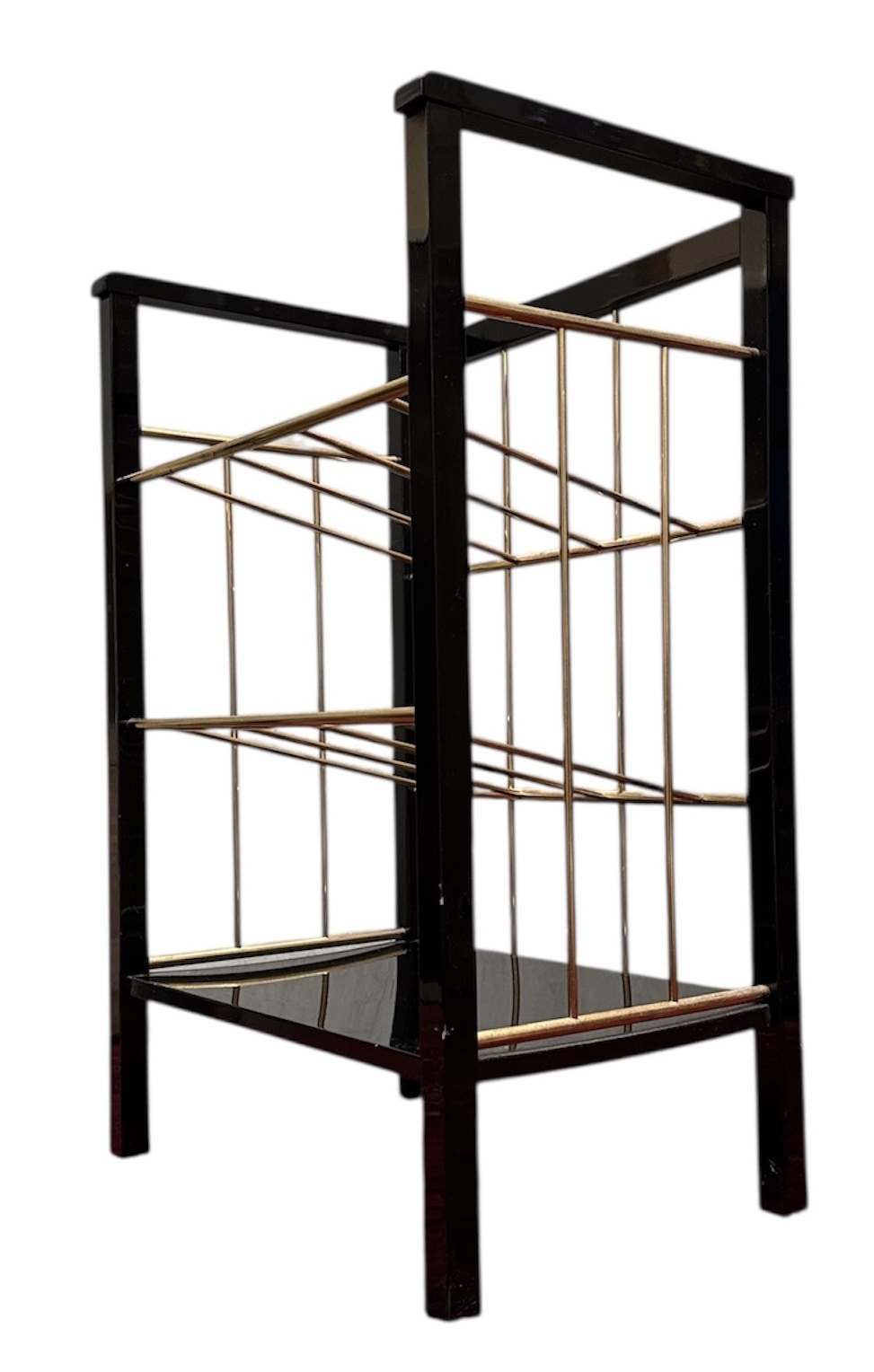 Tijdschrifthouder in Art Deco stijl, vervaardigd uit hout en messing met twee schuine compartimenten voor lectuur. De geometrische constructie is voorzien van een houten onderblad in zwart hoogglans. De tijdschriftenhouder dateert uit de 21e eeuw en heeft een West-Europese herkomst. Registreer nu en bied eenvoudig online mee op dit tijdschriftenrek! |