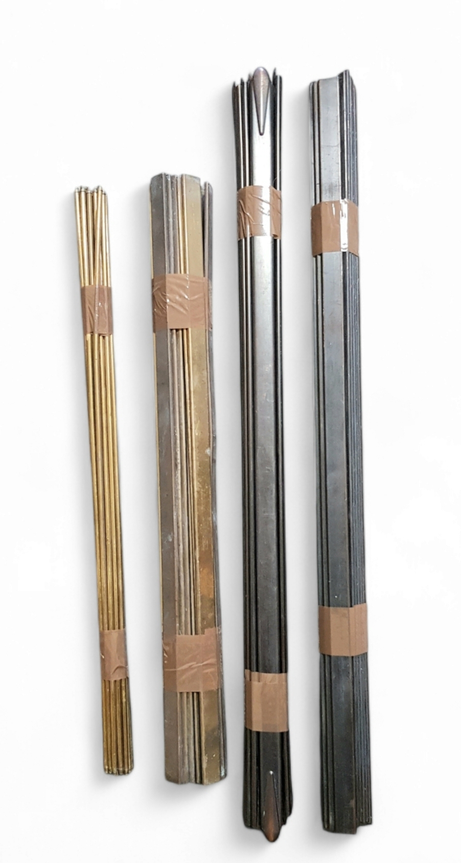 Traploper roedes vervaardigd uit messing en wit metaal met getrokken en geribde profielen. De verzameling omvat staven met ronde, zeskantige en vlak gefacetteerde doorsneden, deels met sleufkop-einden voor bevestiging. Datering 20e eeuw en Europese herkomst. Geïnteresseerd? Bezoek onze kijkdagen op 10, 11 en 12 april van 11:00 tot 17:00 uur! |