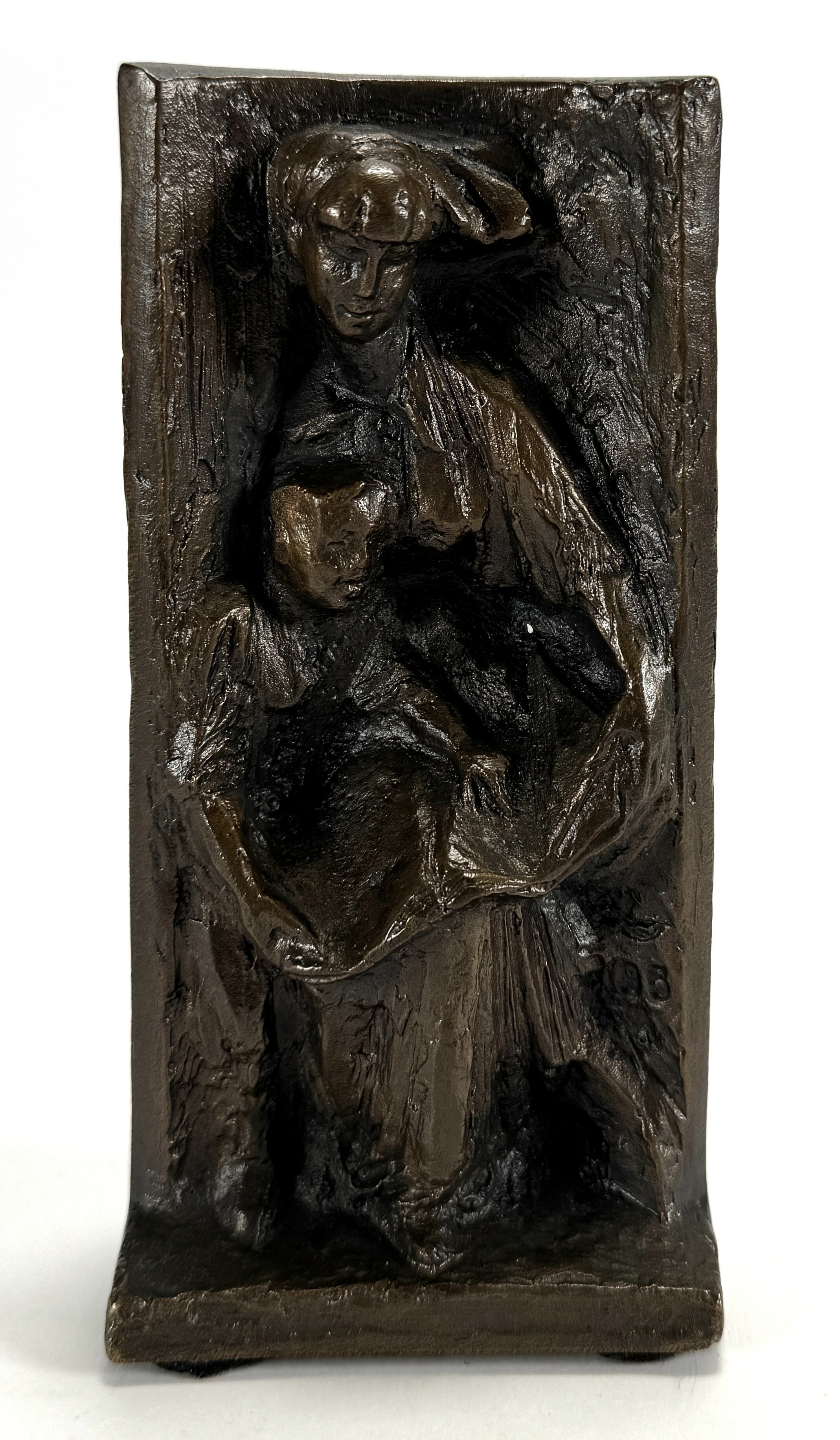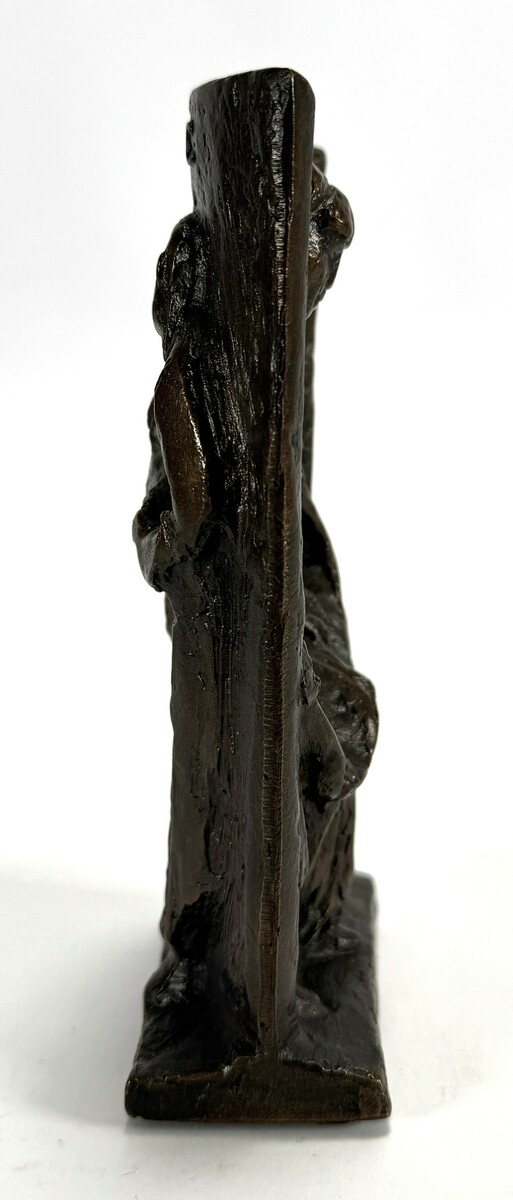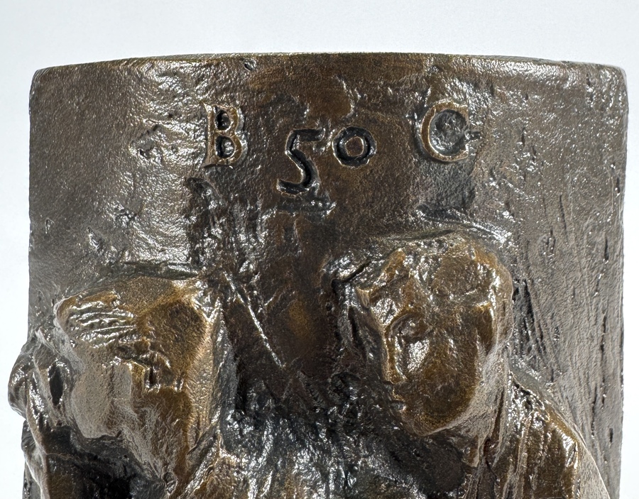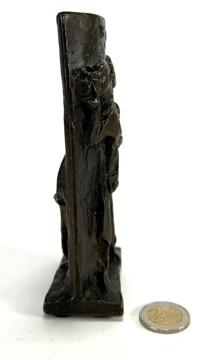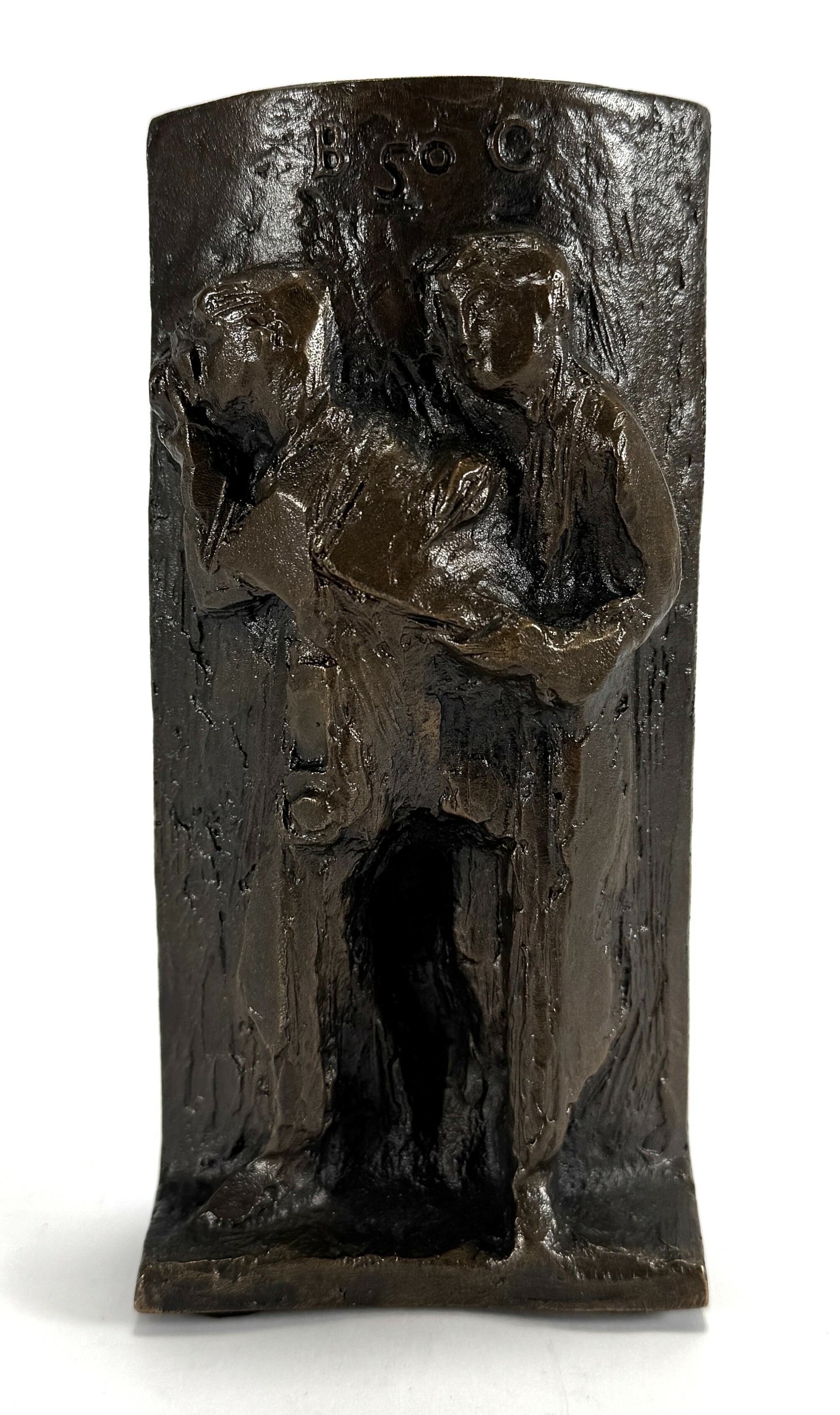 Tweezijdig bronzen beeld in modernistische stijl, vervaardigd uit brons met gegoten reliëf op een smalle, staande plaquettevorm. Aan weerszijden zijn geabstraheerde figuren in diepe, ruwe modellering weergegeven, waaronder een vrouwelijke figuur met kind. Gemerkt ‘B 50 G’ op de ene zijde en ‘95’ op de andere. Dit beeld dateert uit 1995 en heeft een Europese herkomst. Registreer nu en bied eenvoudig online mee op dit beeld! |