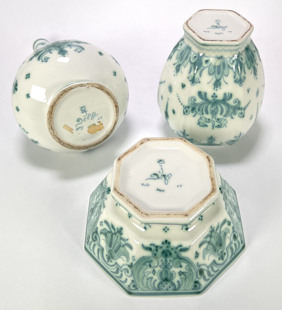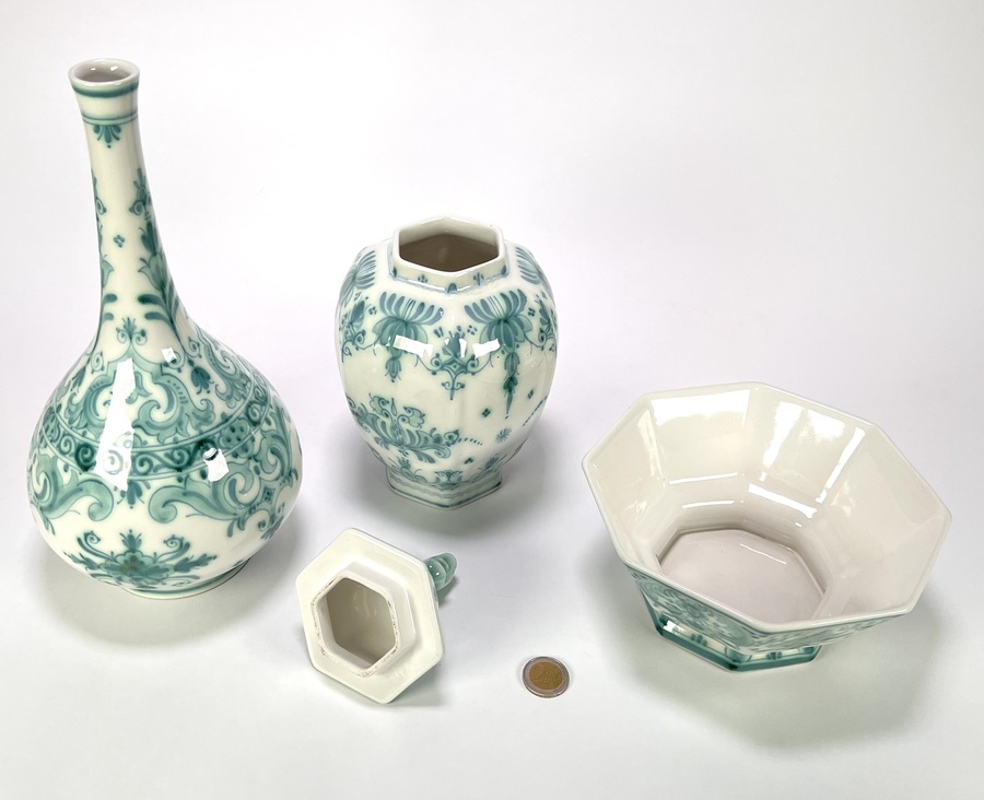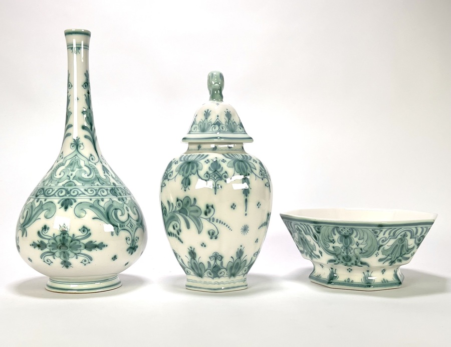 Lot aardewerk van De Porceleyne Fles met handgeschilderd Delvert groen decor; een flesvaas, dekselpot met leeuwtje en een achthoekige kom. De set dateert uit 1969–1974 en heeft een Nederlandse herkomst. Alle delen zijn aan de onderzijde volledig gemerkt. Geïnteresseerd? Bezoek onze kijkdagen op 10, 11 en 12 april van 11:00 tot 17:00 uur! |