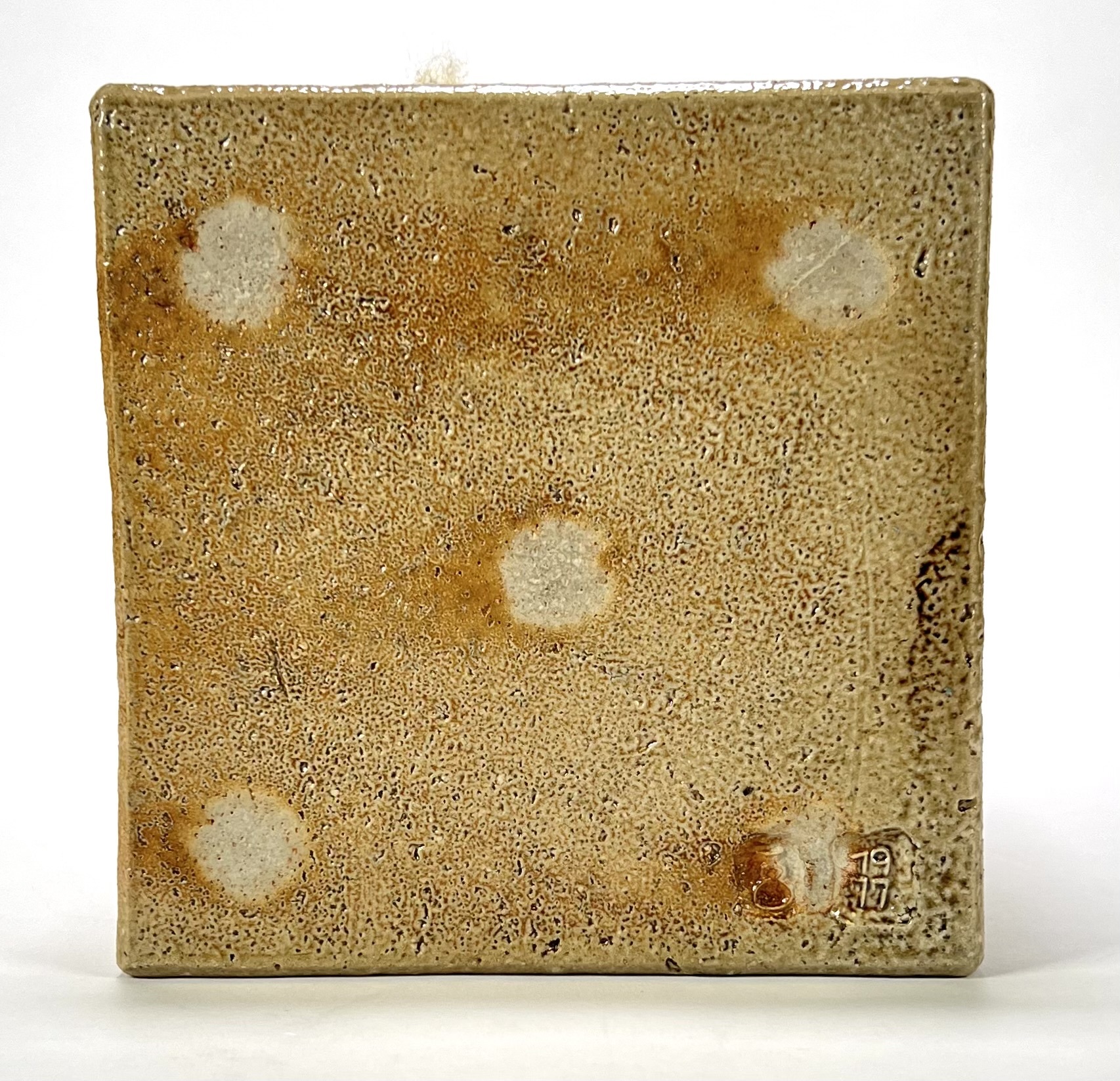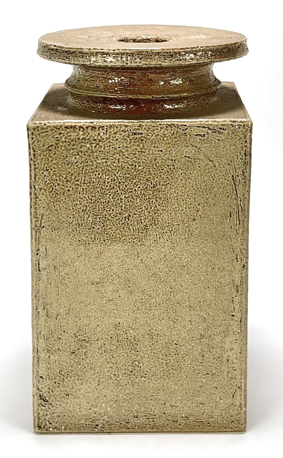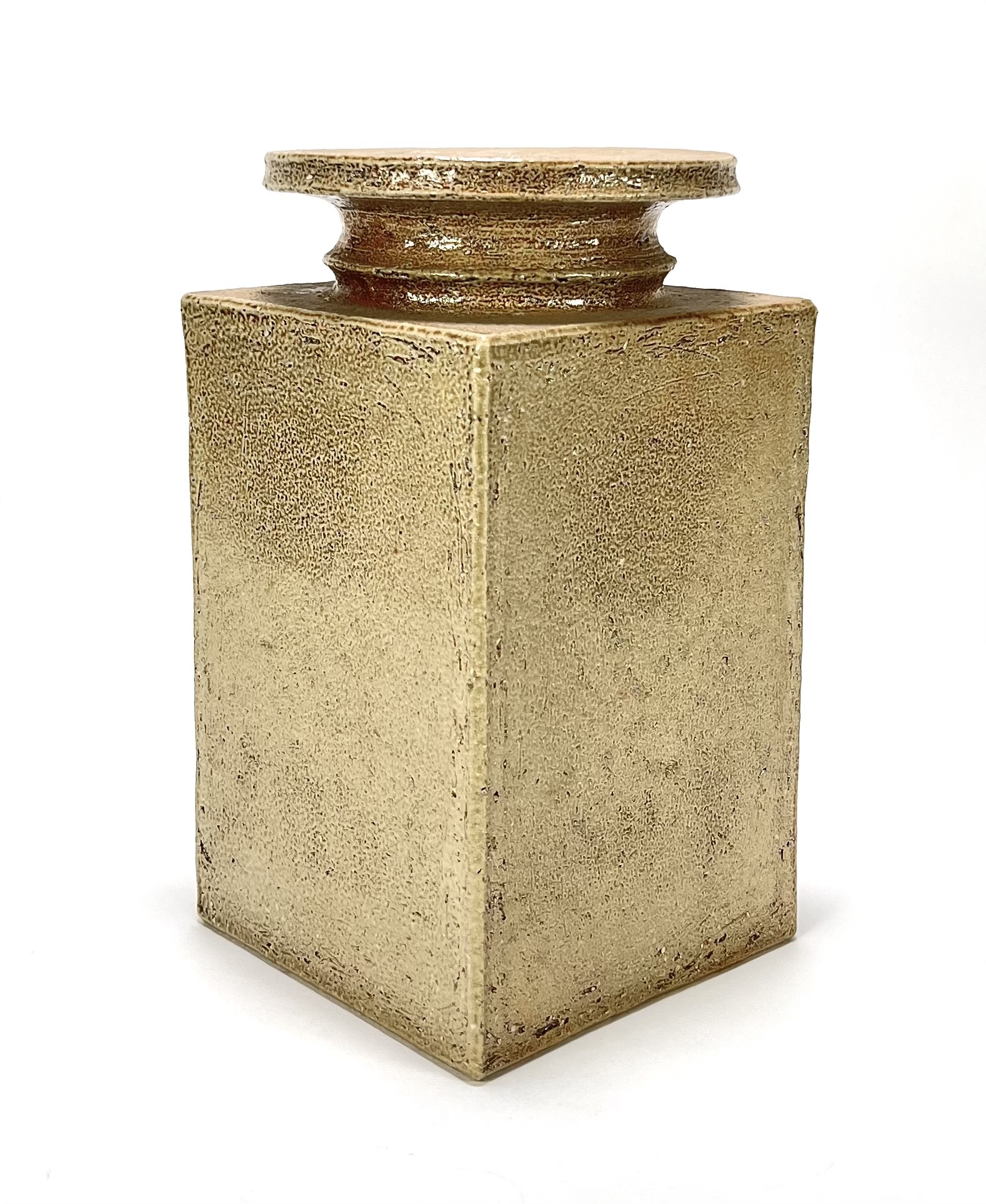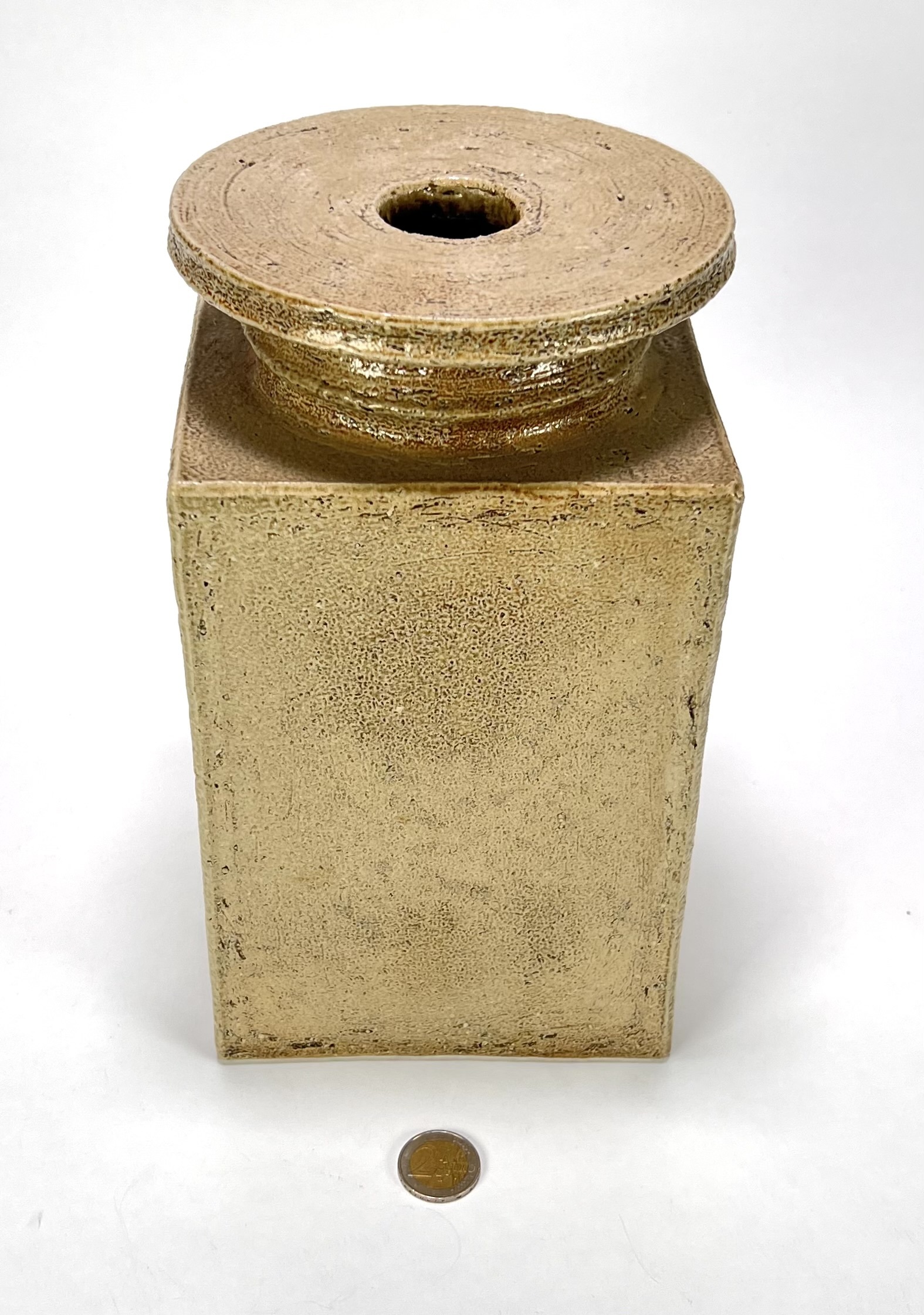 Vaas vervaardigd uit steengoed met grove, gepuncteerde textuur onder een matbeige zoutglazuur. De ronde hals contrasteert met de vierkante basis. Onderzijde gemerkt, datering circa 1970 en een West-Europese herkomst. Deze vaas zelf beoordelen? Je bent welkom op onze kijkdagen op 10, 11 en 12 april! |