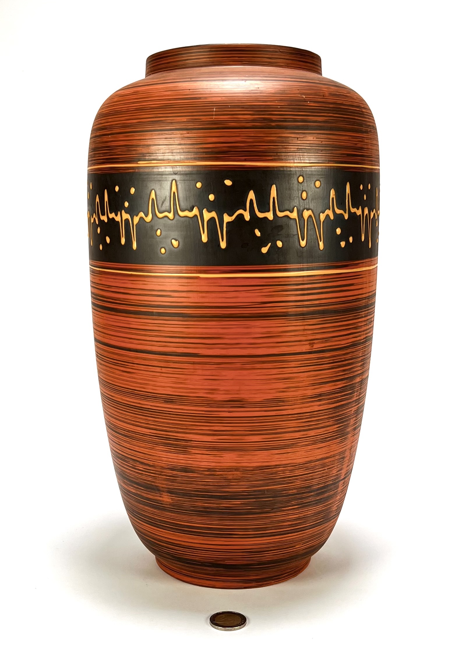 Vaas van Carstens Tönnieshof vervaardigd uit aardewerk met het Ankara-decor. De cilindrische vaas toont een grafisch patroon met antracietkleurige glazuren. Gemerkt aan de onderzijde met reliëfopdruk en modelnummer. De vaas dateert uit circa 1965 en heeft een West-Duitse herkomst. Geïnteresseerd? Bezoek onze kijkdagen op 10, 11 en 12 april van 11:00 tot 17:00 uur! |