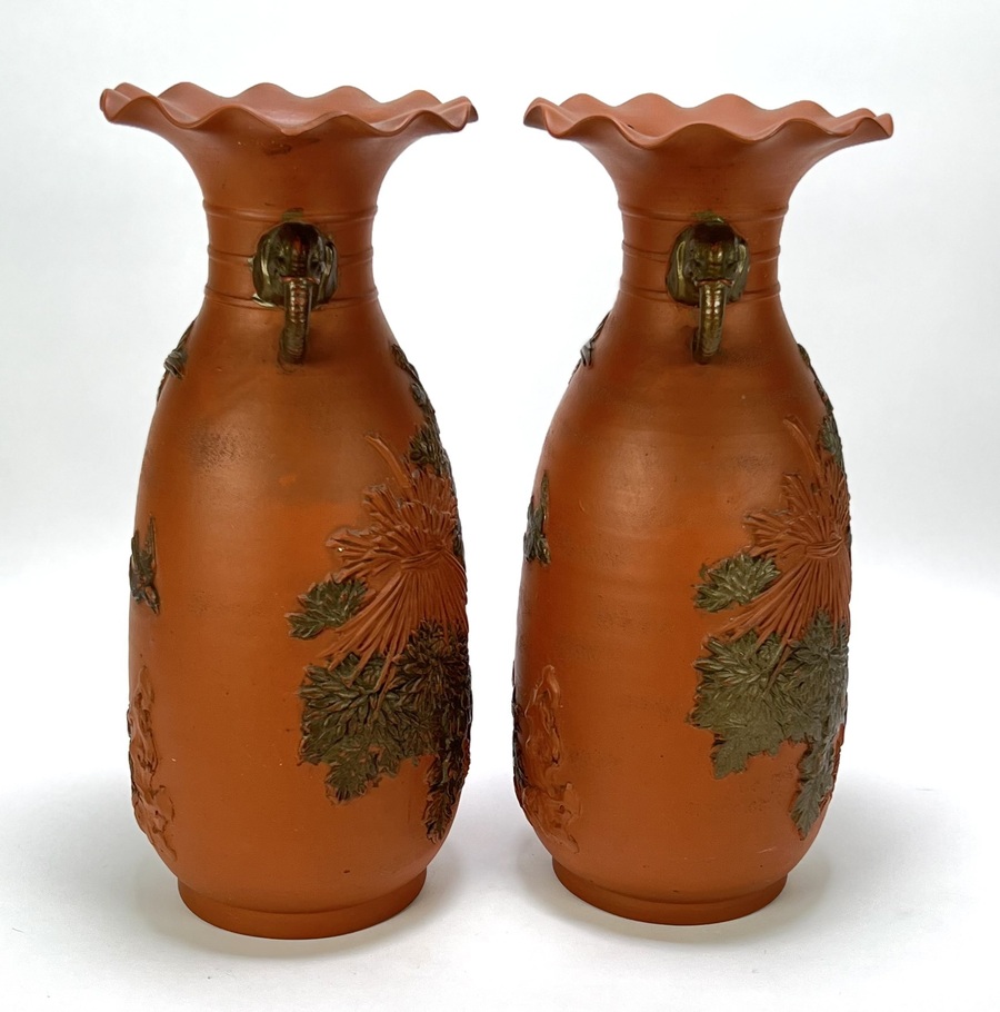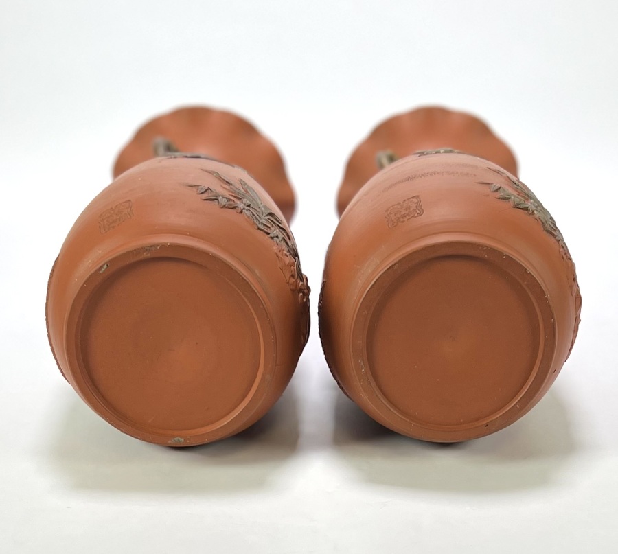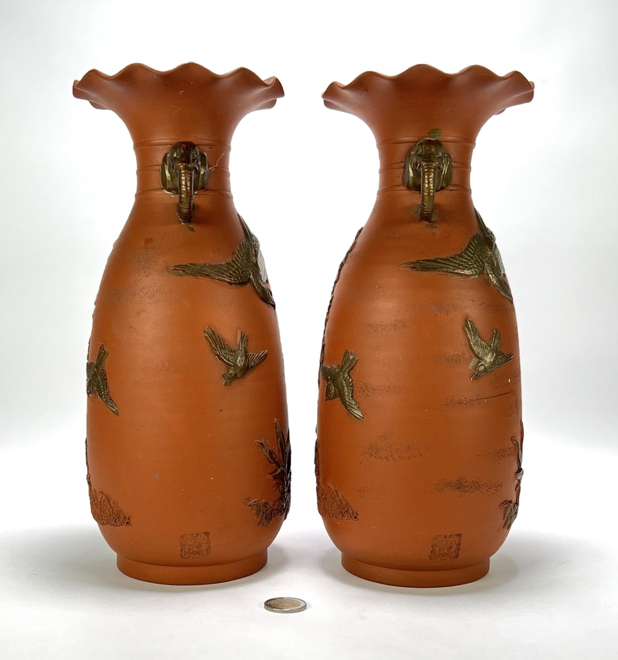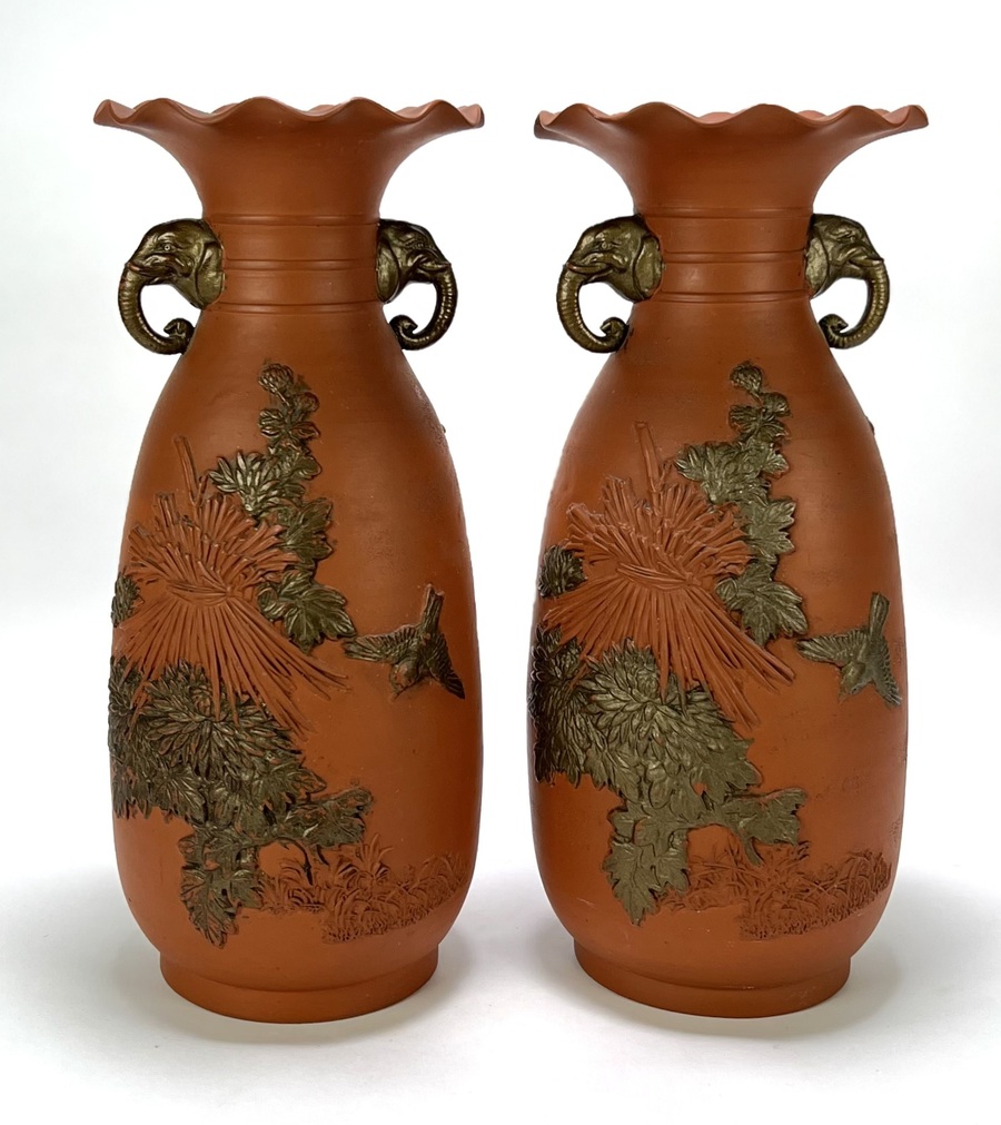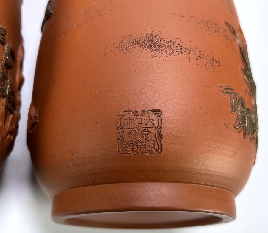 Vazen van Tokoname uit de Meiji-periode, vervaardigd uit ongeglazuurd terracotta met decors in hoog reliëf. De vazen tonen gedetailleerde voorstellingen van vliegende vogels en chrysanten, geaccentueerd met een metaalachtige patina. Kenmerkend zijn de handgrepen in de vorm van olifantenkoppen en de geschulpte mondingsranden. Gemerkt met een Japans zegelstempel, de vazen dateren uit circa 1900 en hebben een Japanse herkomst. Klaar om te bieden? Registreer je nu en doe mee aan de veiling! |