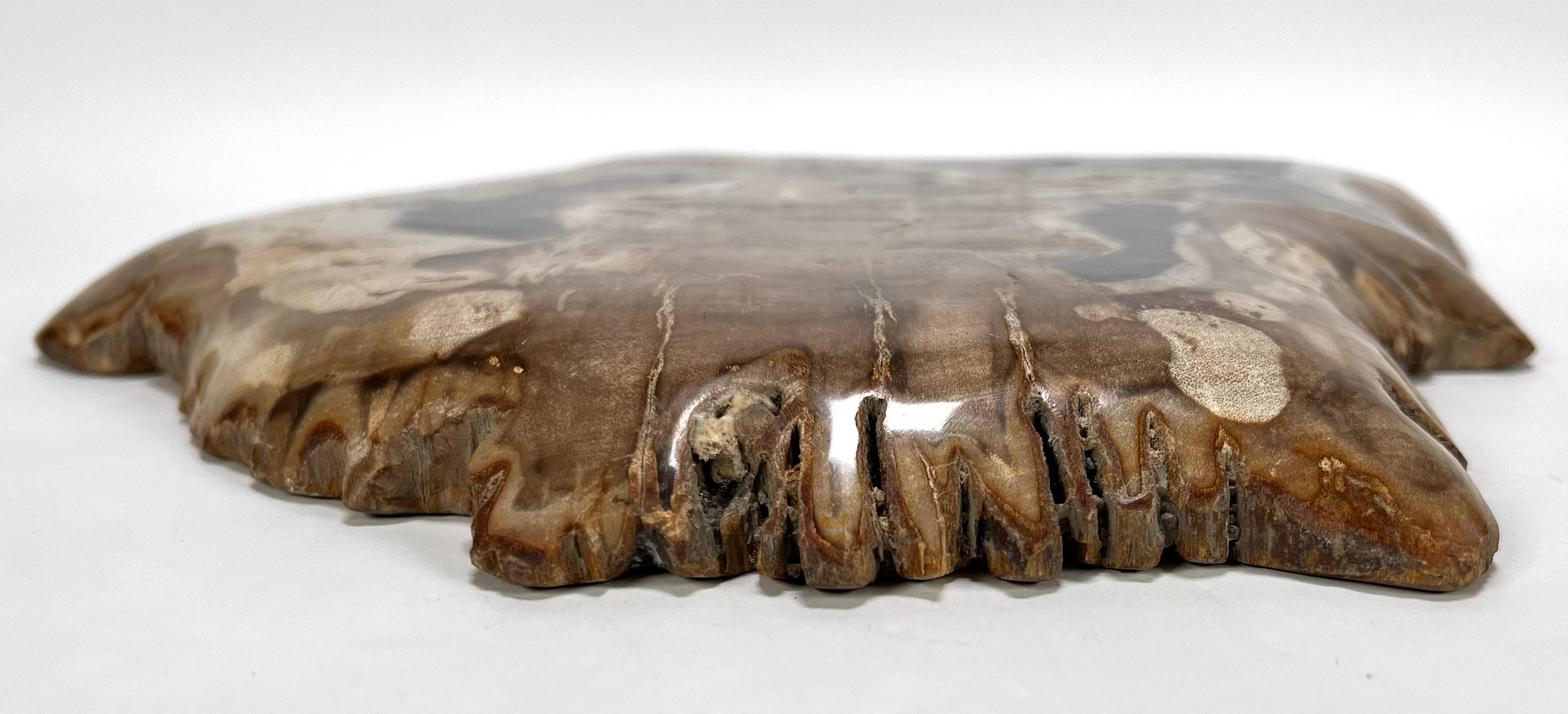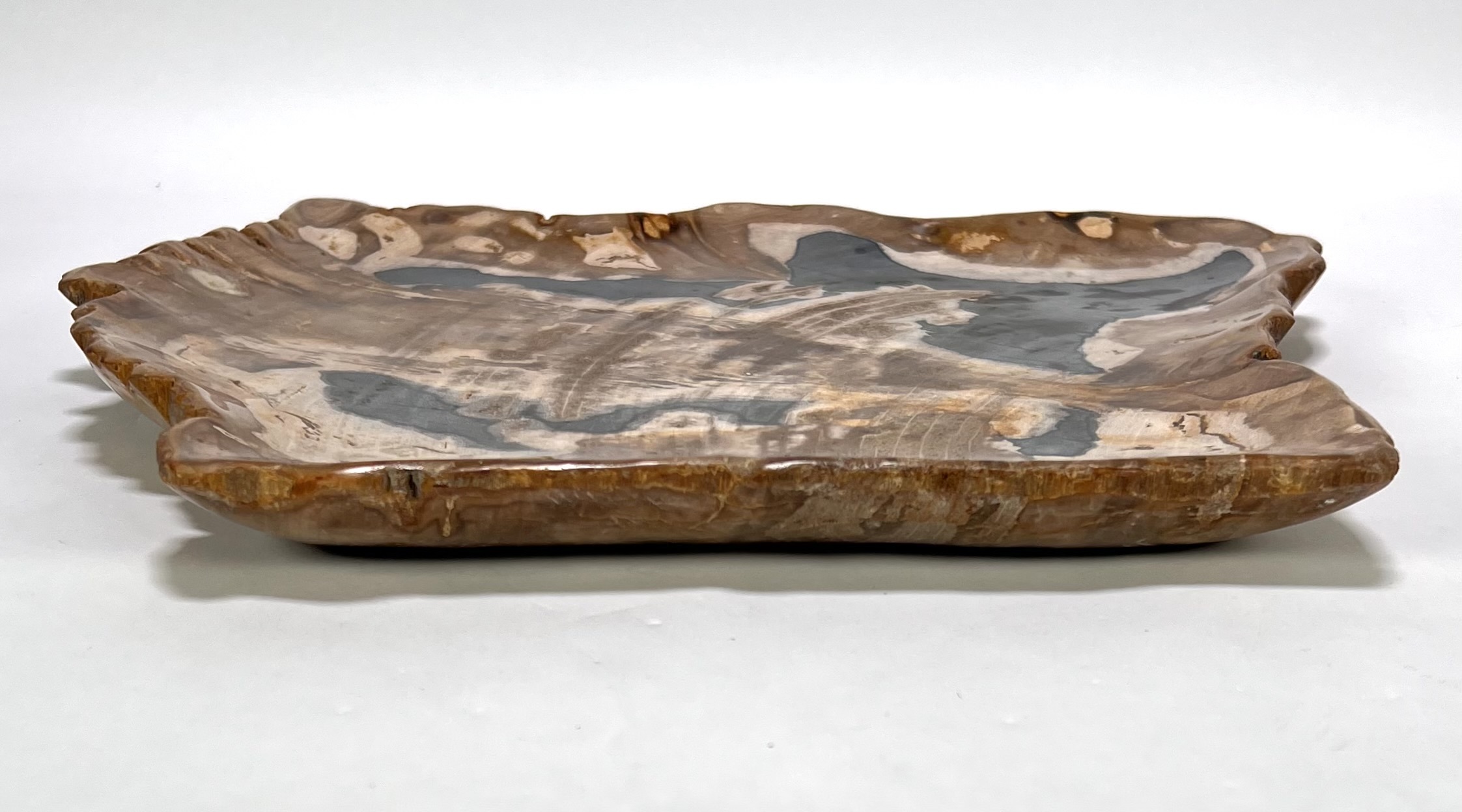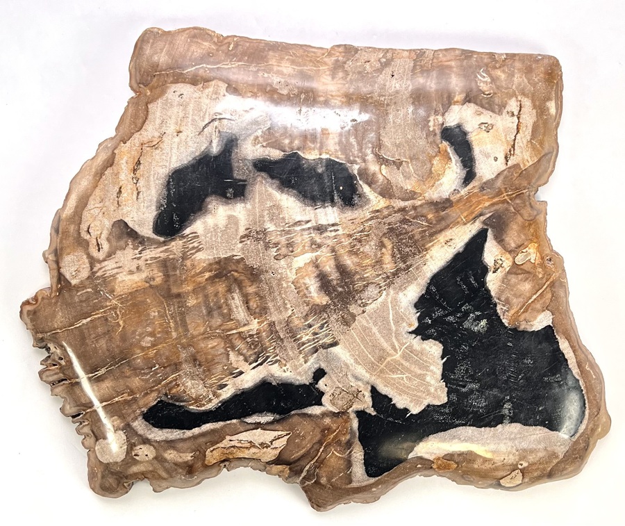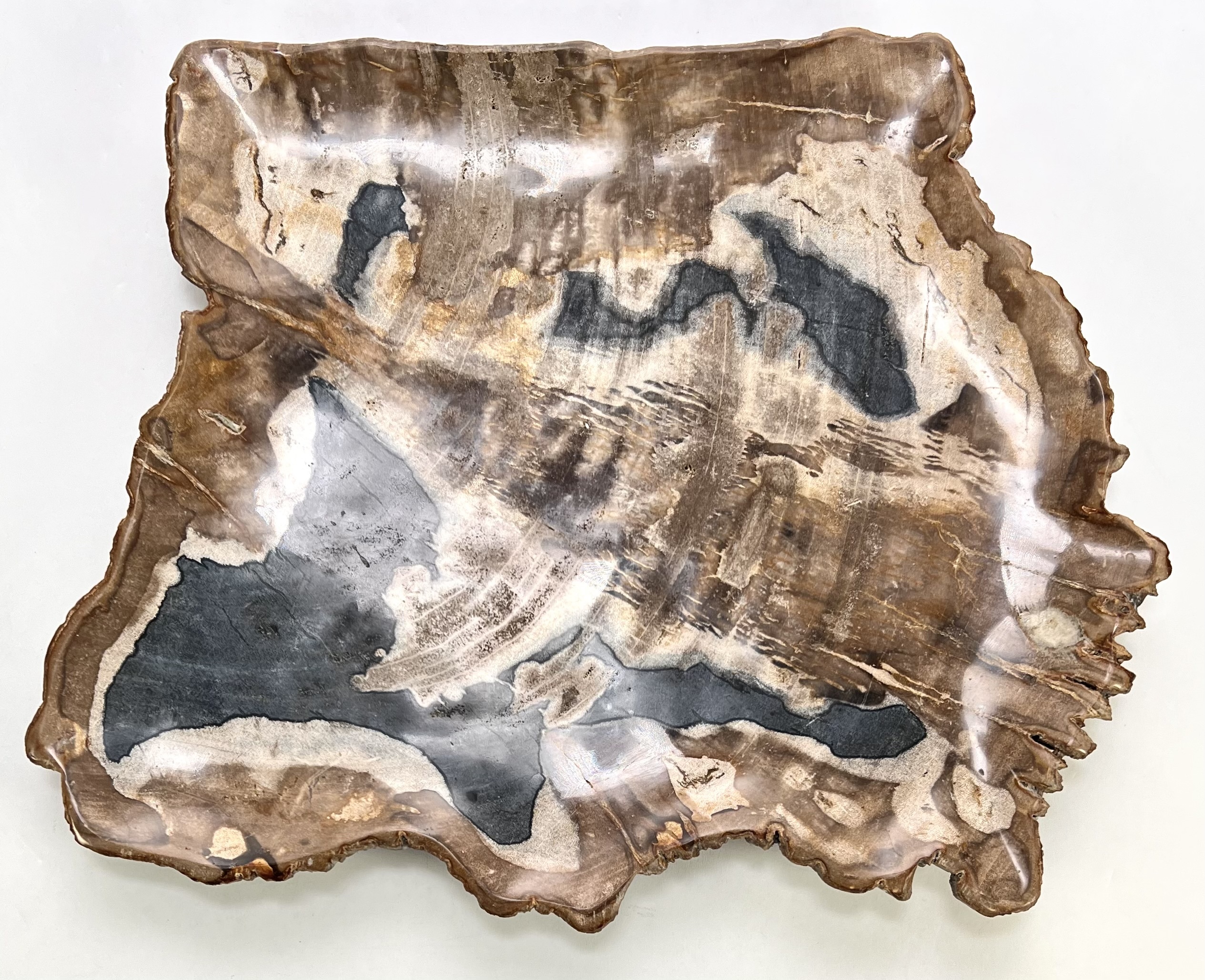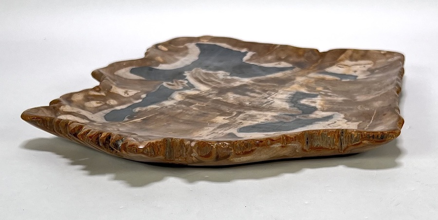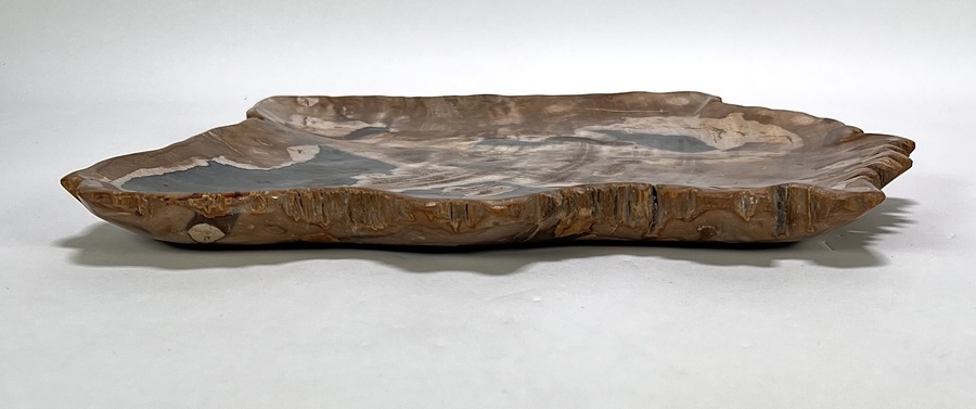 Schaal in hedendaagse stijl, vervaardigd uit versteend hout met een hoogglans gepolijst oppervlak. Het versteend hout toont een natuurlijk kleurenspel van zwarte, bruine en witte kwartskristallen die de oorspronkelijke houtstructuur miljoenen jaren geleden hebben vervangen. De grillige buitenranden contrasteren met het gladde binnenvlak. Kom langs tijdens de kijkdagen (10 t/m 12 april) en ontdek deze schaal zelf! |