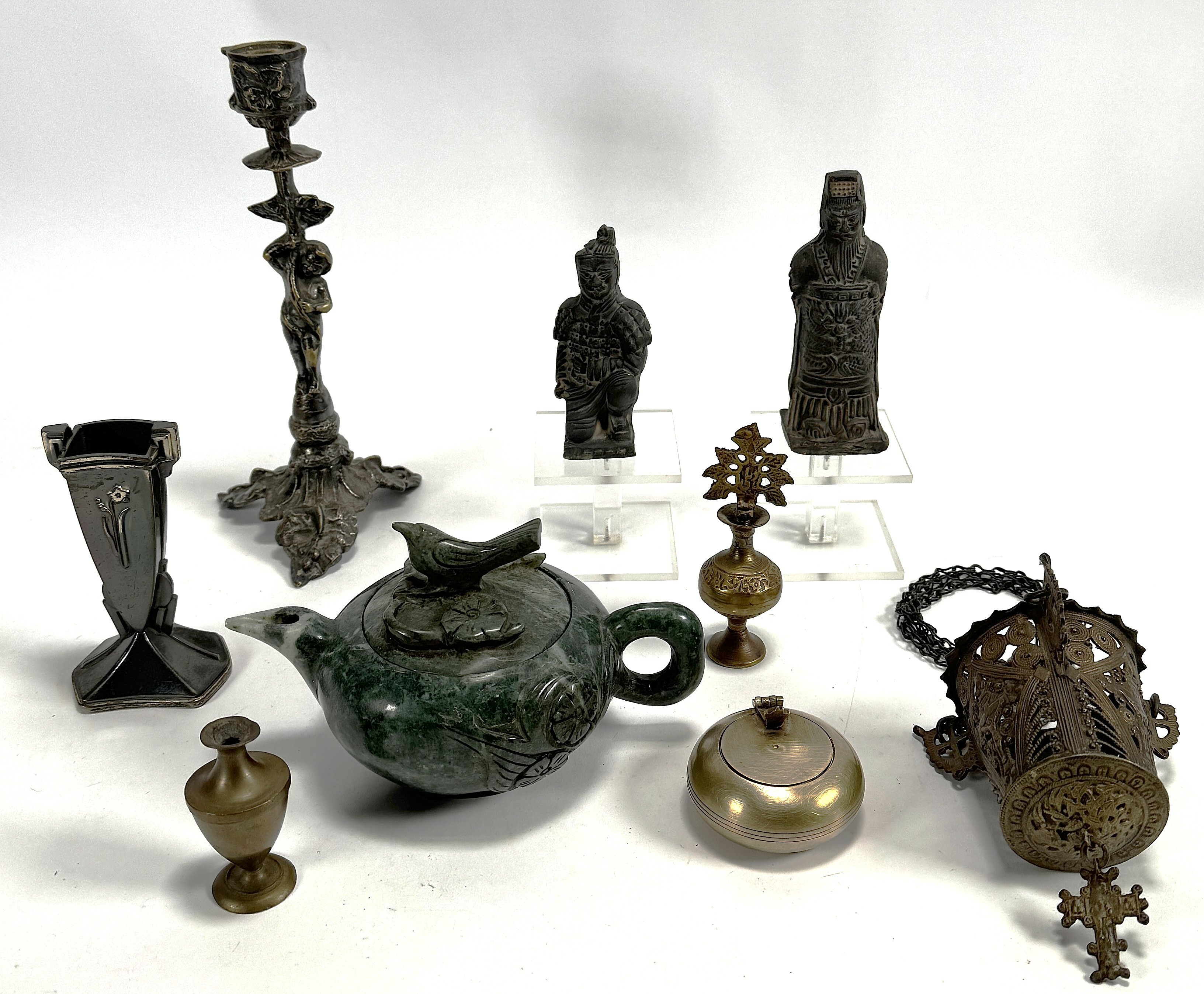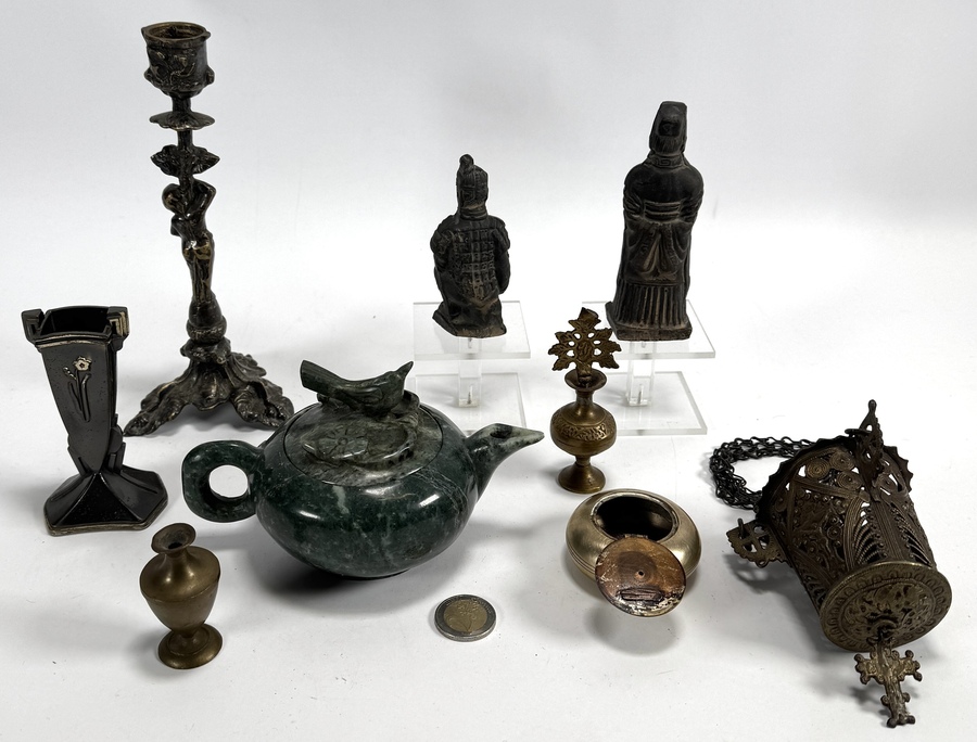 Verzameling Aziatica en religieuze curiosa uit de 20e eeuw, vervaardigd uit jade, messing, koper en terracotta. De kavel omvat een onder andere een theepot, twee terracotta krijgers, een hangend wierookvat met kruismotief en een messing kandelaar met cherubijnfiguur. De verzameling dateert uit circa 1920-1980. Zeker zijn van deelname? Plaats vanaf 3 april een schriftelijk bod online! |