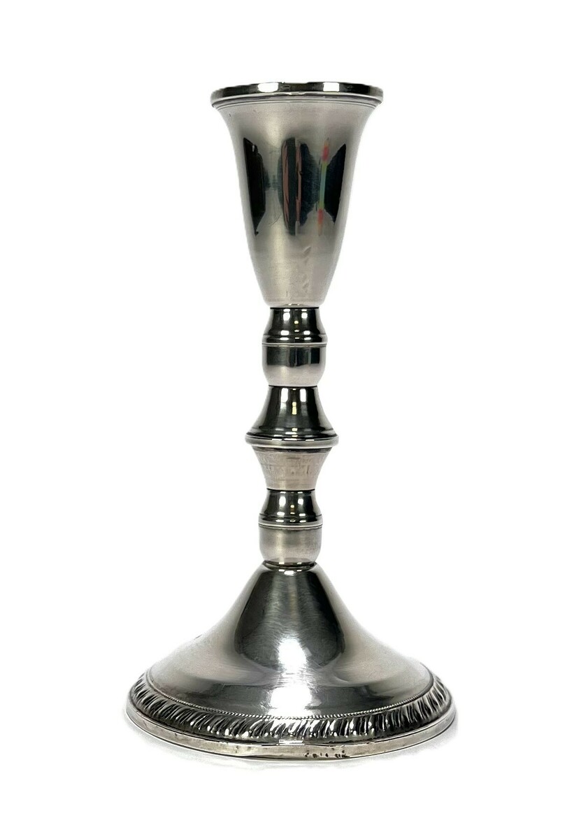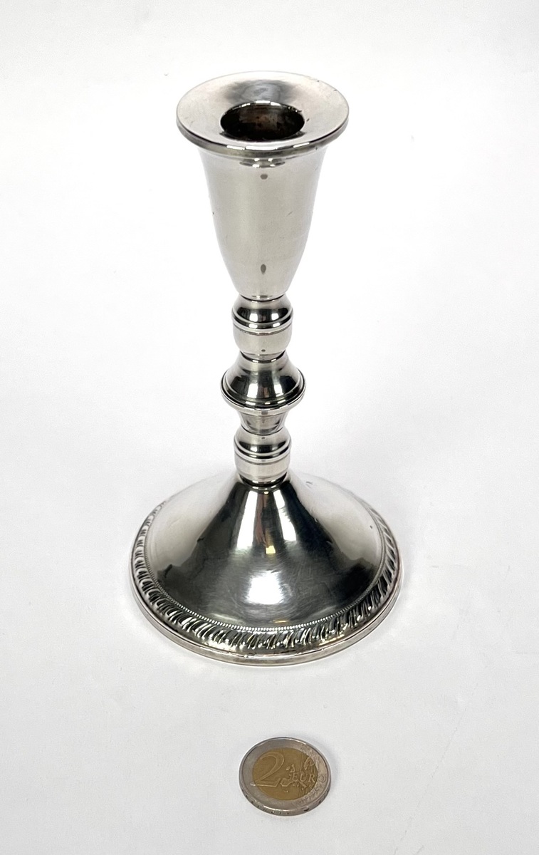 Zilveren kandelaar van Duchin Creations uit midden 20e eeuw vervaardigd uit Sterling zilver. De kandelaar is uitgevoerd met een verzwaarde voet voor stabiliteit en toont een conische balustervorm, de voetrand is voorzien van een geciseleerde kabelrand-decoratie. Onderzijde Amerikaanse zilvermerken van de fabrikant Duchin Creations, herkomst Verenigde Staten. Wil je deze kandelaar in het echt bekijken? Kom naar de kijkdagen! |