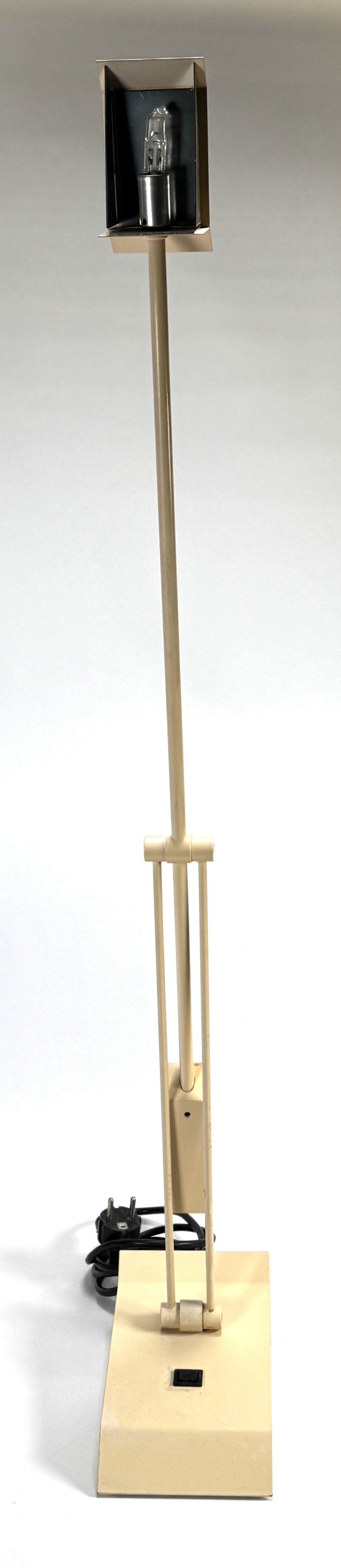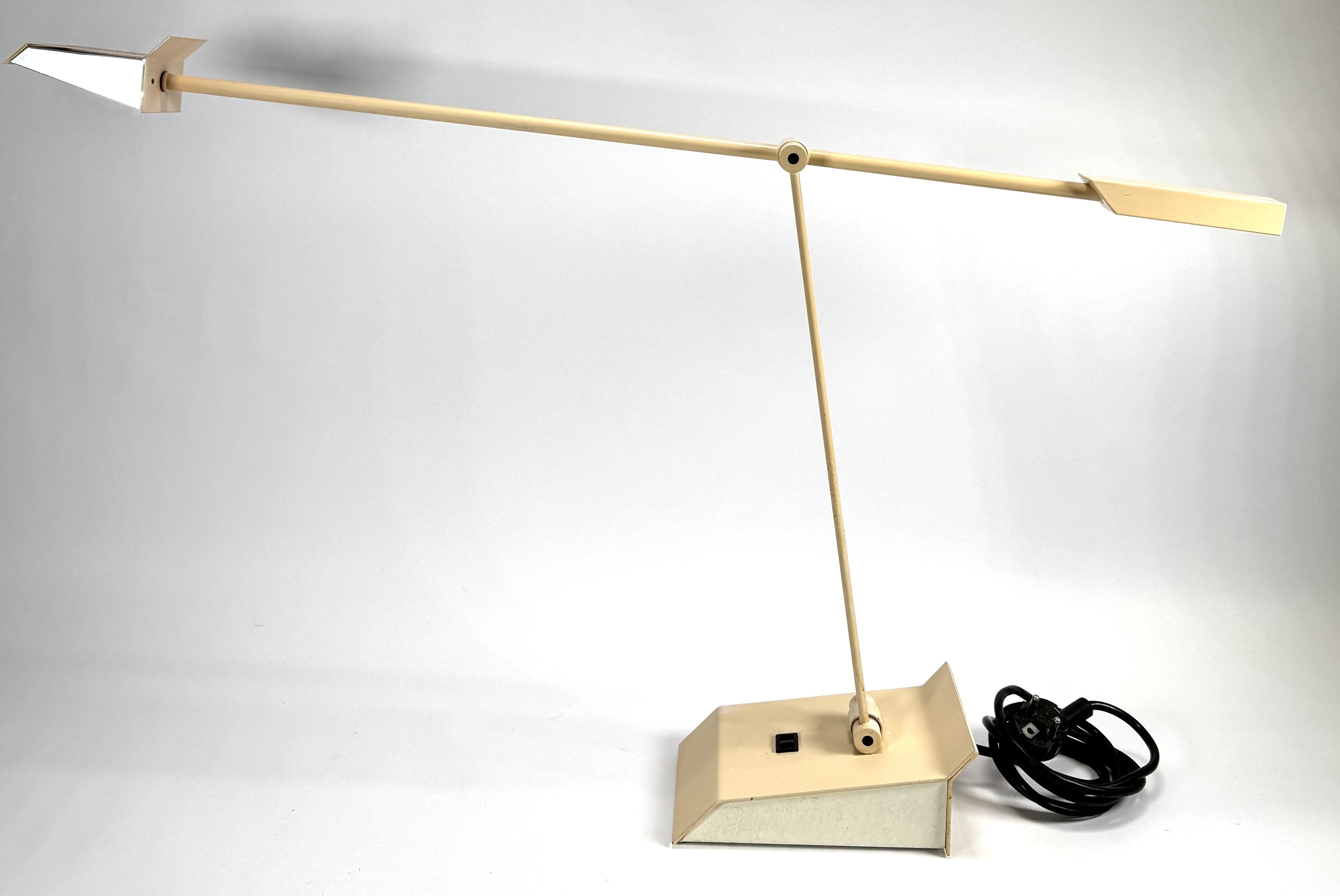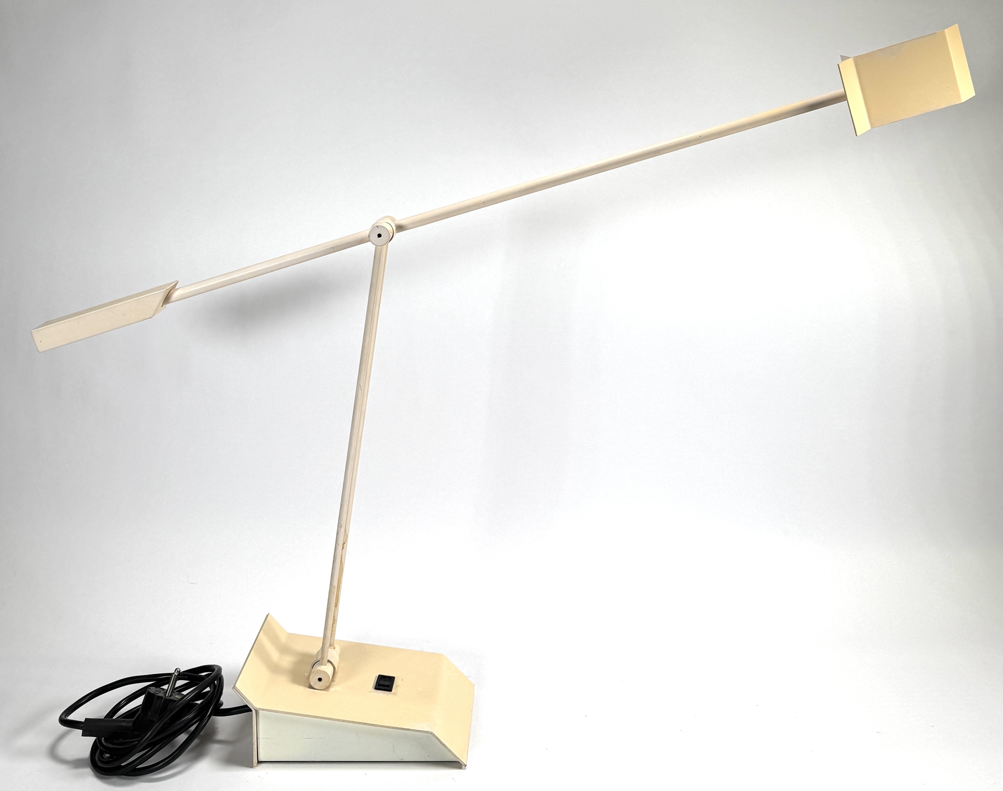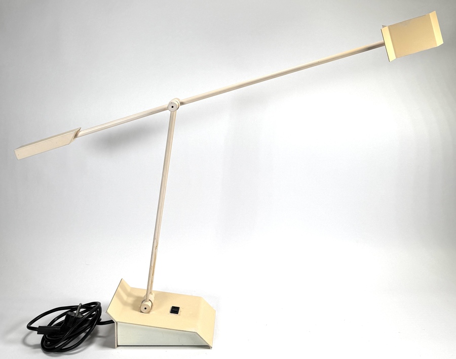 Vintage bureaulamp uit de modernistische periode, vervaardigd uit crème wit gepoedercoat messing en kunststof. De lamp kenmerkt zich door een functionele, tweeledige knikarm en een verstelbare kap voor gerichte verlichting. De lamp dateert uit circa 1965 en heeft een Oost-Europese herkomst uit de Sovjet-era. Geïnteresseerd? Bezoek onze kijkdagen op 10, 11 en 12 april van 11:00 tot 17:00 uur! |