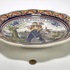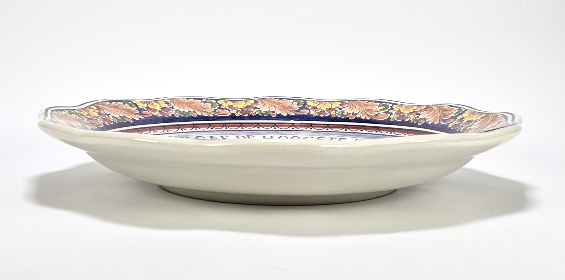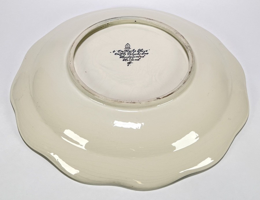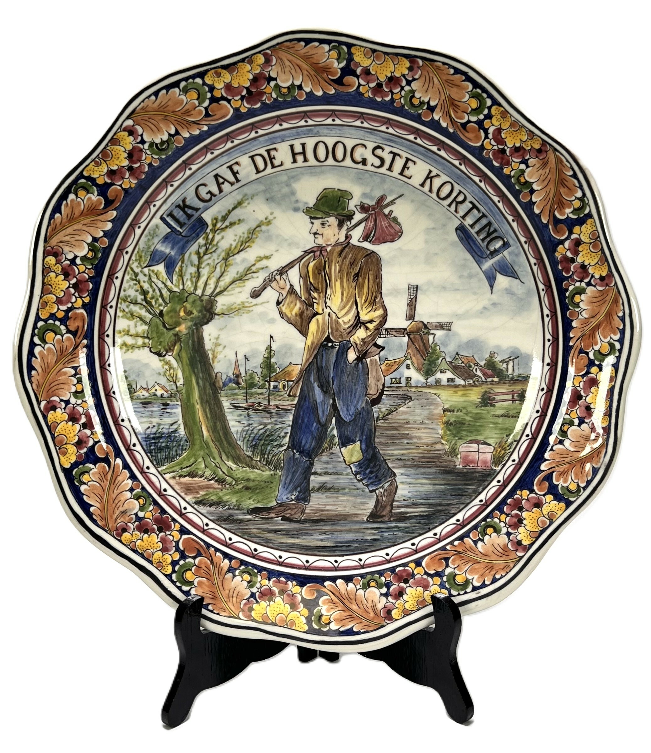 Wandbord van ’t Delftsche Huys, vervaardigd uit tinglazuur aardewerk met handbeschilderd decor. Centraal een wandelende man met knapzak in Hollands landschap met molen en dorpsgezicht, tekst "Ik gaf de hoogste korting", omgeven door een geschulpte rand met blad- en bloemranken in kobaltblauw, oker en ijzerrood. Gemerkt aan de onderzijde met kroonembleem. Het wandbord dateert uit de eerste helft van de 20e eeuw en heeft een Delftse herkomst. Wil je direct deelnemen? Plaats vanaf 3 april alvast een schriftelijk bod via onze website! |
