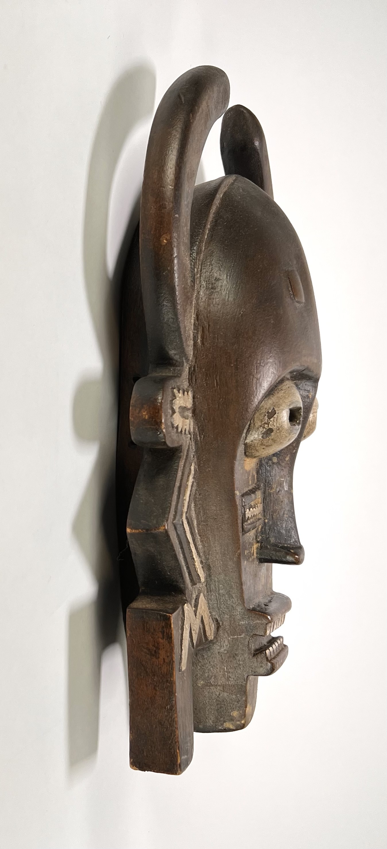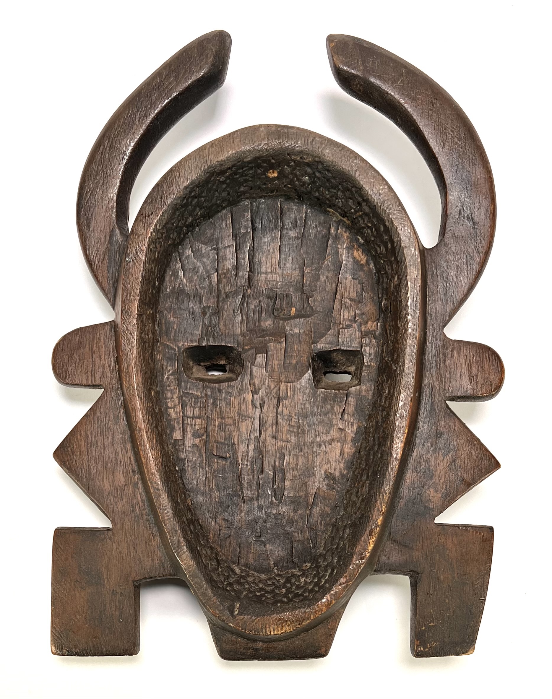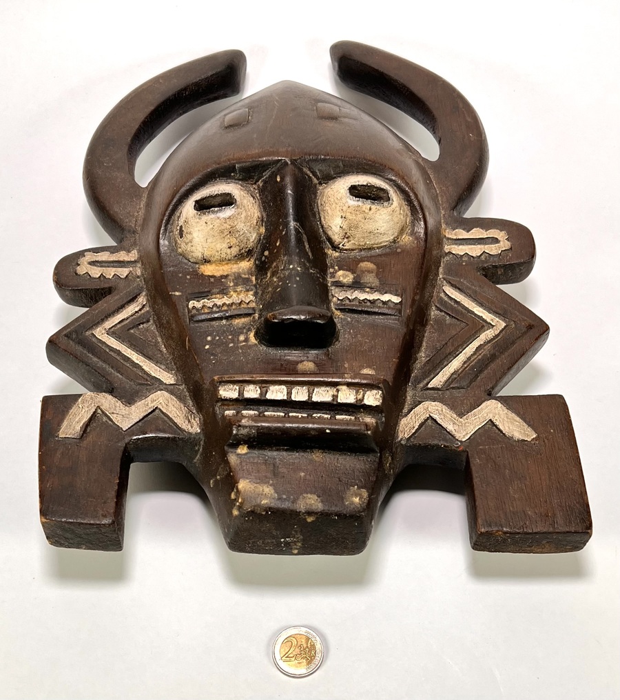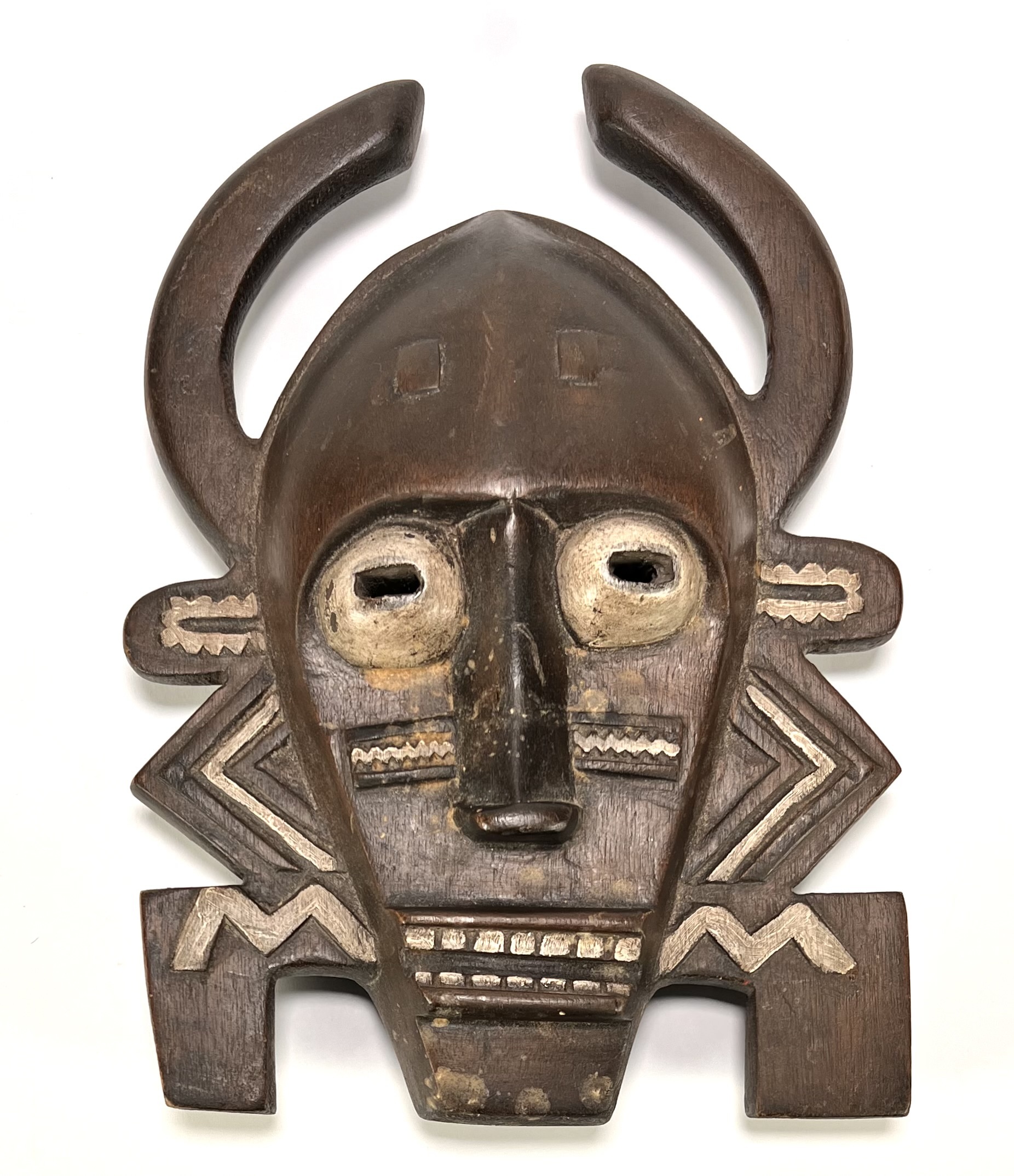 West-Afrikaans wandmasker, eind 20e eeuw, gesneden uit hout met wit pigment. Het gelaat is omlijst door hoge naar binnen krullende hoornen, ogen, wangen en kin zijn lineair geaccentueerd. Bezoek onze kijkdagen op 10, 11 en 12 april van 11:00 tot 17:00 uur! |
