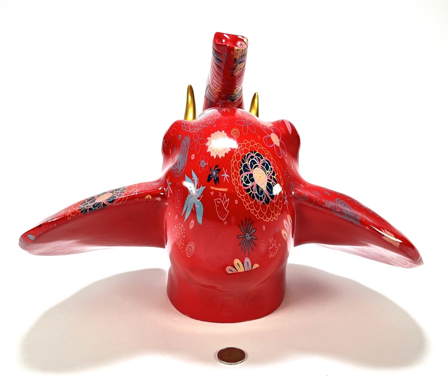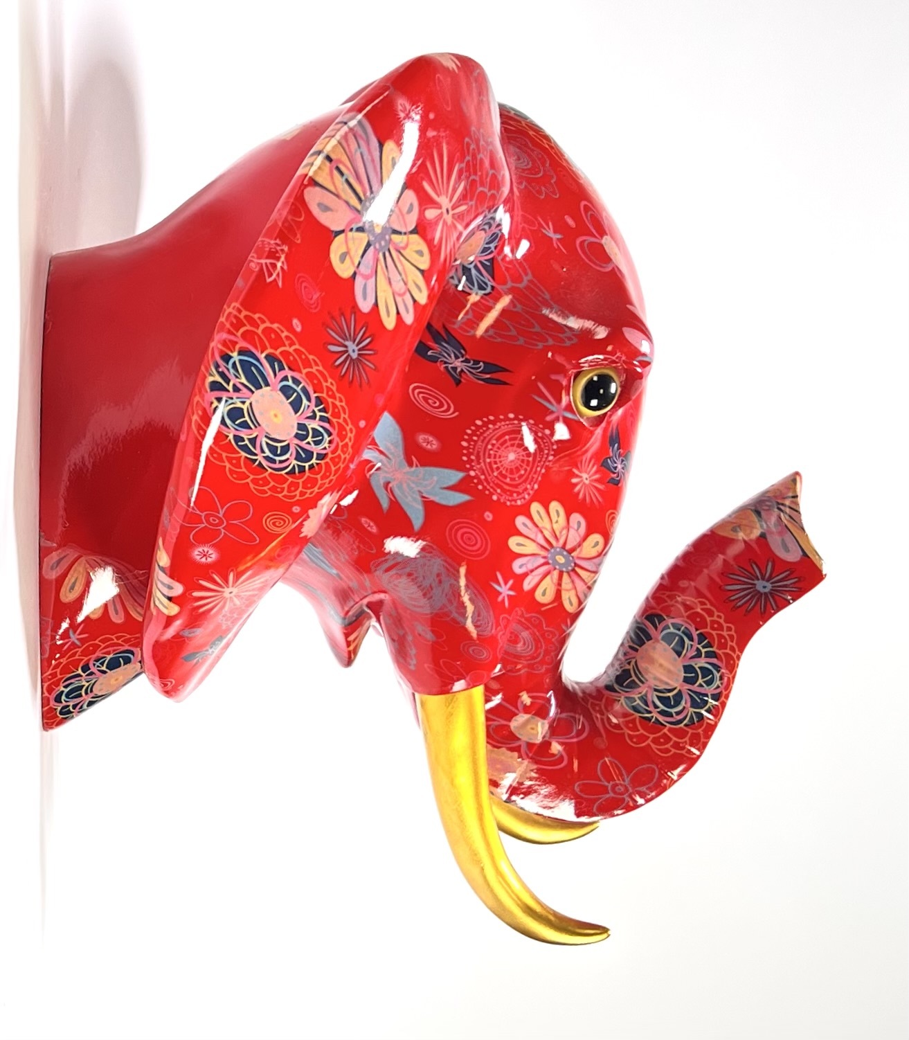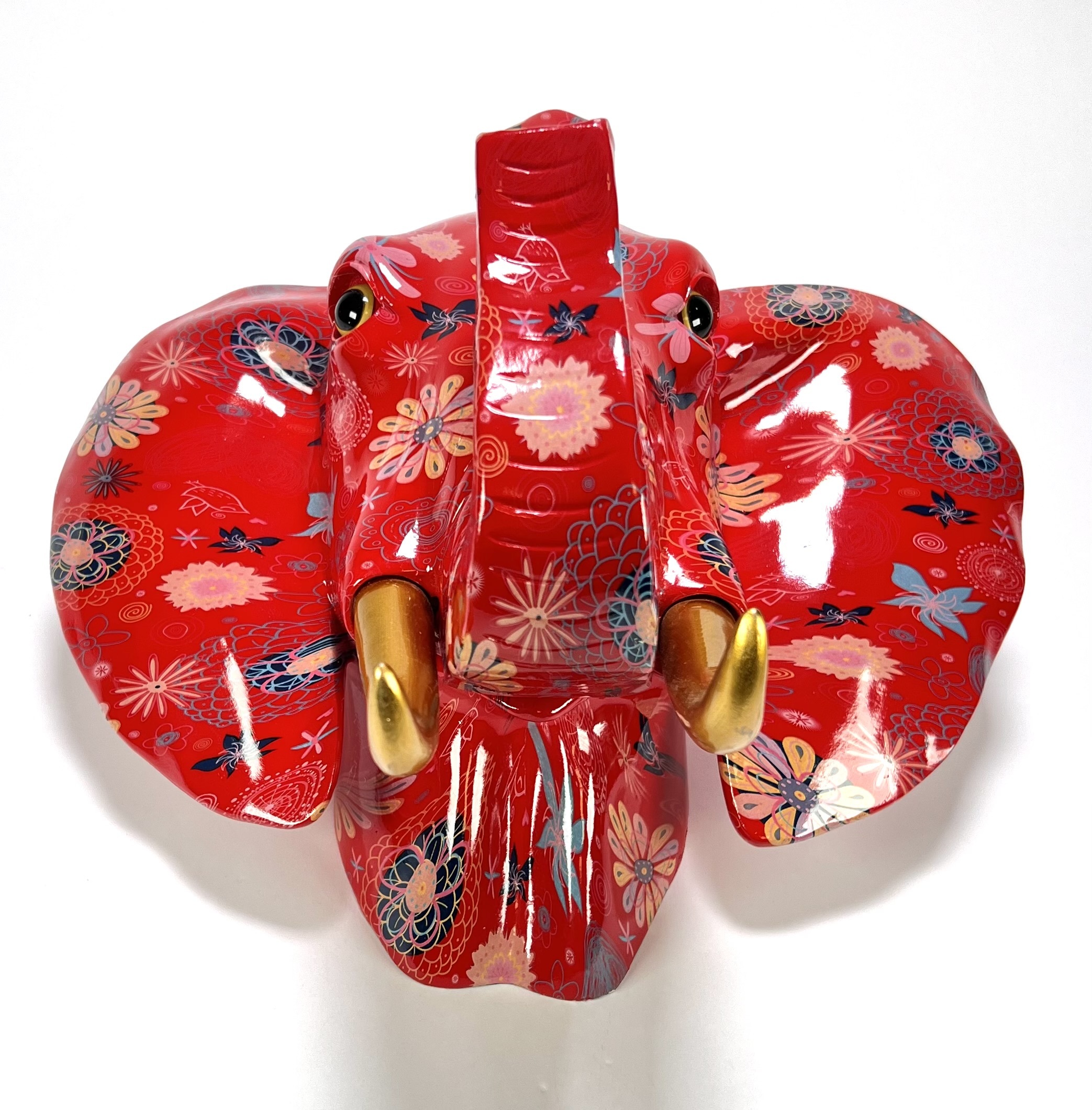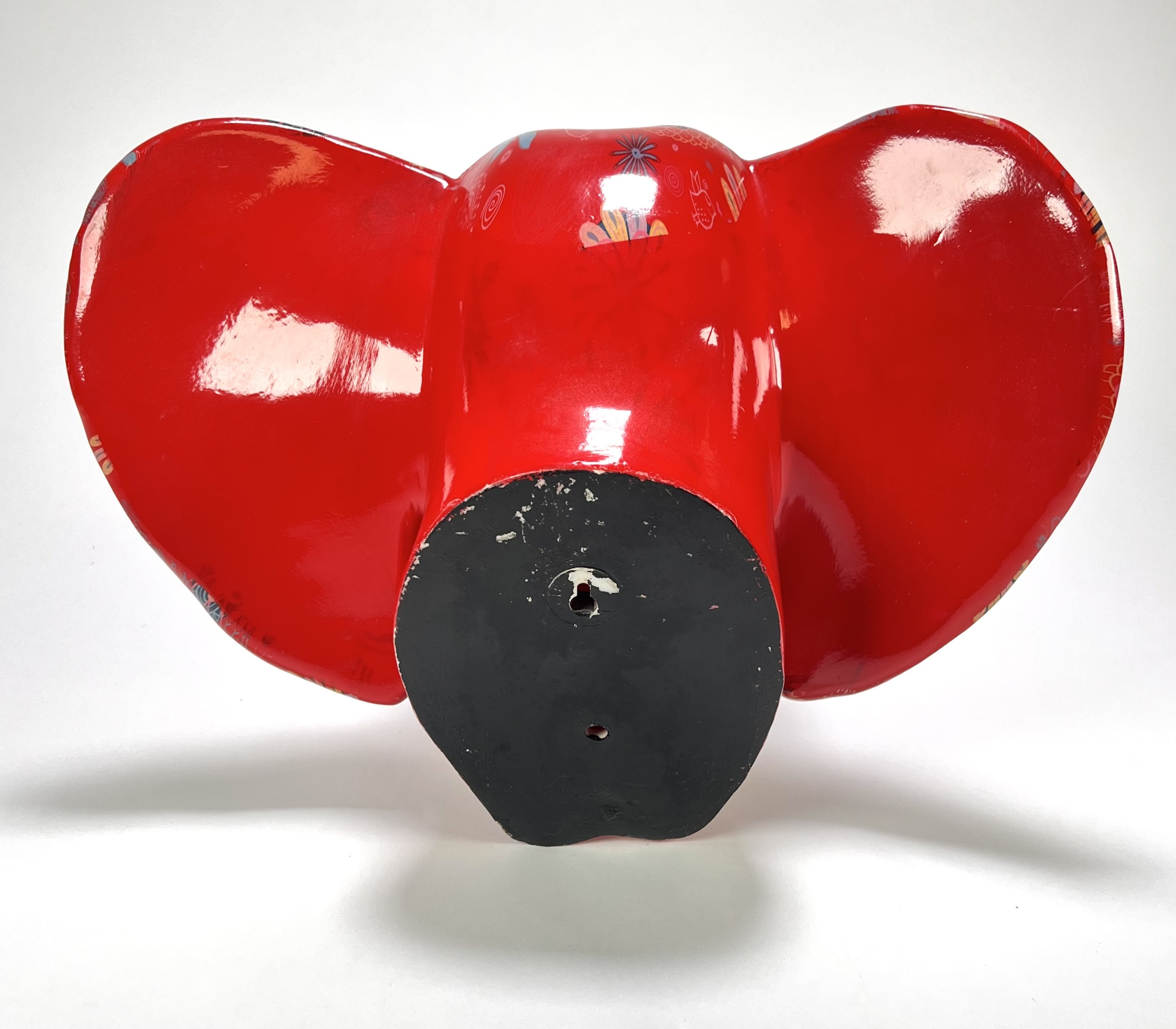 Wandobject in de vorm van een olifantenkop "Jim" in postmoderne stijl, vervaardigd uit kunststof met polychrome decoratie door Pomme Pidou. Het rode oppervlak toont een floraal patroon met gedetailleerde paisley-motieven en cirkelvormige ornamenten, met goudkleurige slagtanden en een glanzende afwerking. De olifant dateert uit de late 20e eeuw en heeft een Europese herkomst. Zeker zijn van deelname? Plaats vanaf 3 april een schriftelijk bod online! |