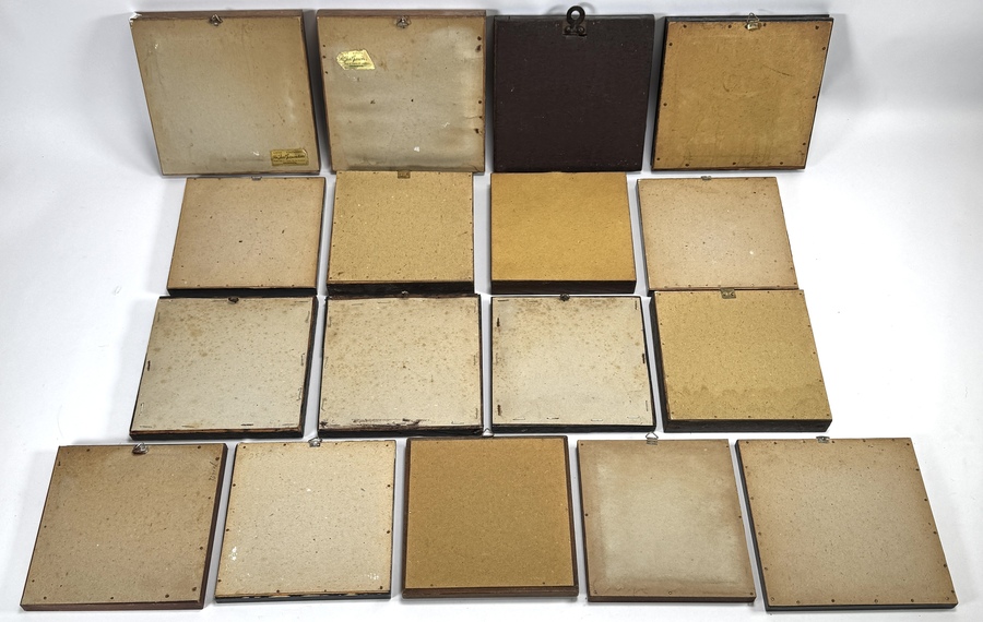 Ingelijste wandtegels uit de barokke periode, vervaardigd uit aardewerk met tinglazuur en handbeschilderd in Delftsblauw en mangaan. De zeventien exemplaren tonen cirkelmedaillons met schepen, molens, dieren, Bijbelse scènes en florale motieven, omlijst door ossenkop- en spinhoekornamenten. De tegels dateren uit de 18e en 19e eeuw en hebben een herkomst in Delft. Wil je direct deelnemen? Plaats vanaf 3 april alvast een schriftelijk bod via onze website! |