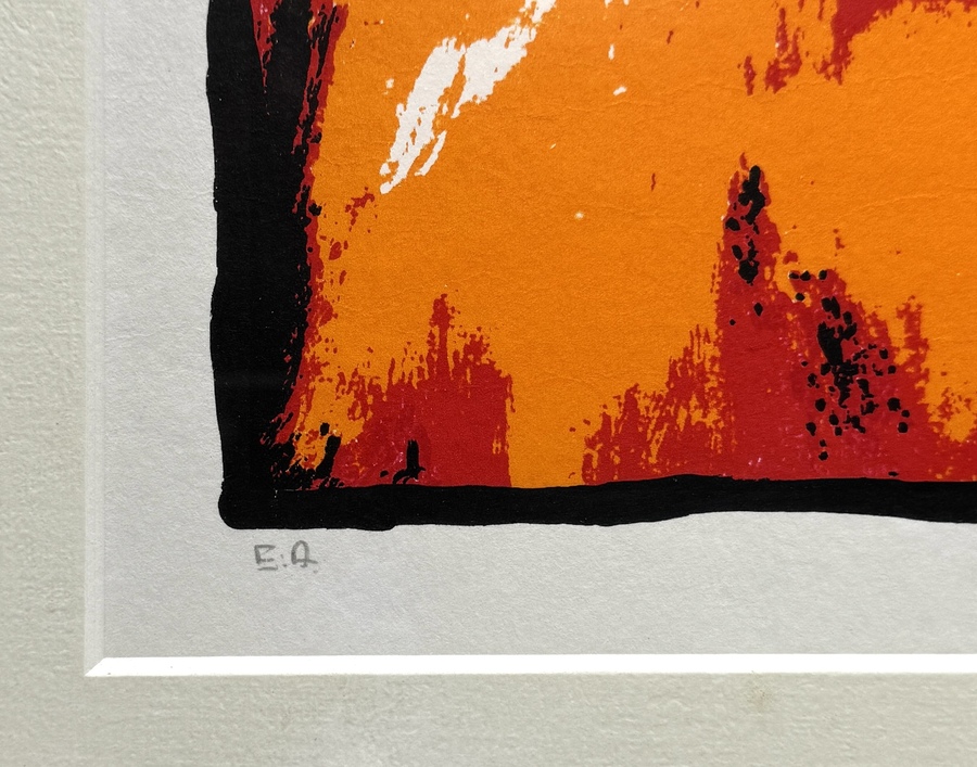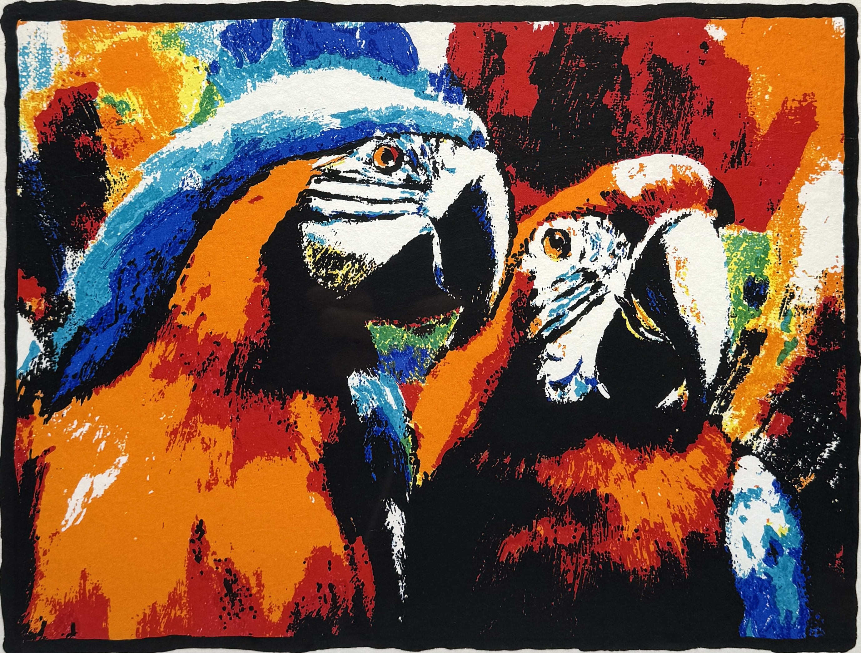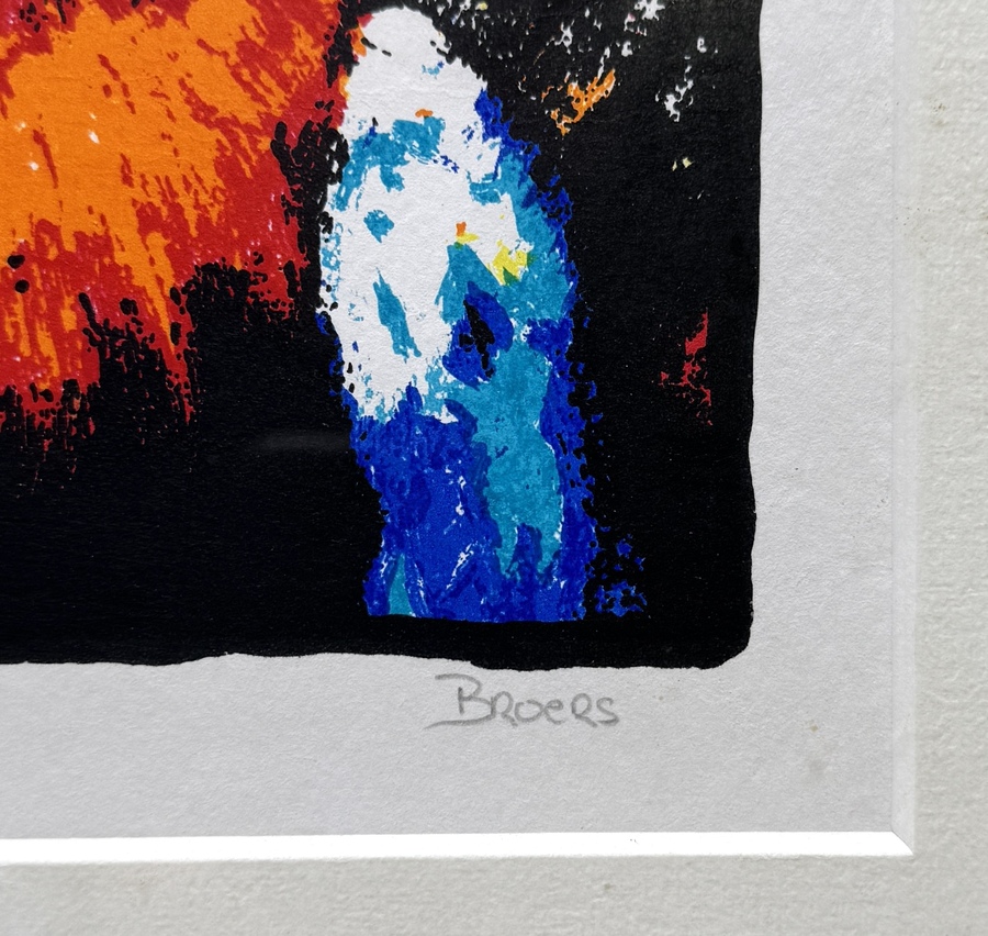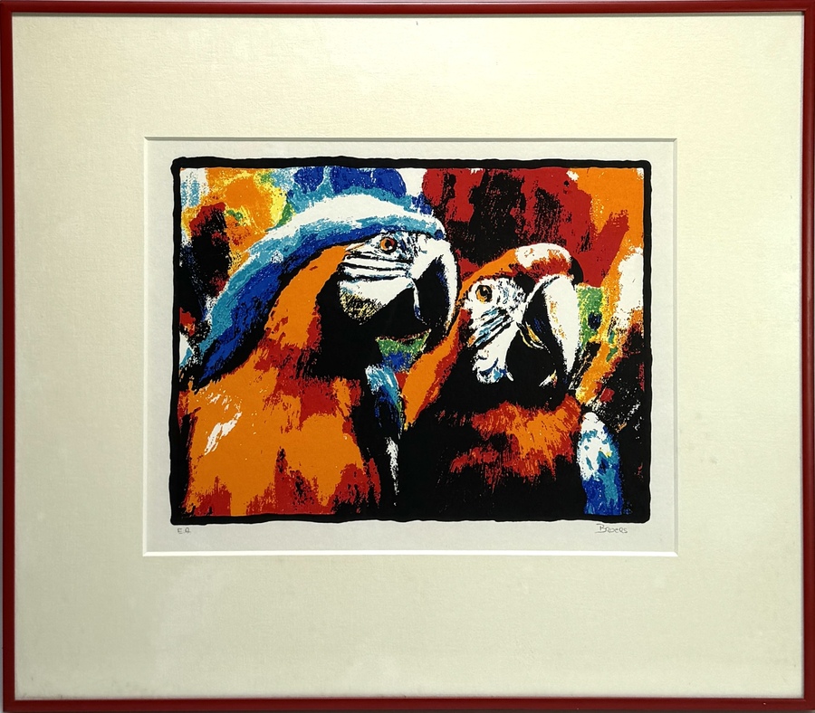 Zeefdruk door Broers (1950) toont twee ara’s in Pop Art, uitgevoerd in zeefdruk op papier. Het palet bestaat uit oranjerood, ultramarijn, turkoois, wit en gele accenten. Linksonder vermelding E.A. (Épreuve d'Artiste) en rechtsonder gesigneerd. Het werk dateert uit de tweede helft 20e eeuw en heeft een Nederlandse herkomst. Deze zeefdruk wacht op een nieuwe eigenaar. Doe mee met de veiling! |
