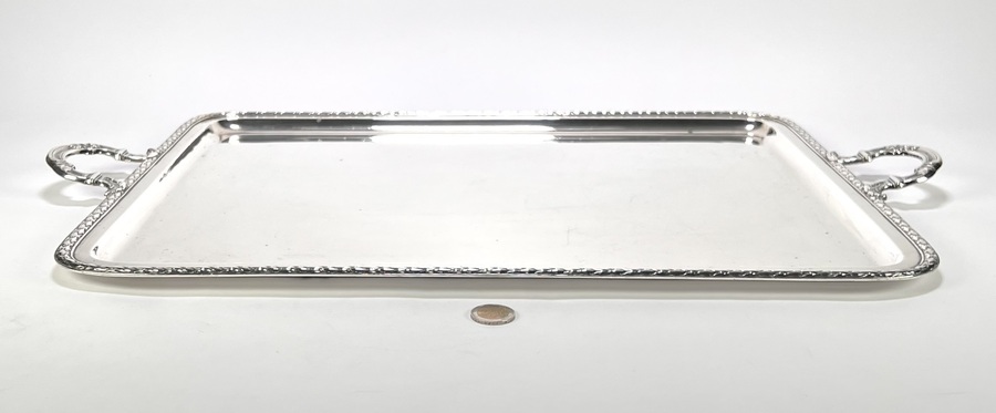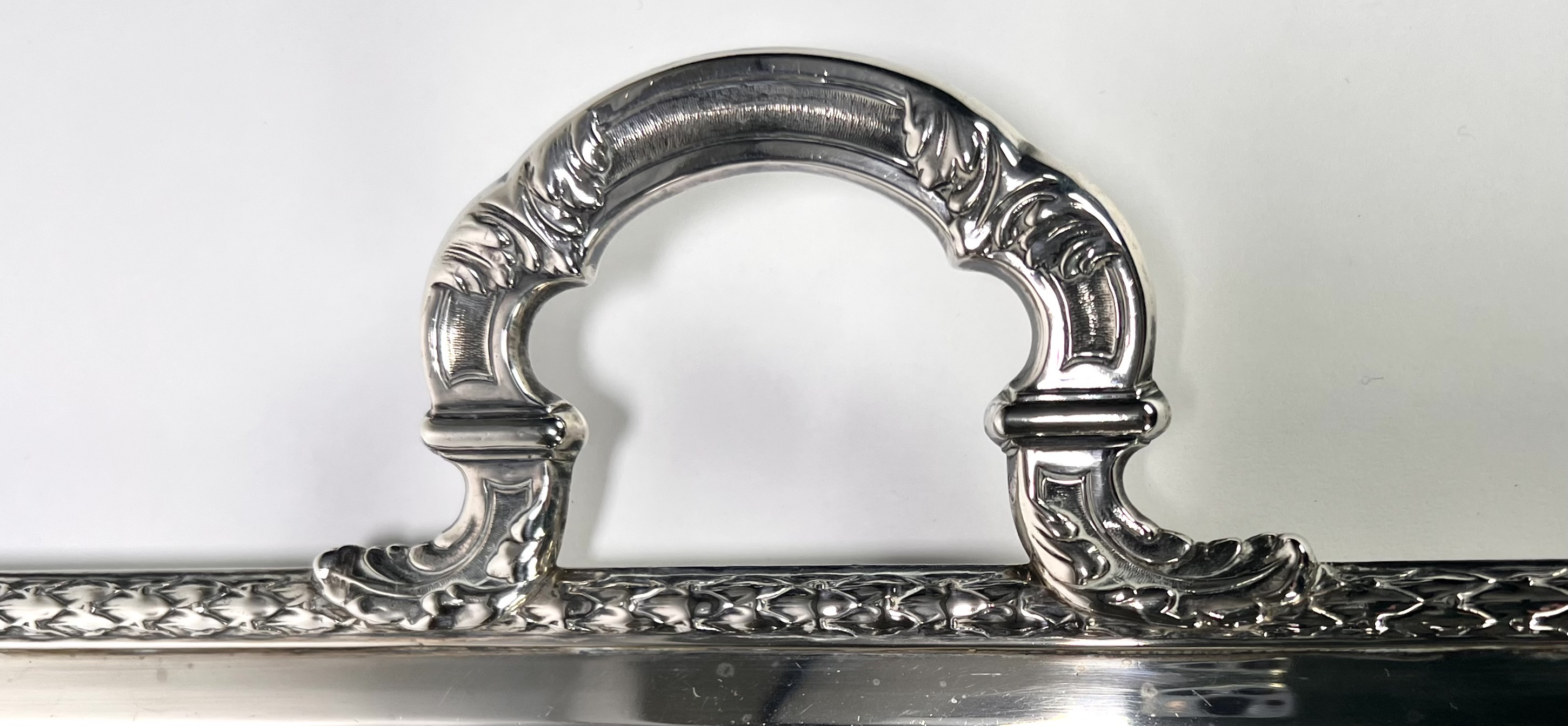 Zilveren dienblad uit Mexico van 916/1000 gehalte, vervaardigd in midden 20e eeuw. Het rechthoekige blad toont een gedreven rand met bladversiering en florale handgrepen met rocaille-accenten. De onderzijde is gemerkt met het gehaltestempel 916/000. Bezoek onze kijkdagen op 10, 11 en 12 april van 11:00 tot 17:00 uur! |