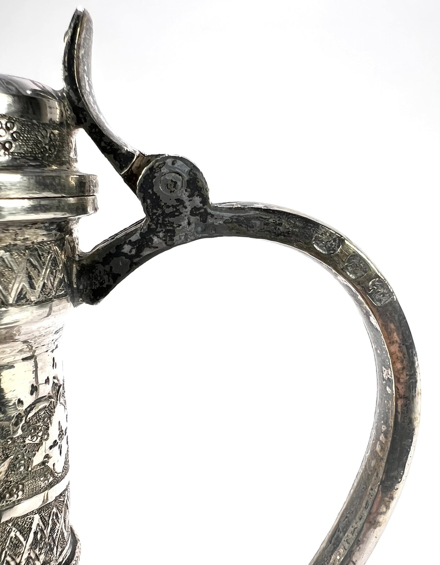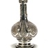 Zilveren theekan met peervormig lichaam, hoge hals en lange gebogen schenktuit, eerste helft 20e eeuw. De wand is gedreven en geciseleerd met florale cartouches, rankwerk en bandornament, doorlopend op hals en deksel. Het handvat is voorzien van meerdere keurtekens. Herkomst Perzië (Iran). Registreer nu en bied eenvoudig online mee op deze theekan! |