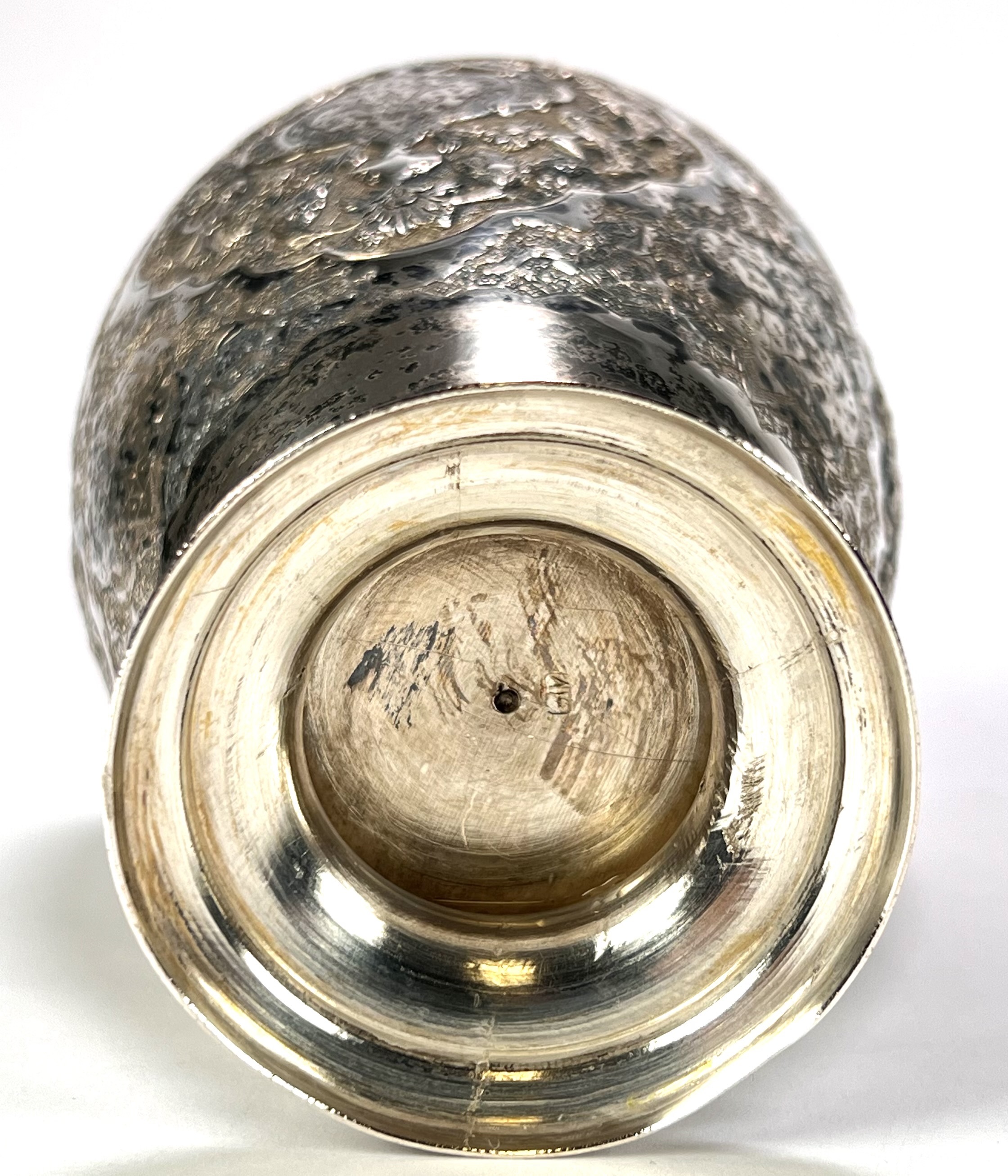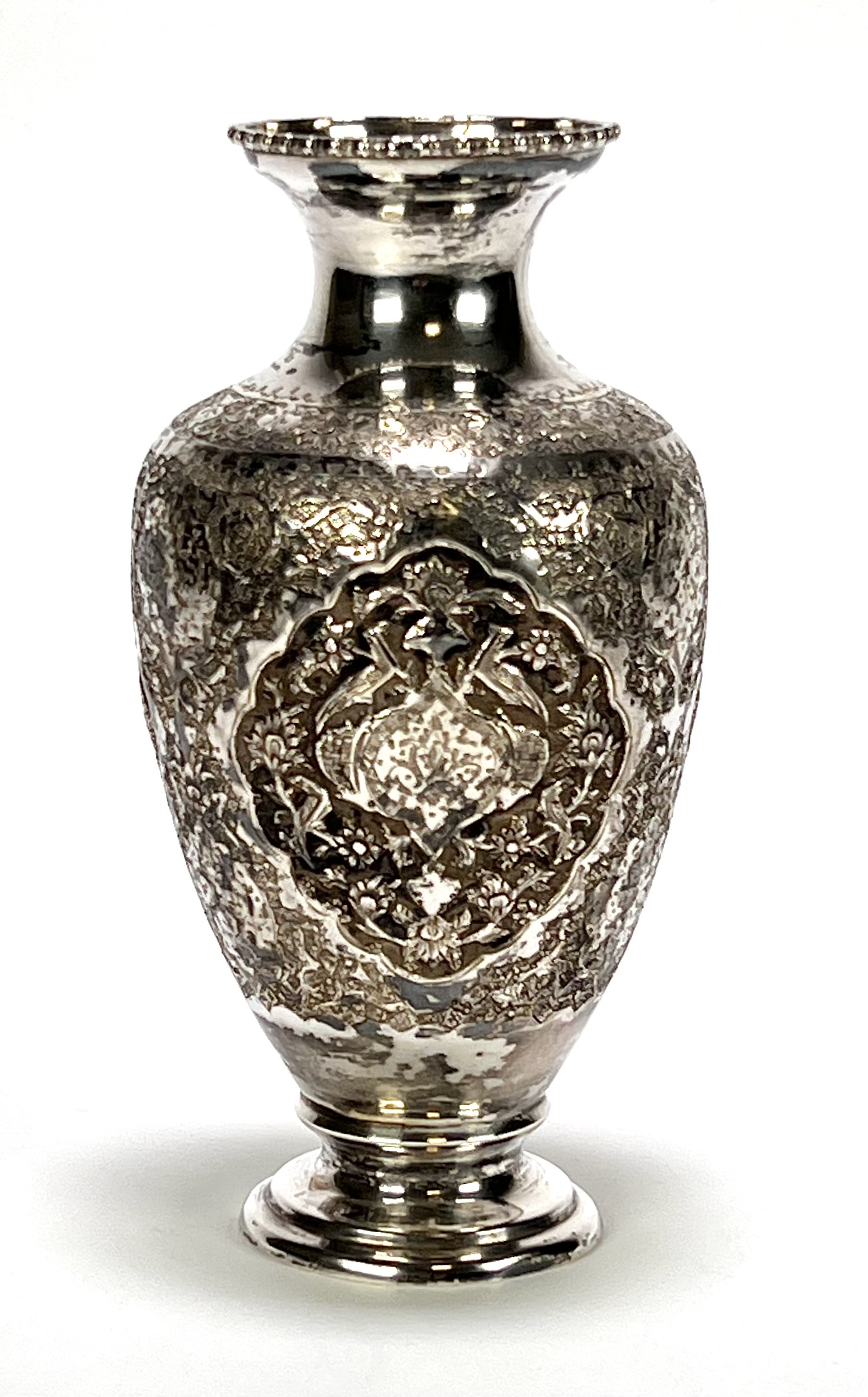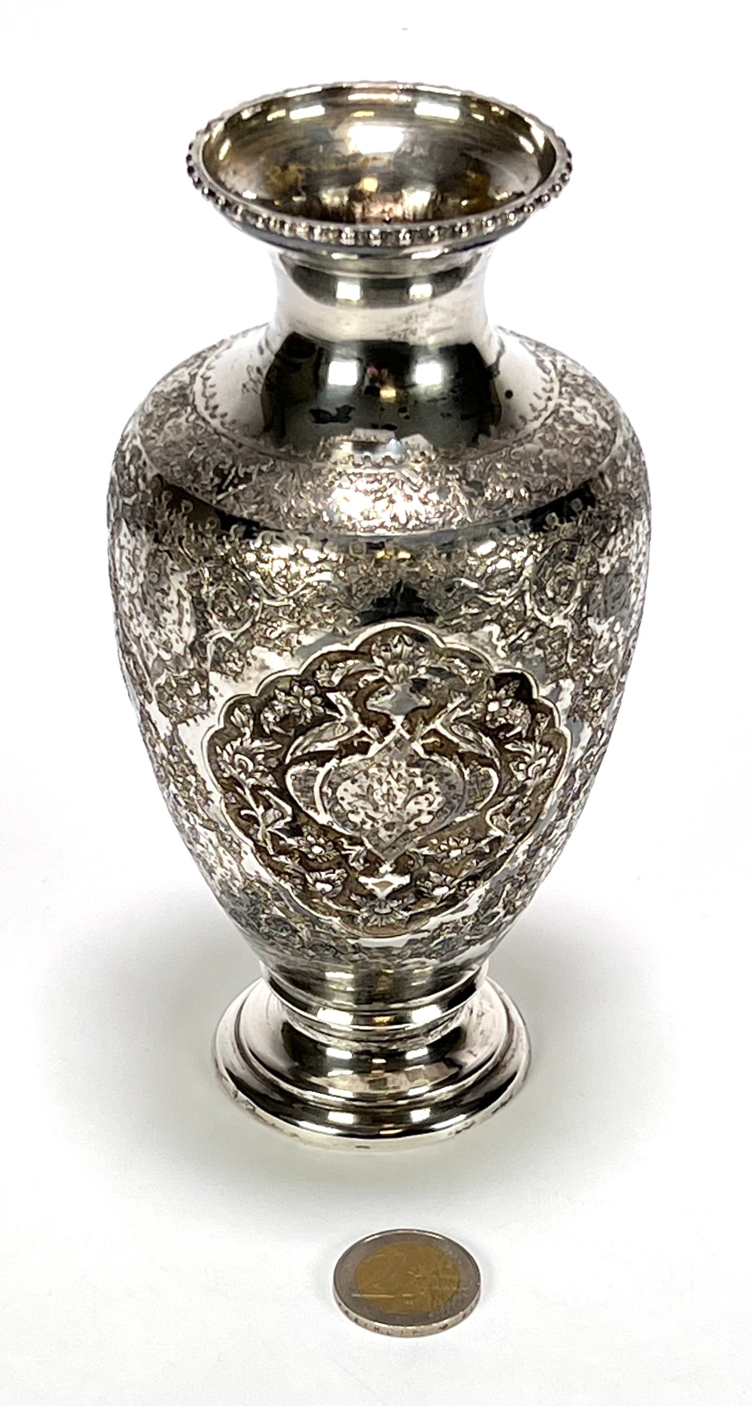 Zilveren 800/1000 gehalte vaas, circa 1950, vervaardigd uit Perzisch zilver. De balustervormige vaas toont dens gegraveerde Ghalam-zani decoraties met centrale medaillons waarin vogelmotieven en florale ornamentiek zijn verwerkt. De onderzijde is voorzien van Perzische keurmerk. Het object heeft een herkomst in Isfahan, Iran, en vertoont een rijkelijk geciseleerde afwerking op een geprofileerde voet. Kom langs tijdens de kijkdagen (10 t/m 12 april) en ontdek deze vaas zelf! |