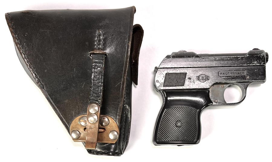 Startpistool van B.B.M., vervaardigd uit gietmetaal met zwart kunststof greepplaten en bijpassende lederen holster met messing en stalen beslag. Gemerkt op de slede met “B.B.M.” en “MADE IN ITALY”. Het compacte zakmodel met korte loop en vlakke slede dateert uit de jaren '70 en heeft een Italiaanse herkomst. Het startpistool is onklaar gemaakt.