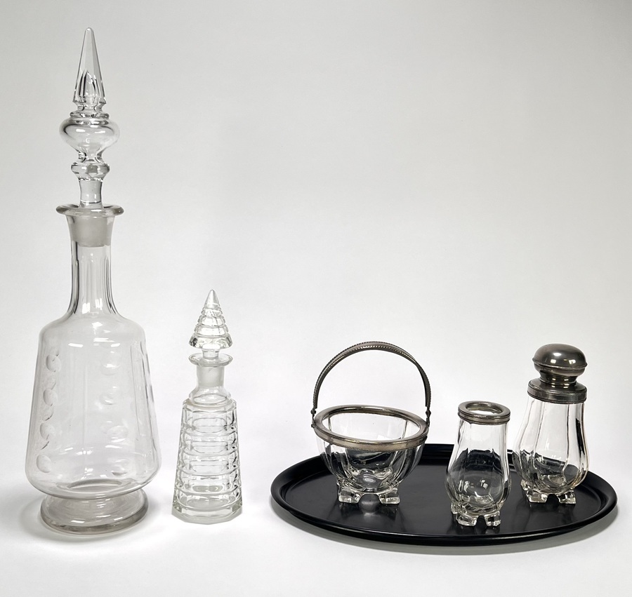 Servies uit de Art Deco periode, vervaardigd uit geslepen kristalglas en bakeliet. Het kavel omvat twee karaffen, een suikerpot, kandijschaaltje, lepelvaasje en een zwart bakeliet dienblad. Het glaswerk vertoont geometrische slijppatronen. Datering circa 1930 en een Europese herkomst.