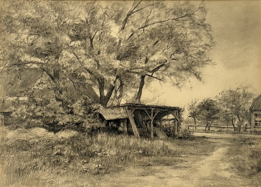 Tekening door Harm Nanninga (1906–1994) van een landelijk landschap met schuur in academisch realisme, uitgevoerd in houtskool op papier. De voorstelling vertoont een gedetailleerde compositie van bomen met een zandpad. Onduidelijk gesigneerd linksonder en gedateerd 1972. Deze tekening heeft een Nederlandse herkomst, in een goudkleurige lijst met een crème witte passe-partout.