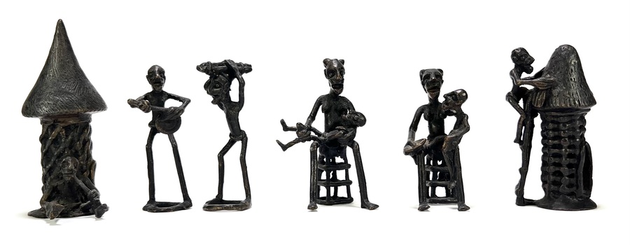 Centraal-Afrikaans figuratieve beelden uit de tweede helft 20e eeuw, uitgevoerd in gegoten messing volgens cire perdue-techniek. Het convoluut omvat langgerekte staande en zittende figuren op ringvormige bases naast cilindrische torenvormen met conisch dak.