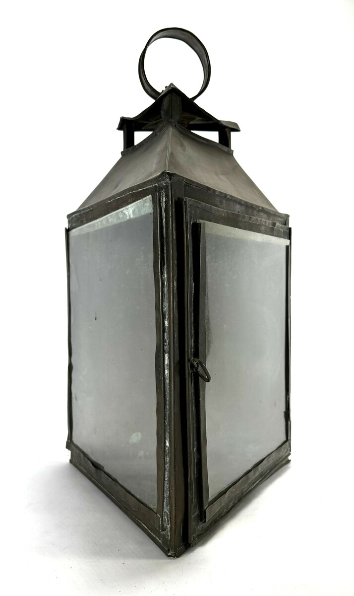 Lantaarn in utilitaire stijl, vervaardigd uit koper en glas met gesoldeerde plaatconstructie. Het rechthoekige corpus heeft een gesloten achterwand, scharnierende frontdeur en licht oplopende kap onder een opengewerkte ventilatiezone met ronde draagring. Datering circa 1900.