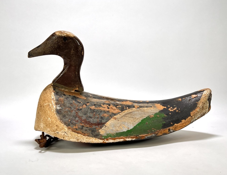 Lokeend uit de 19e eeuw, vervaardigd uit hout met handgesneden details. Het handbeschilderde oppervlak vertoont een polychromie in zwarte, groene en witte tinten. Aan de onderzijde is een ijzeren ketting met ankerpunt bevestigd voor gebruik in het water. De lokvogel dateert uit de 19e eeuw en heeft een Engelse herkomst.
